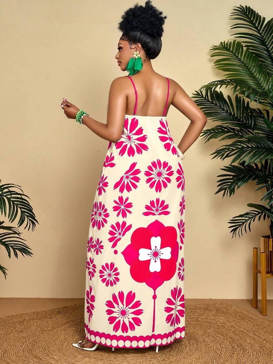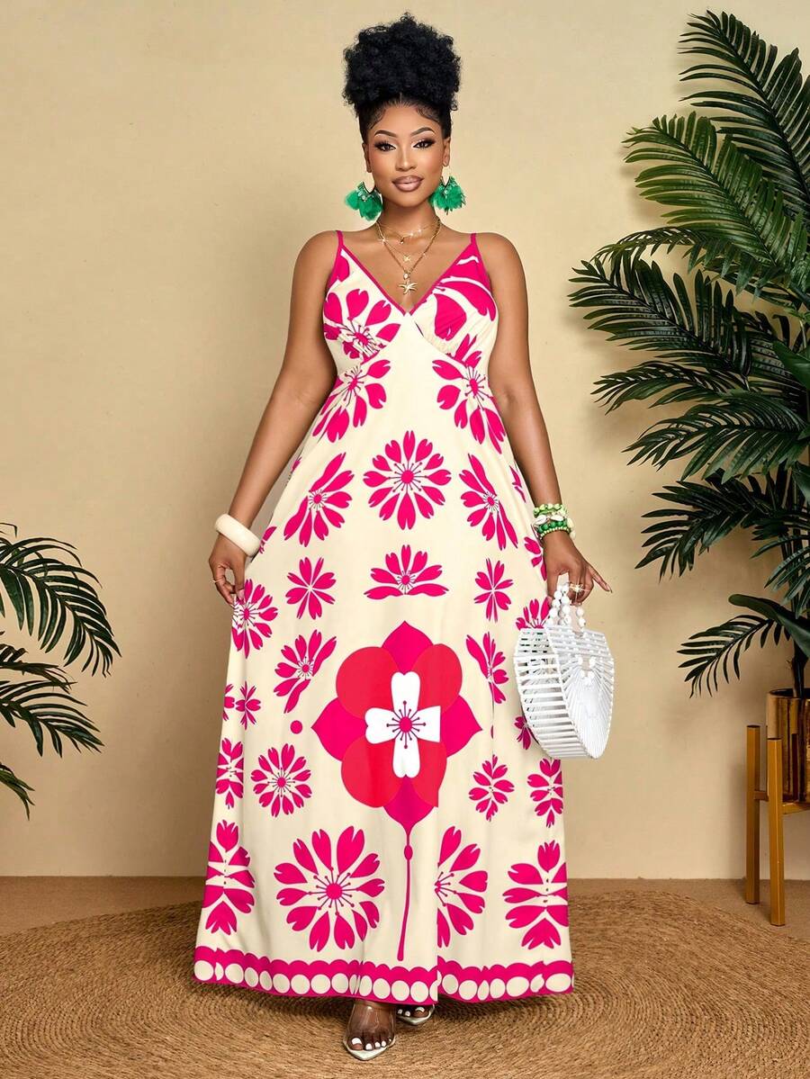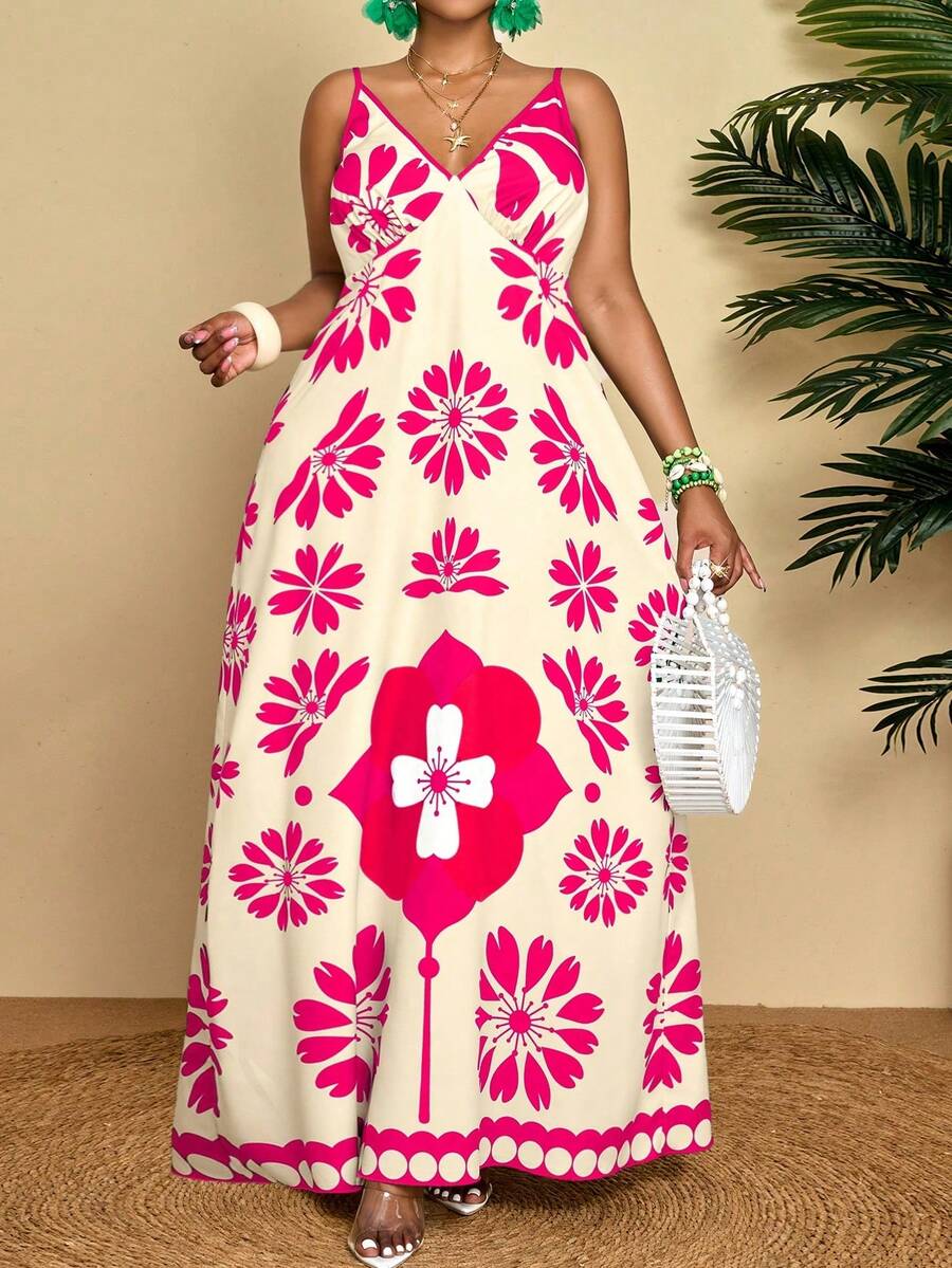 Vestido de verano con escote en v y espalda abierta con estampado floral, talla grande, para mujer. estilo tropical, casual de vacaciones, fresco y soleado (estampado aleatorio)