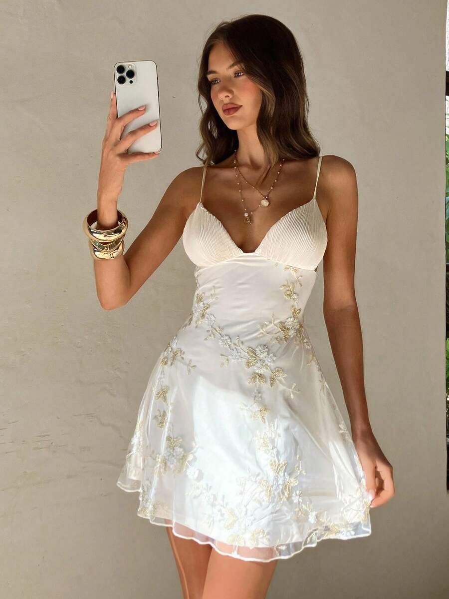 Vestido mini ajustado de linea a de unicolor con copa plisada y bordado elegante y sexy para mujer
