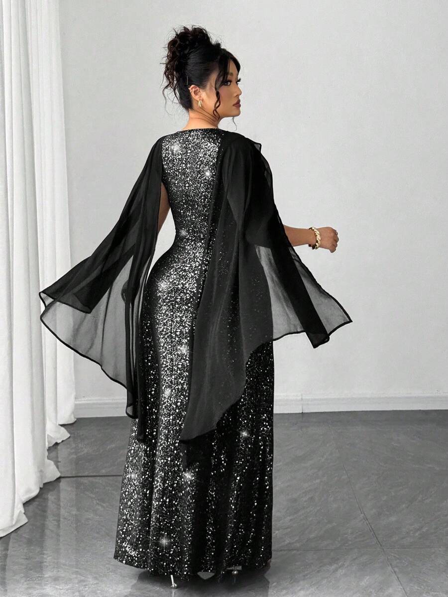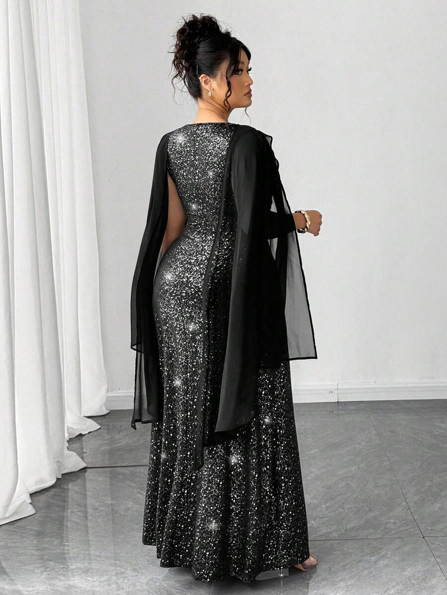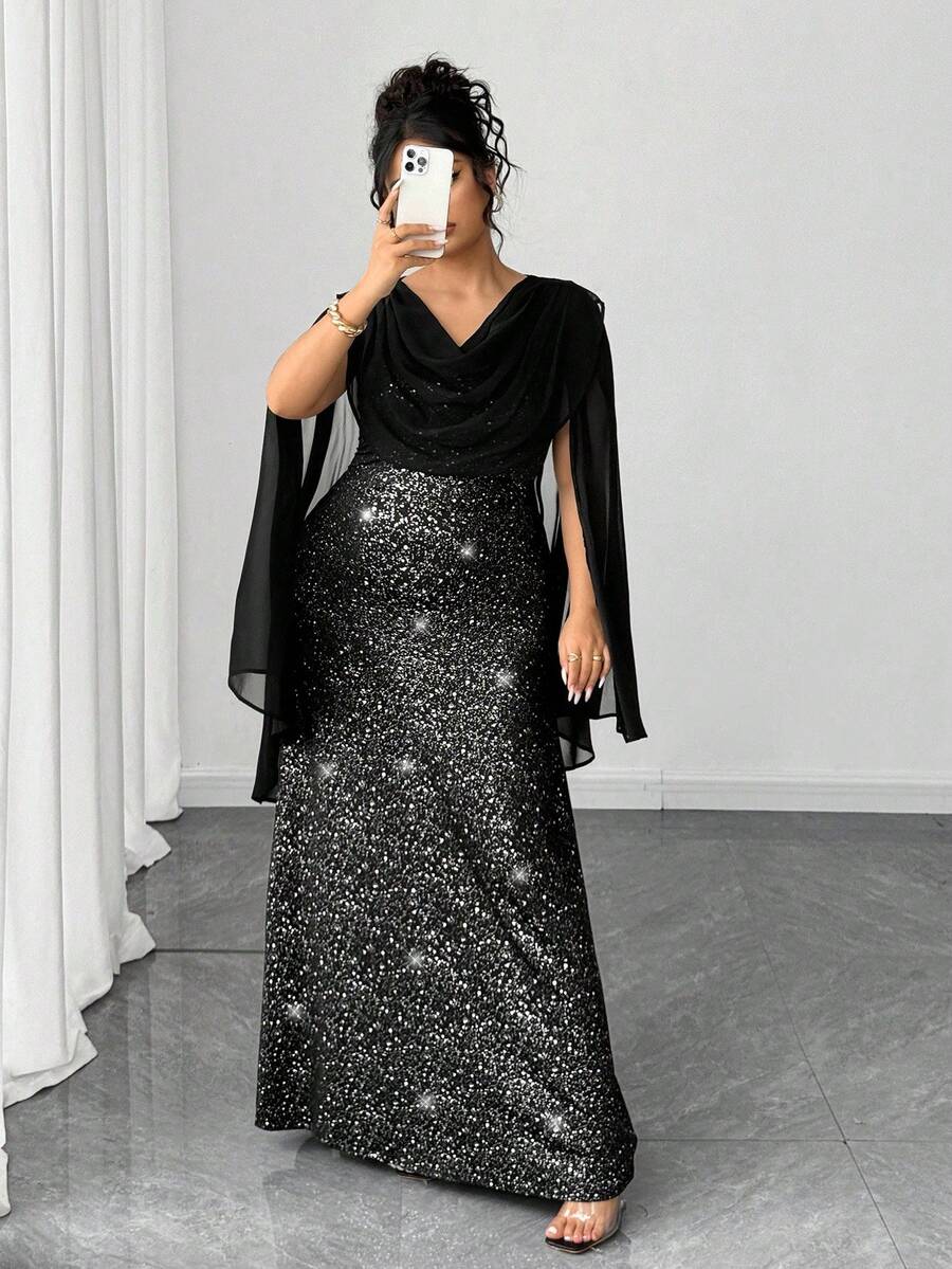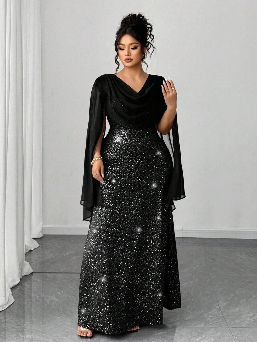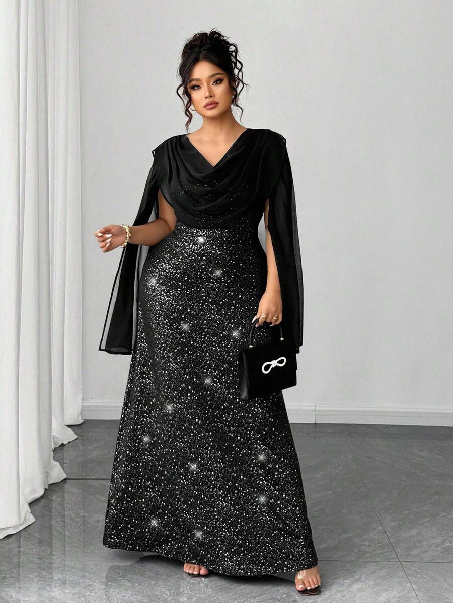 Vestido con cuello drapeado brillante de talla grande, adecuado para fiestas, otono/invierno