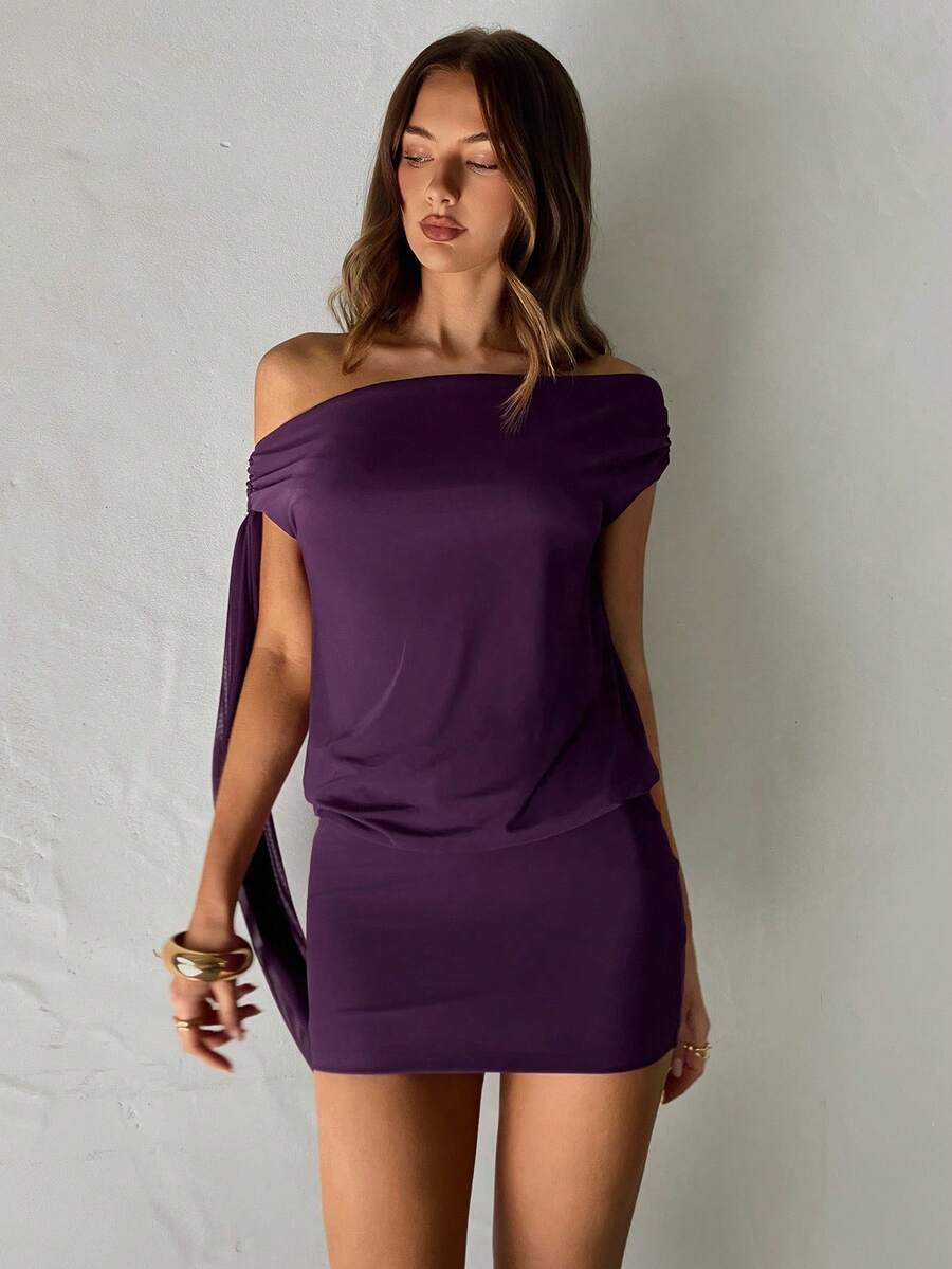 Vestido mini ajustado con hombros descubiertos, espalda descubierta y lazos, elegante para fiesta, cita, cumpleanos, color morado