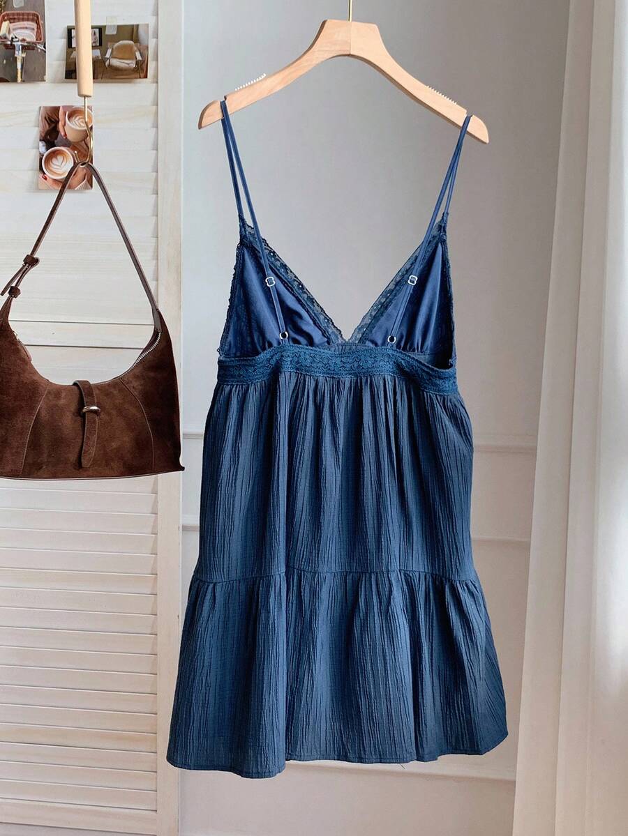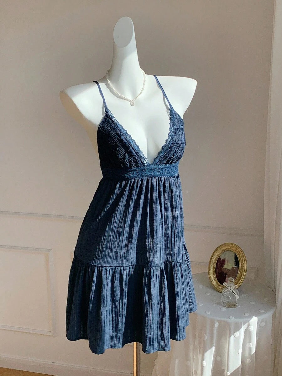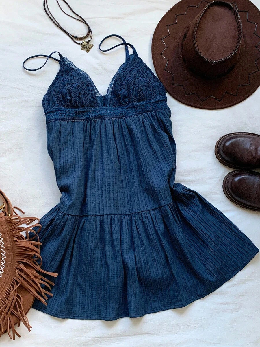 Vestido corto sexy de mujer con tirantes finos, volantes y encaje de contraste en el bajo