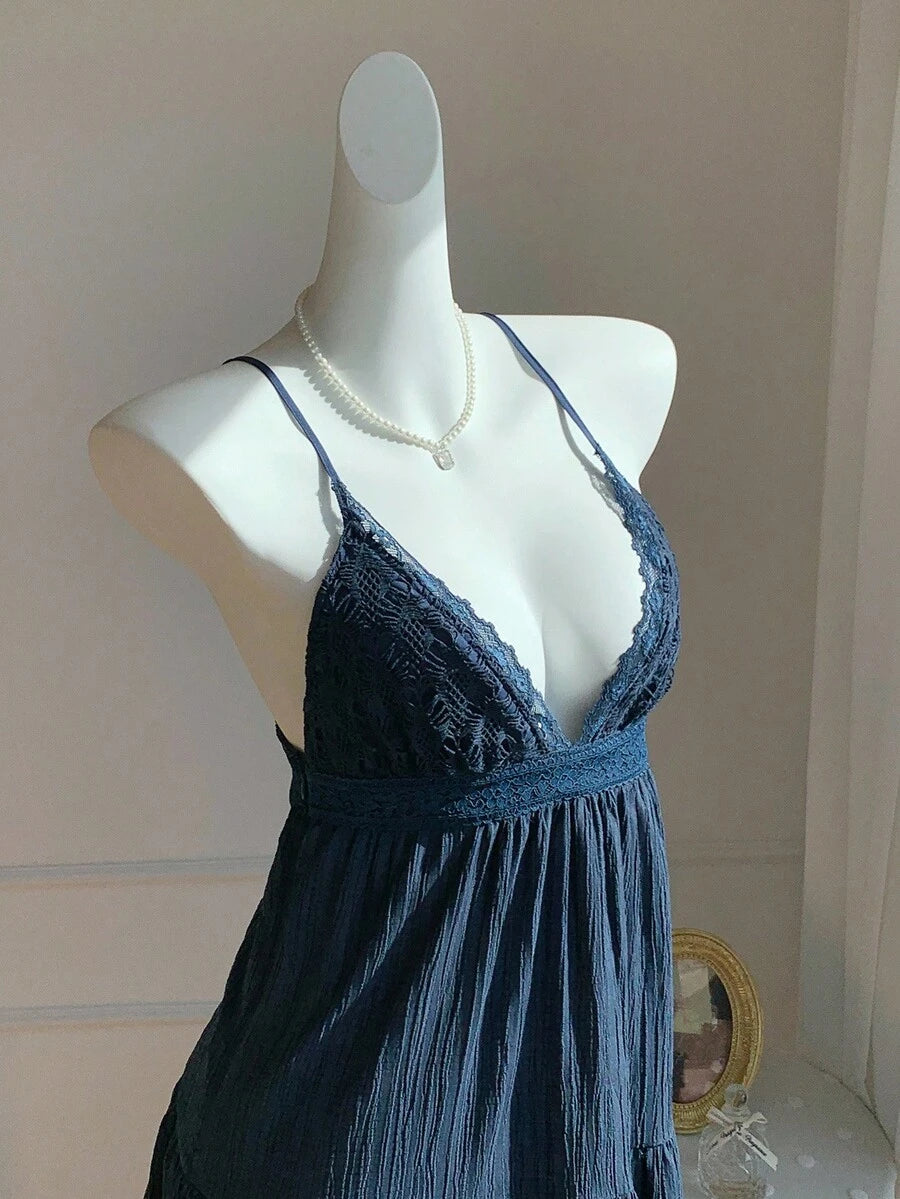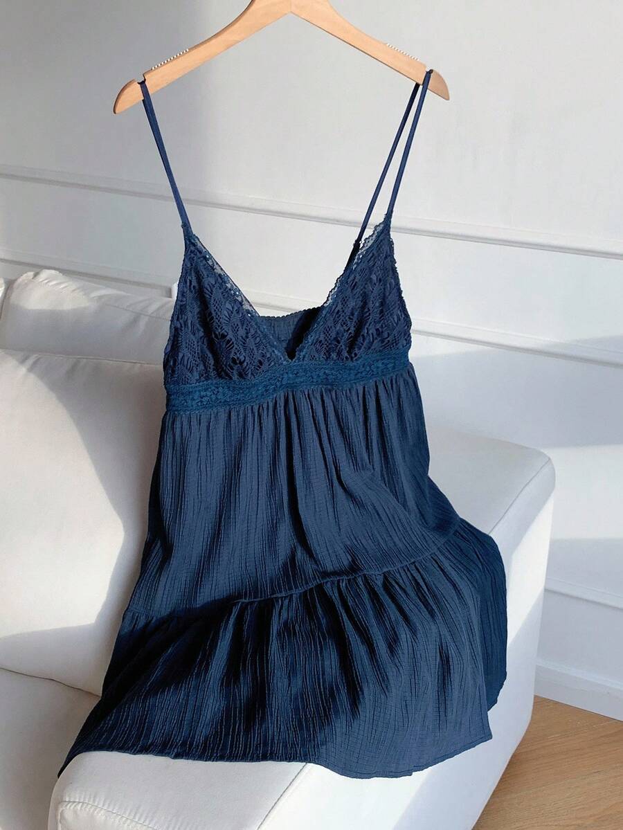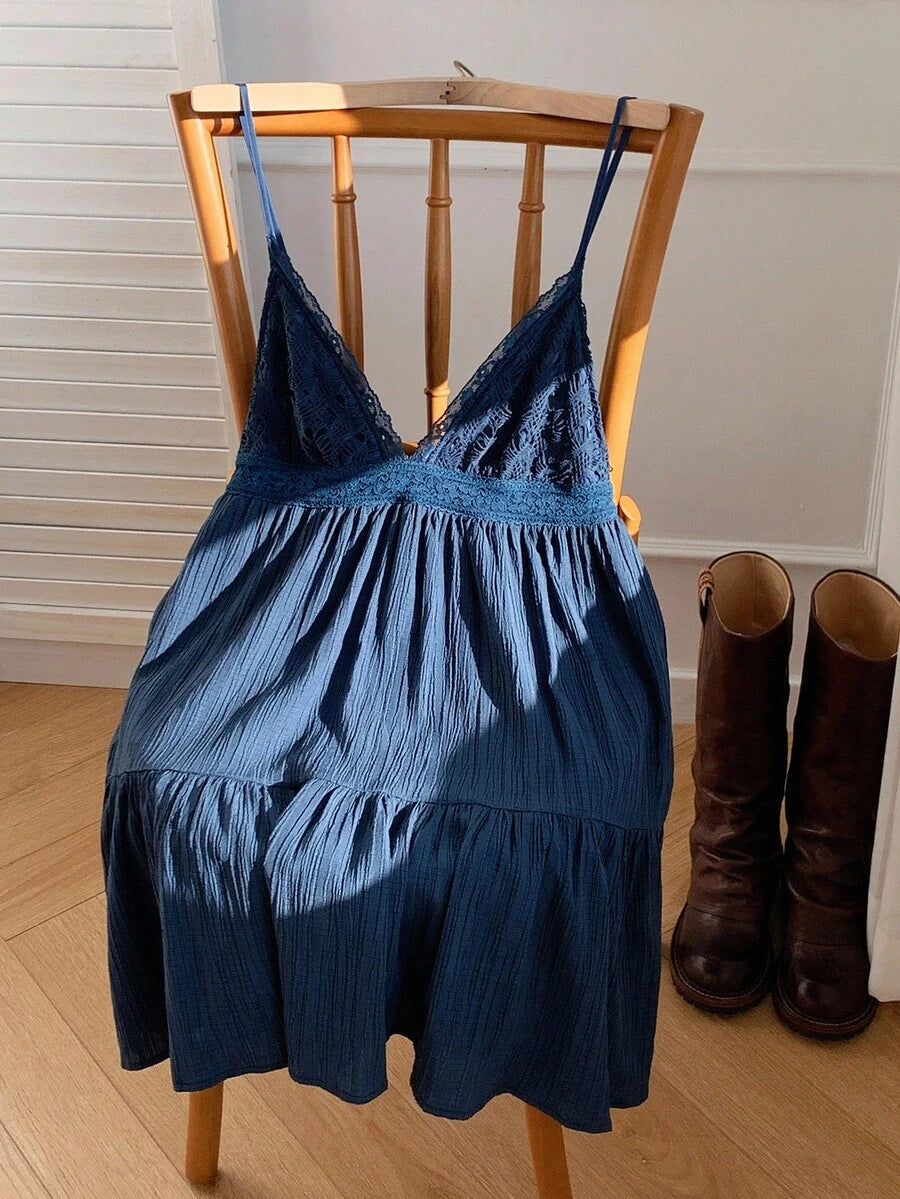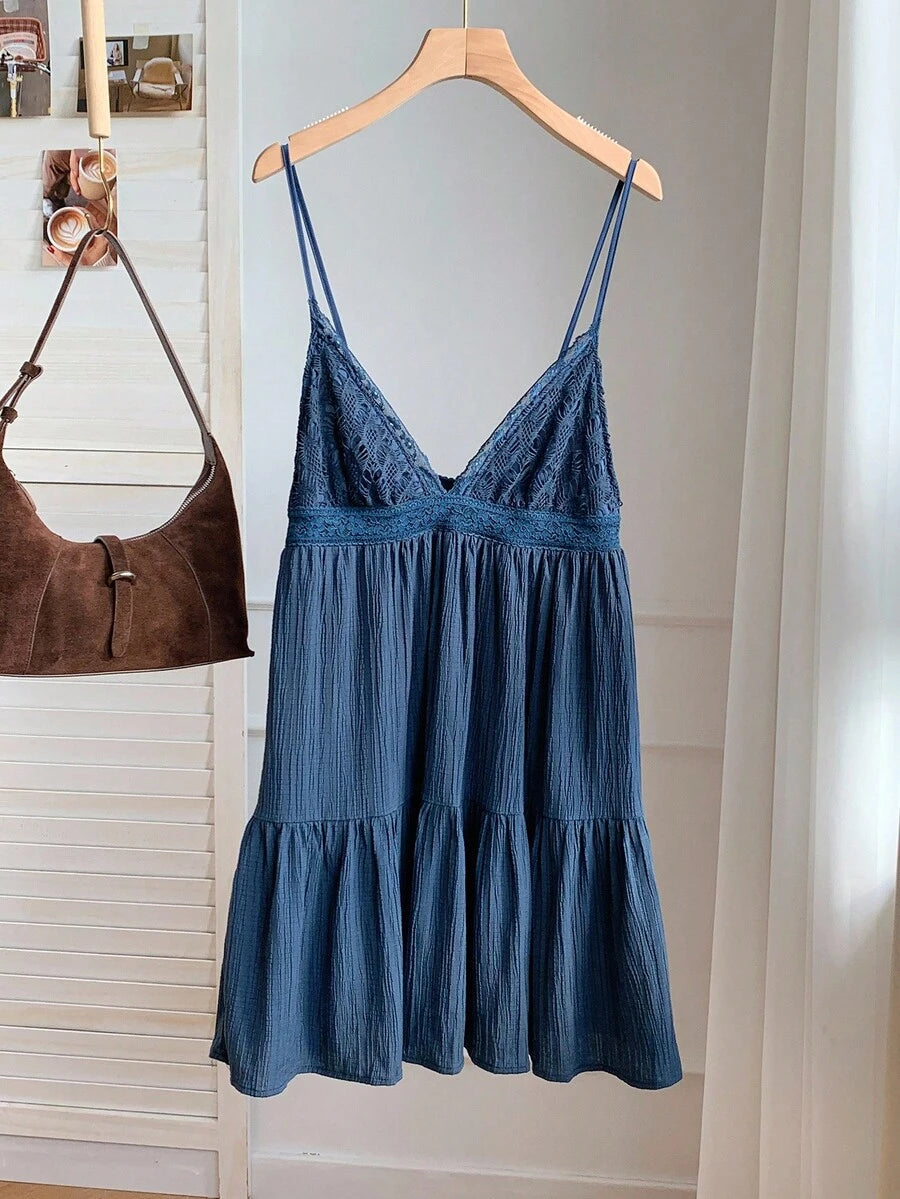 Vestido corto sexy de mujer con tirantes finos, volantes y encaje de contraste en el bajo