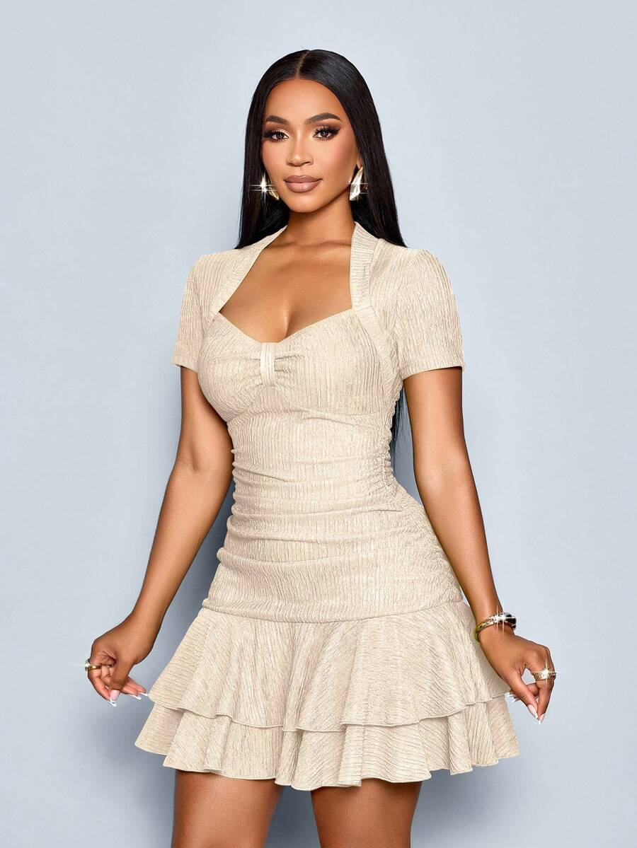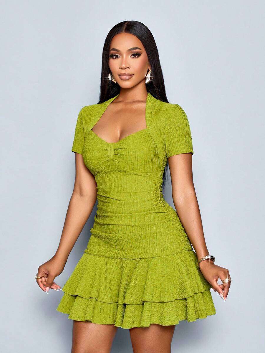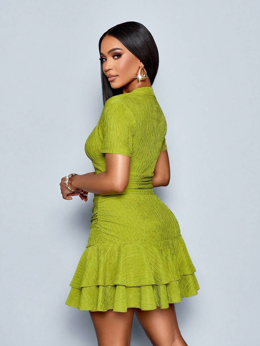 Vestido mini de punto con cuello en v, manga corta, silueta ajustada, volantes dobles y recogido, de estilo basico, elegante y casual para mujer, en color solido, para primavera y verano