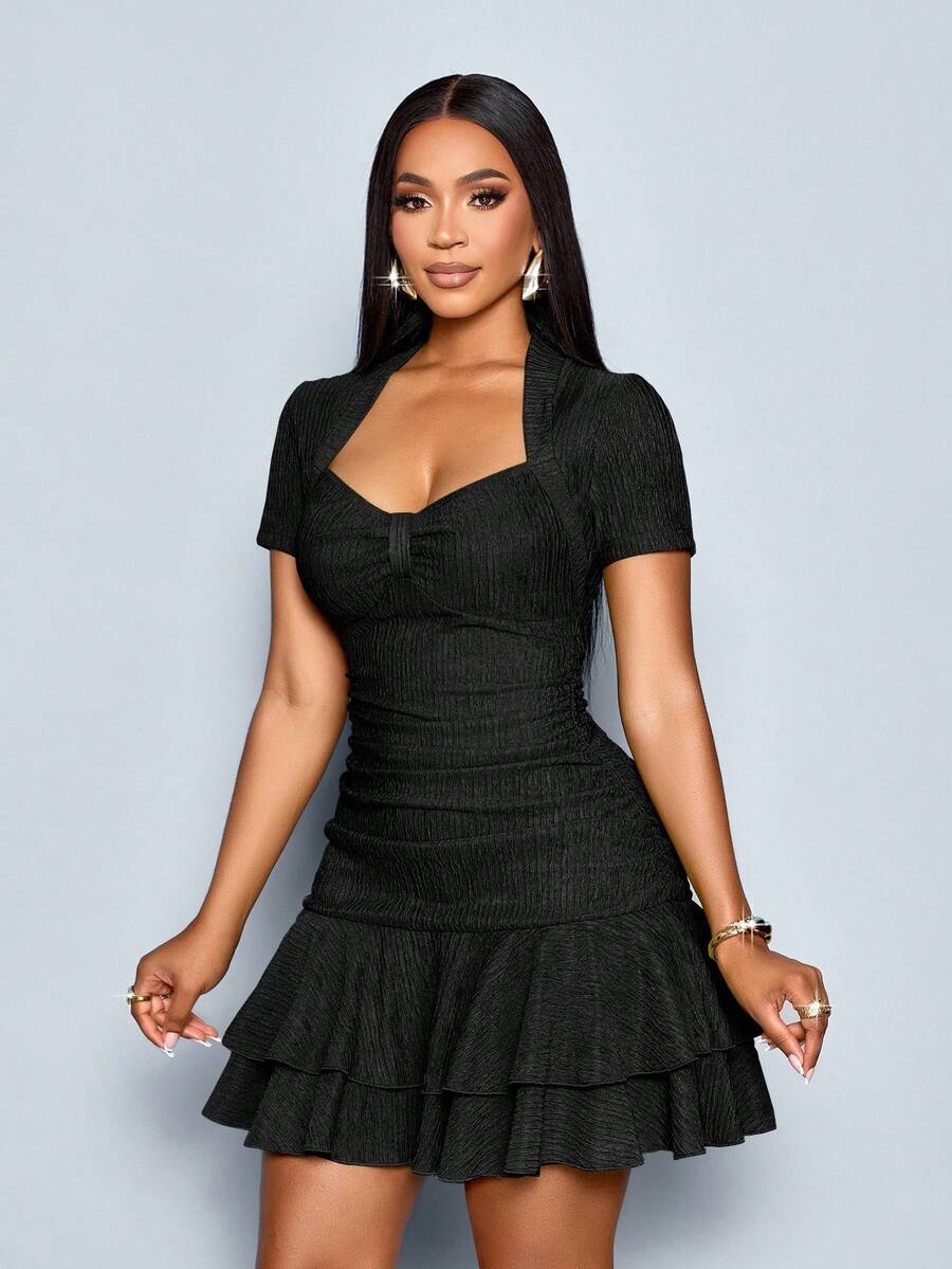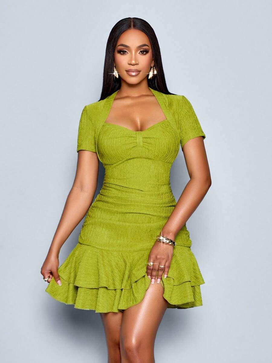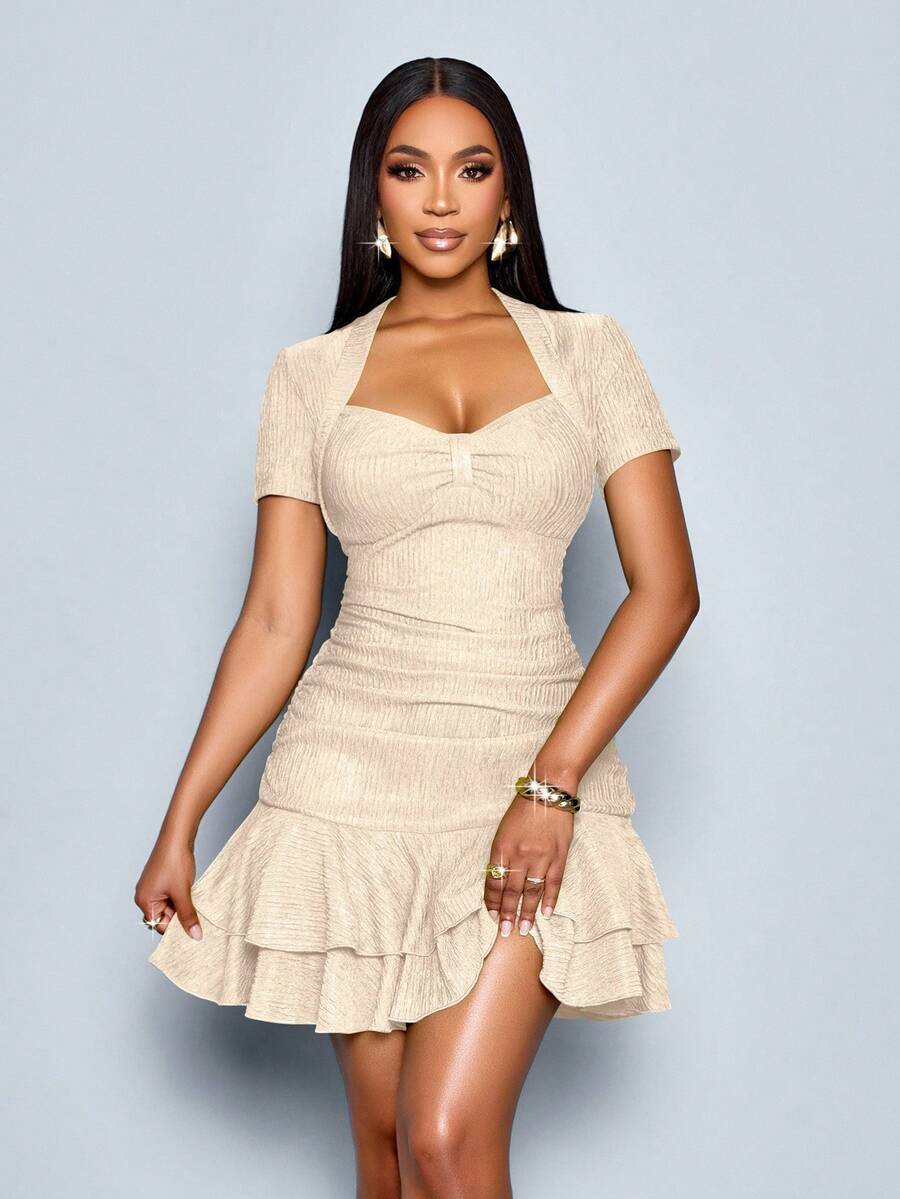 Vestido mini de punto con cuello en v, manga corta, silueta ajustada, volantes dobles y recogido, de estilo basico, elegante y casual para mujer, en color solido, para primavera y verano