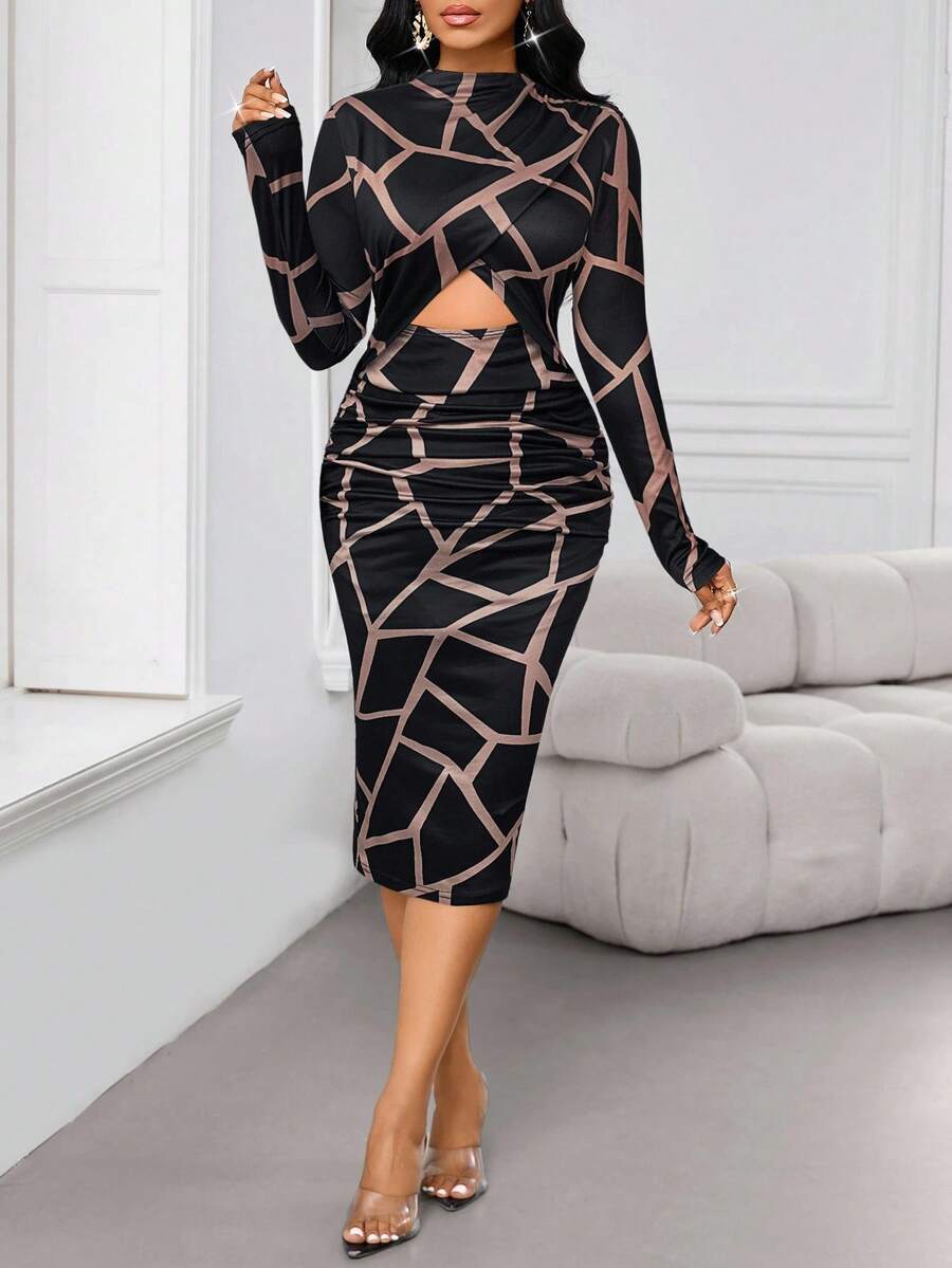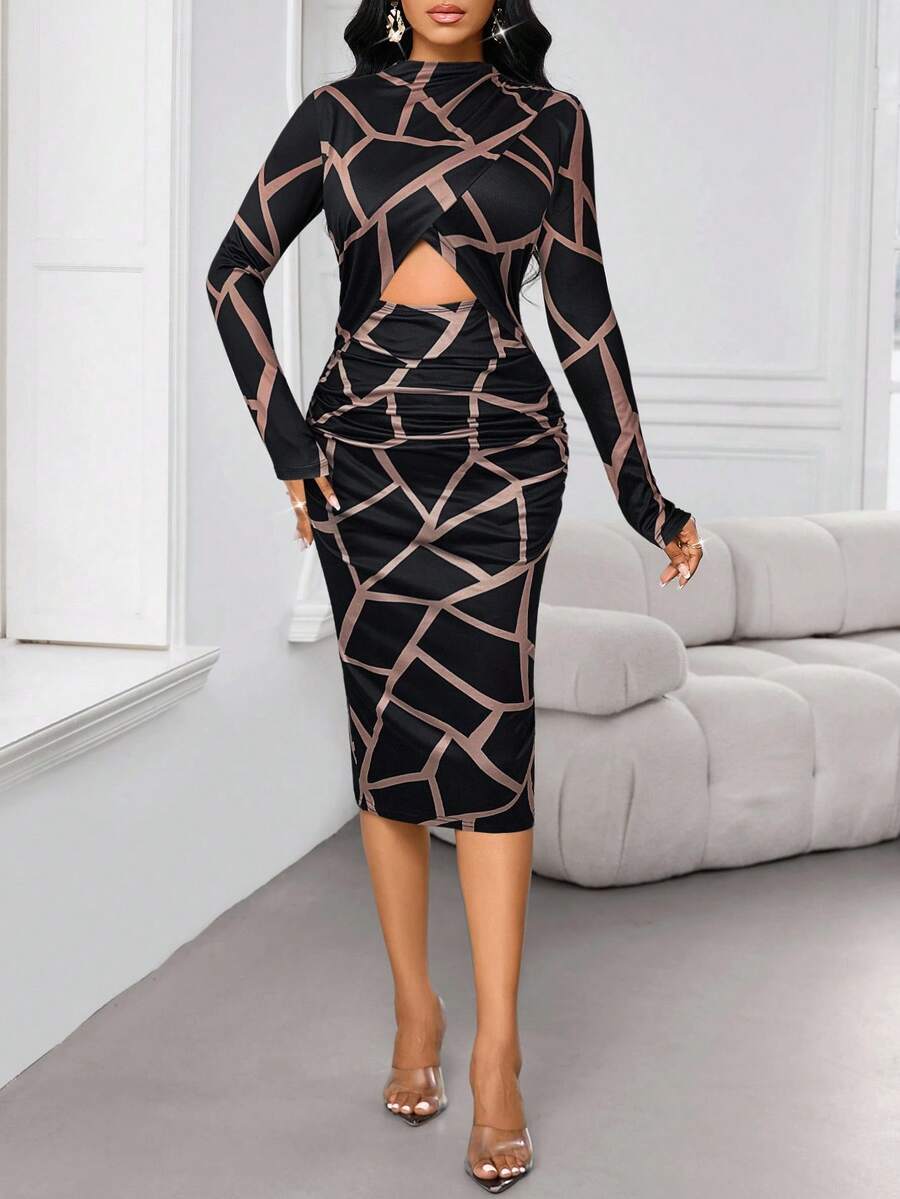Vestido midi elegante de mujer con cuello alto, manga larga, estampado geometrico, corte en la cintura y drapeado ajustado