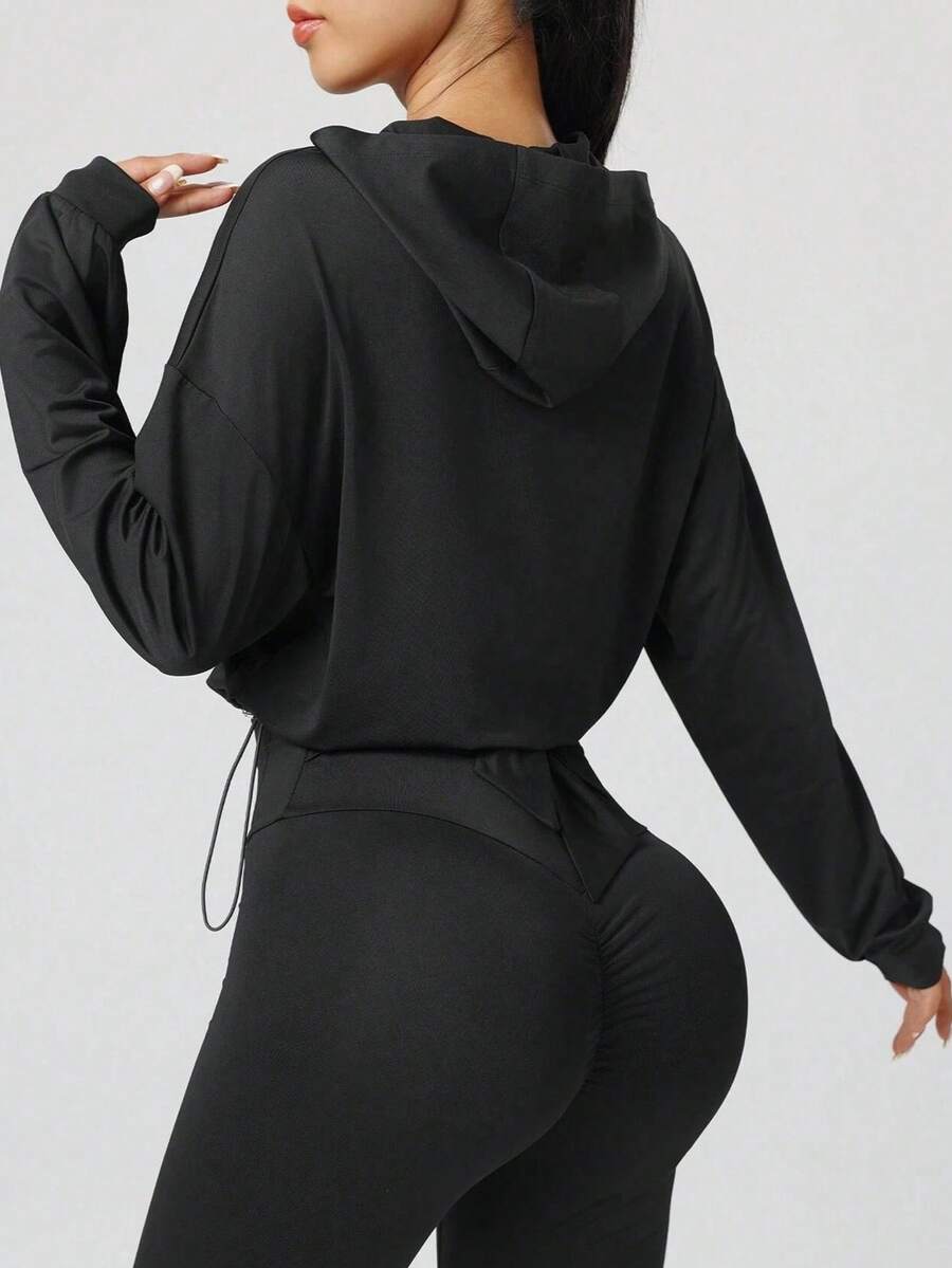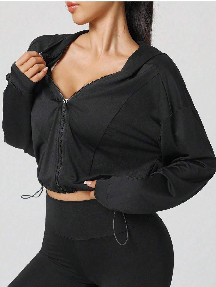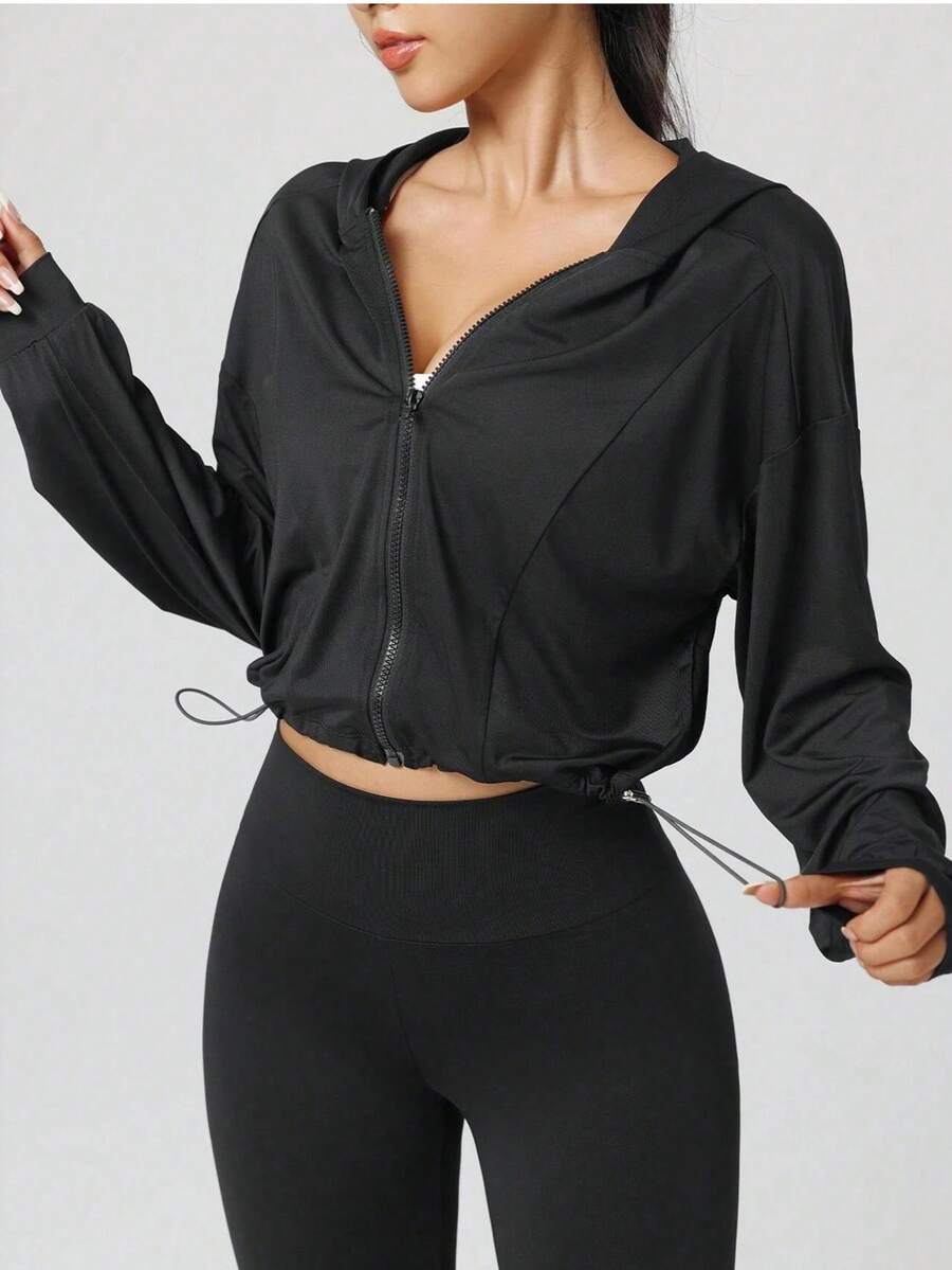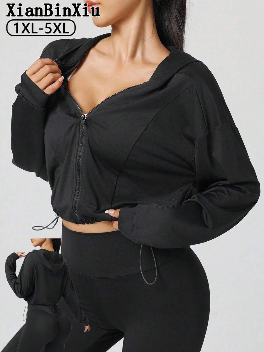 Xianbinxiu 1 pieza chaqueta con buzos con capucha con cordon y cremallera para mujer talla grande, ropa deportiva casual de yoga, manga larga negra, otono/invierno