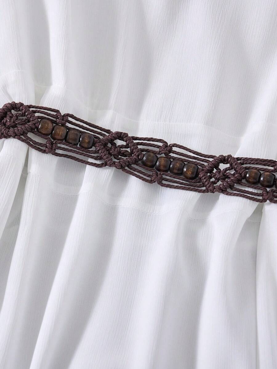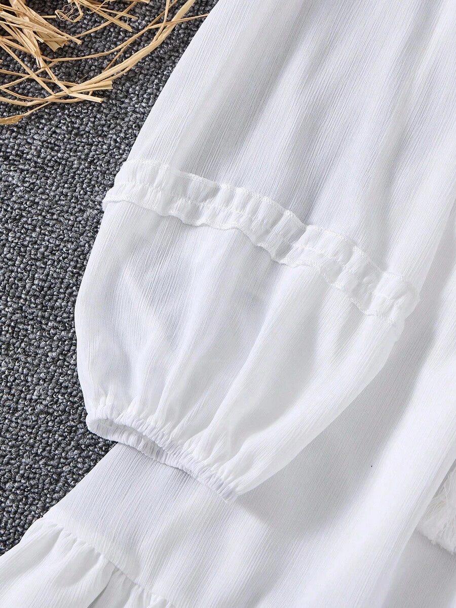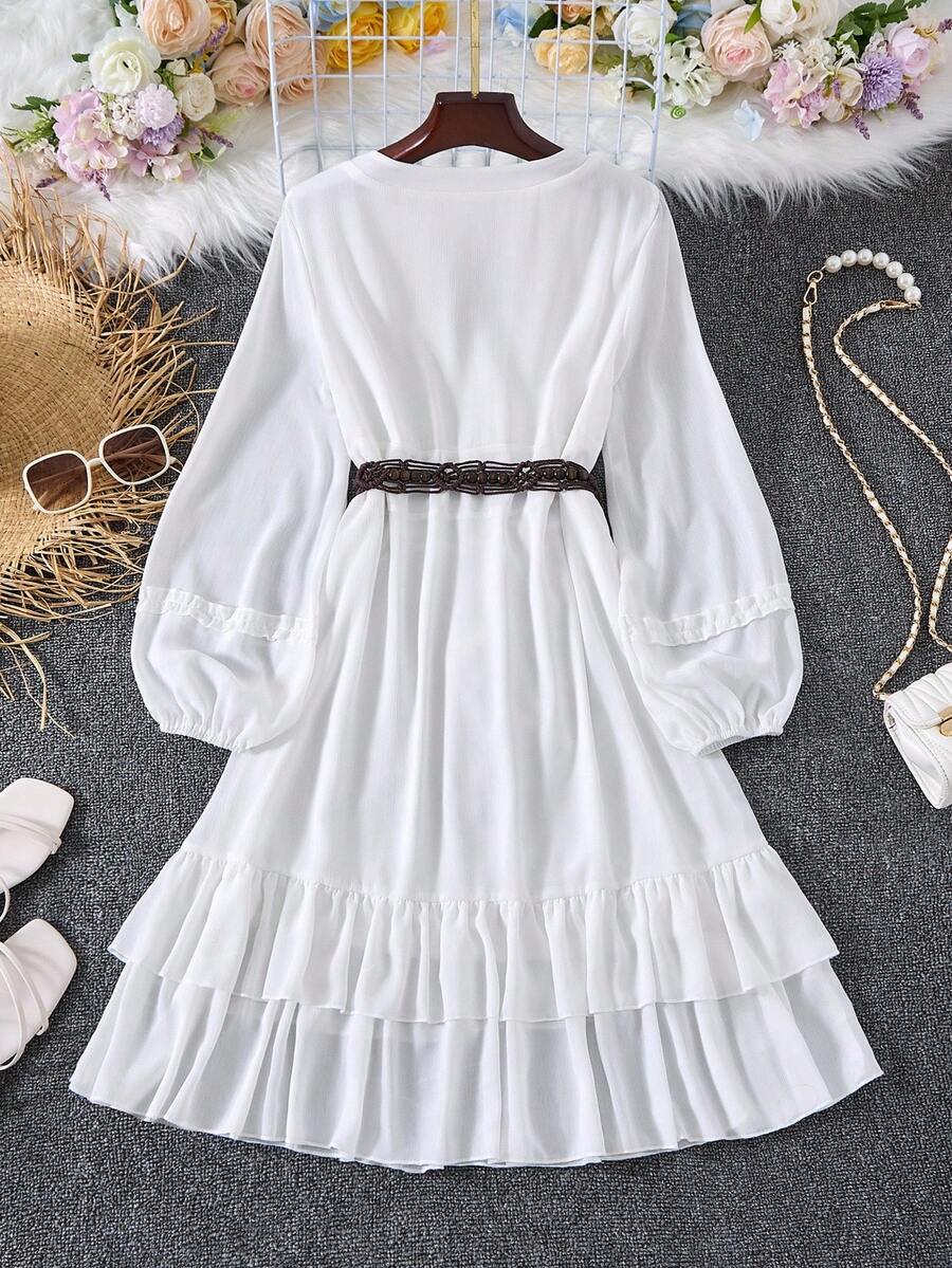 Vestido de media longitud con mangas de farol, diseno de lazo y volantes en el bajo, de unicolor para vacaciones de mujer