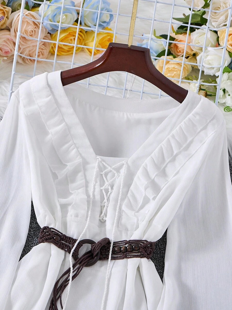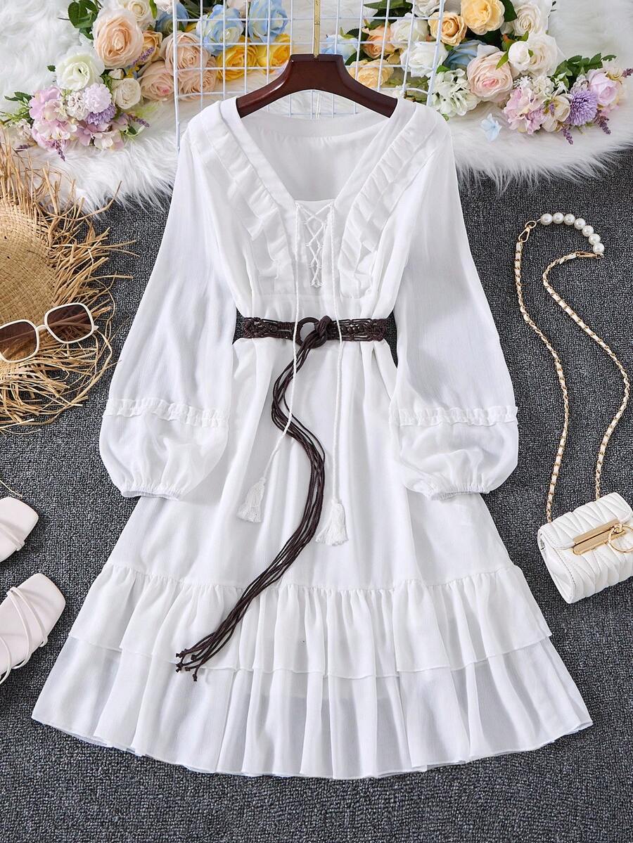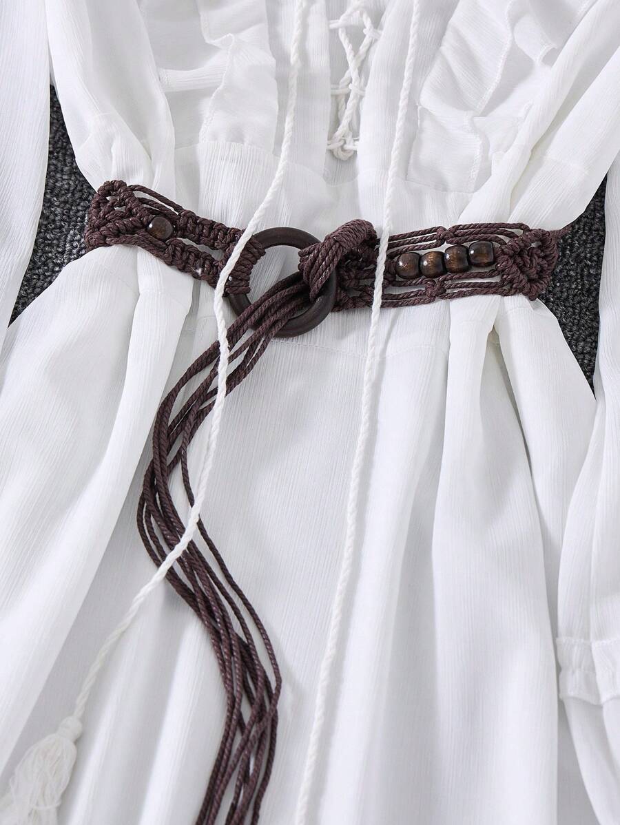 Vestido de media longitud con mangas de farol, diseno de lazo y volantes en el bajo, de unicolor para vacaciones de mujer