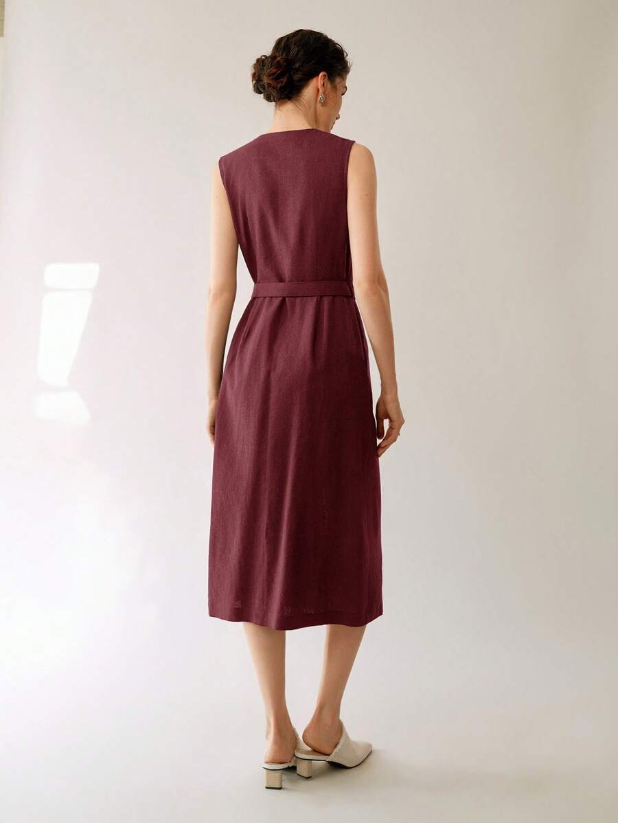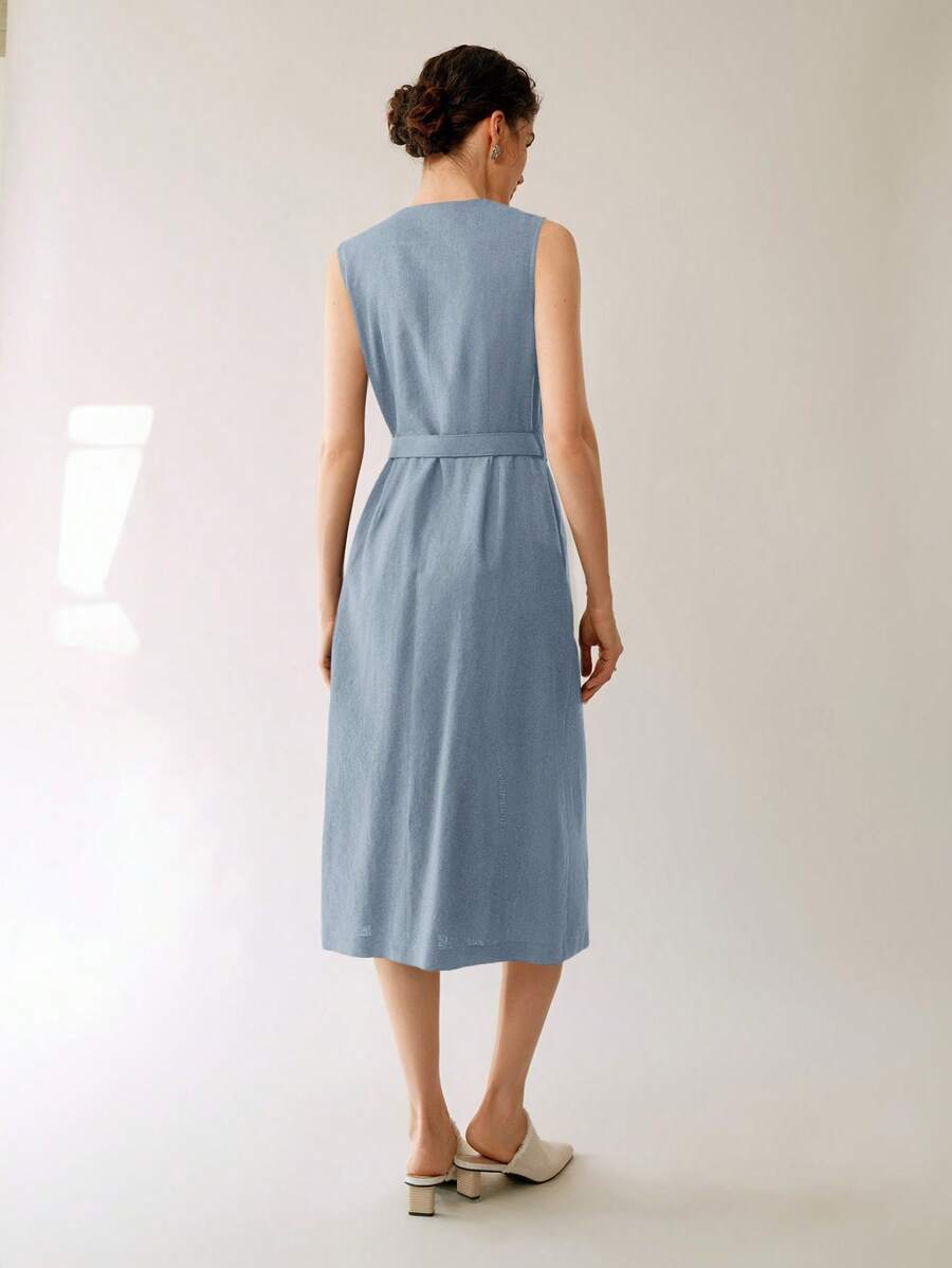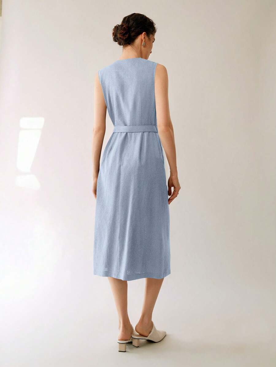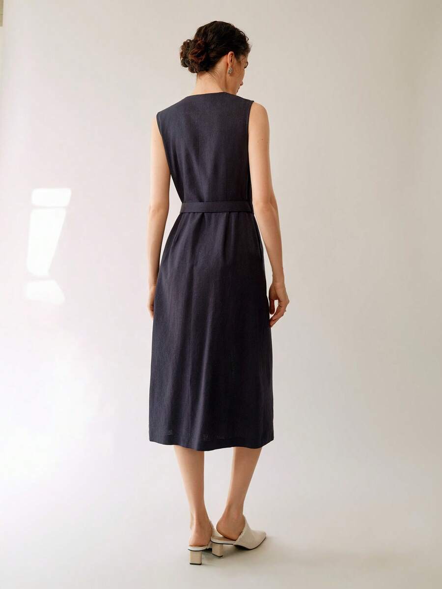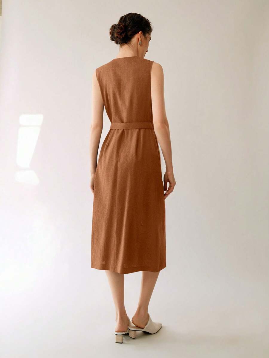 Vestido midi de lino sin mangas elegante y casual para mujer con cinturon