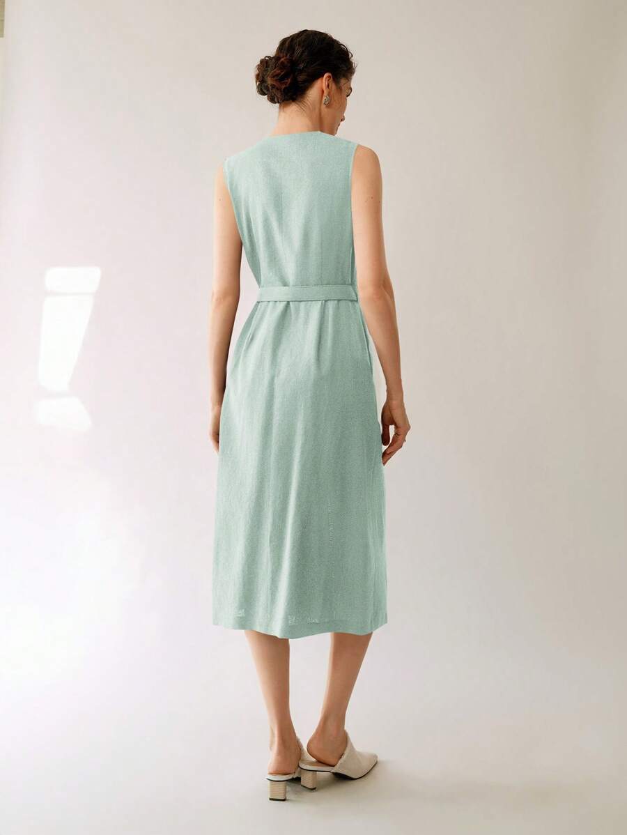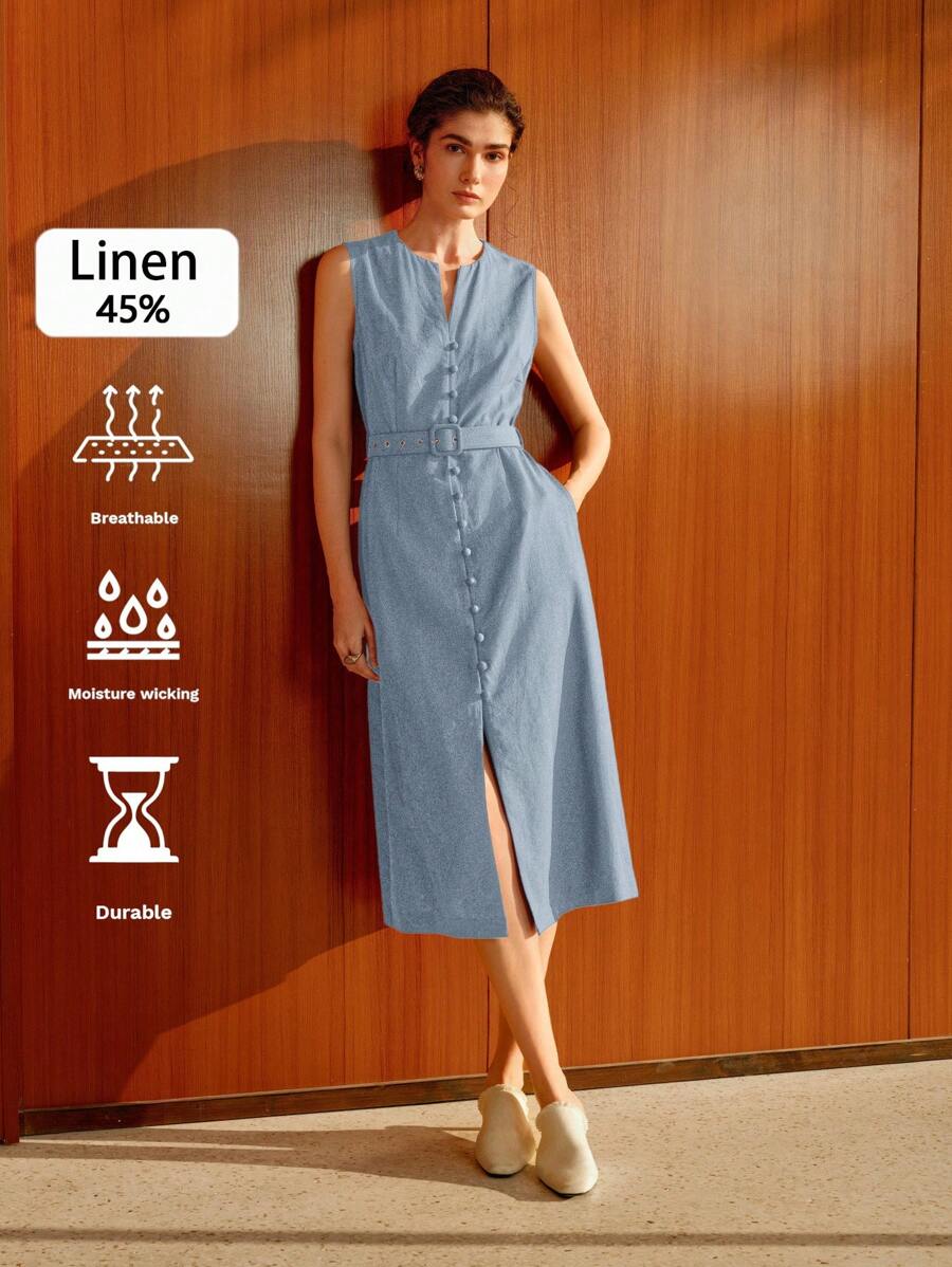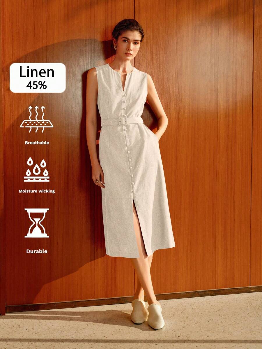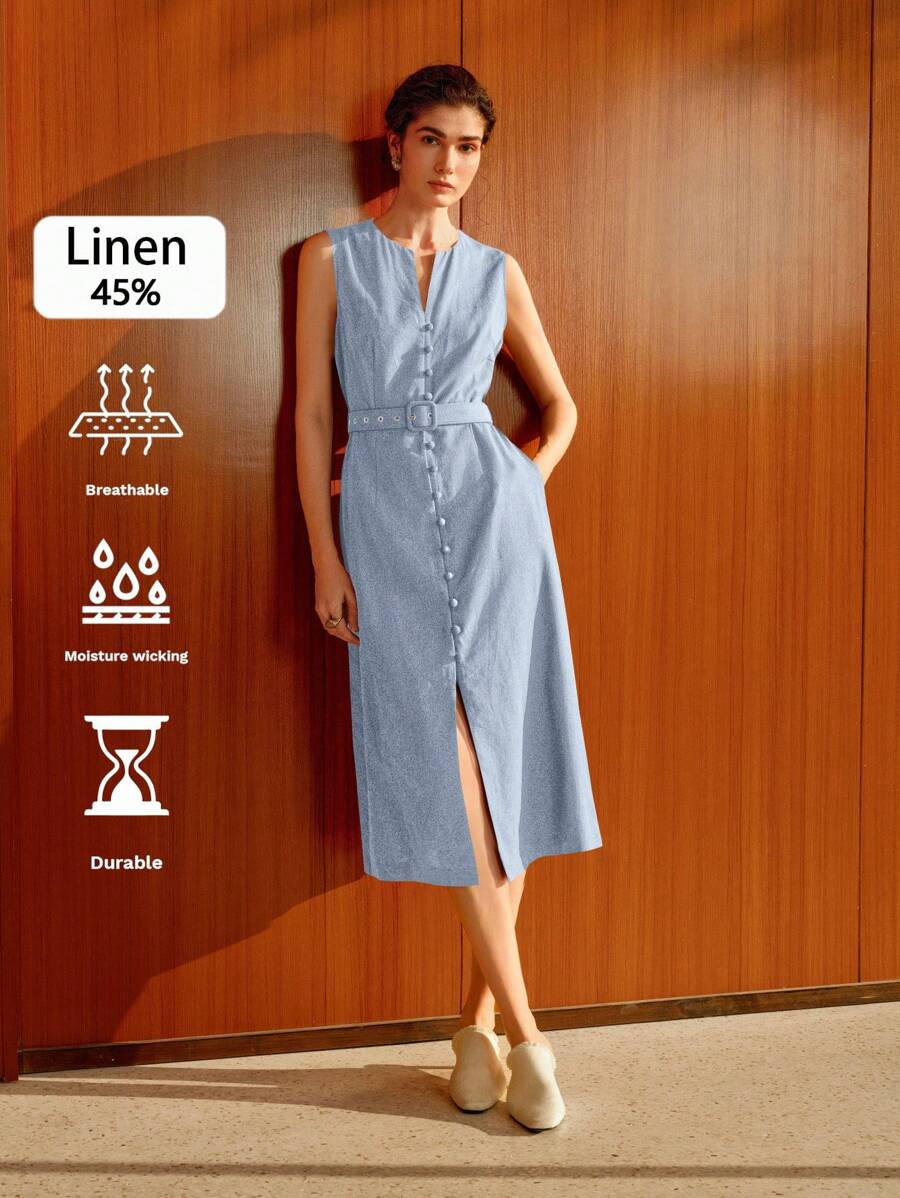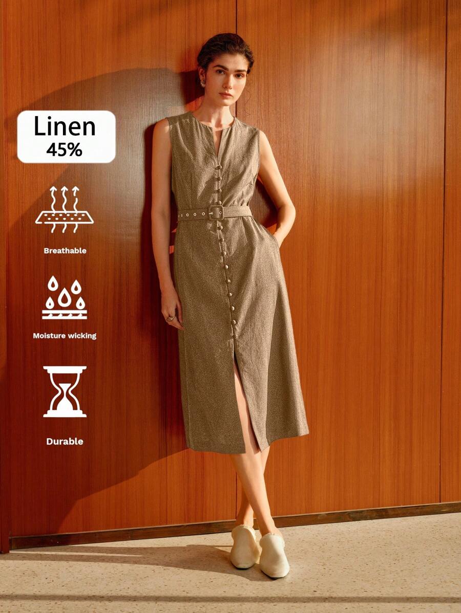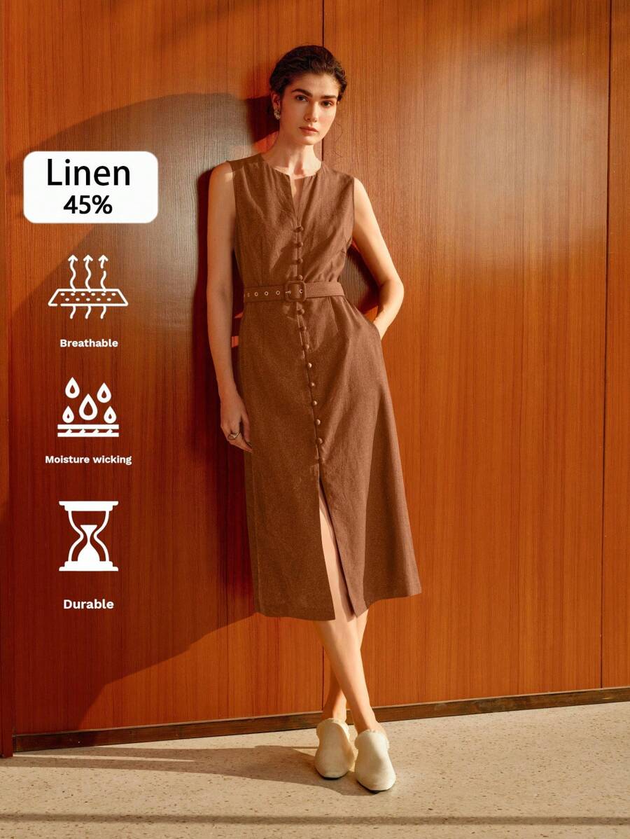 Vestido midi de lino sin mangas elegante y casual para mujer con cinturon