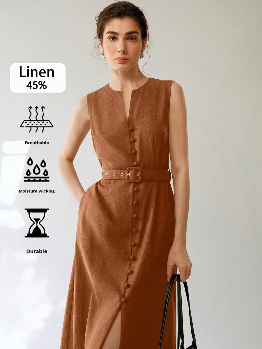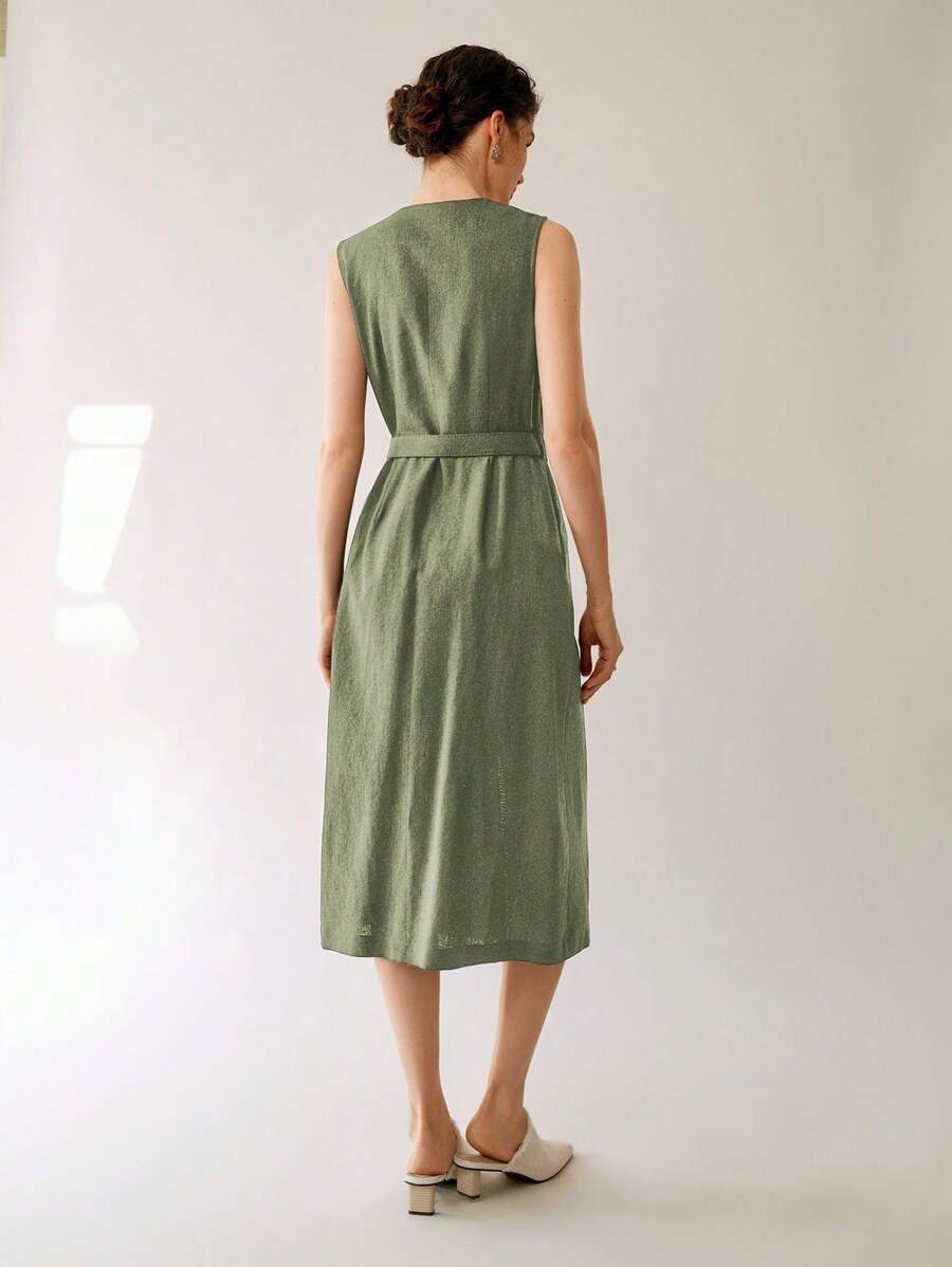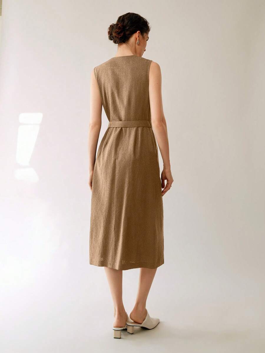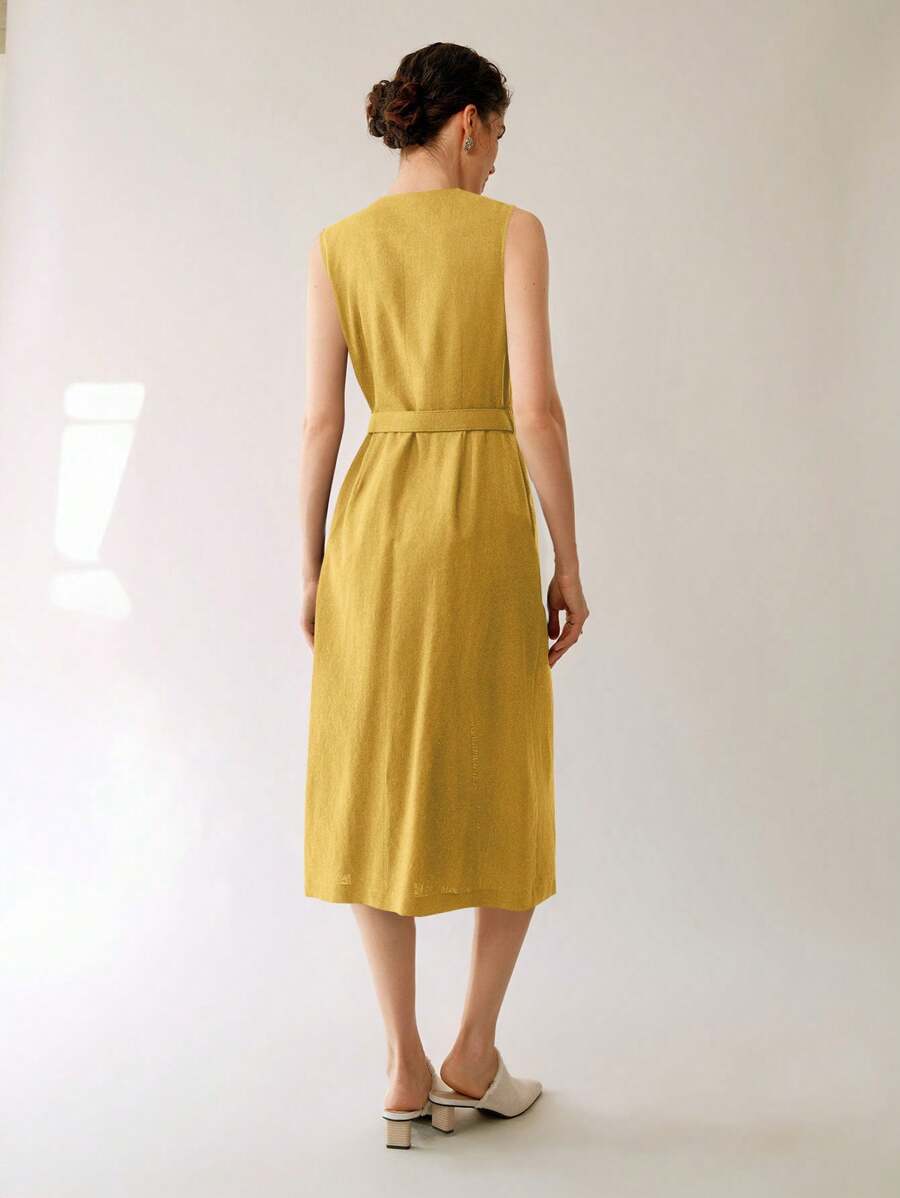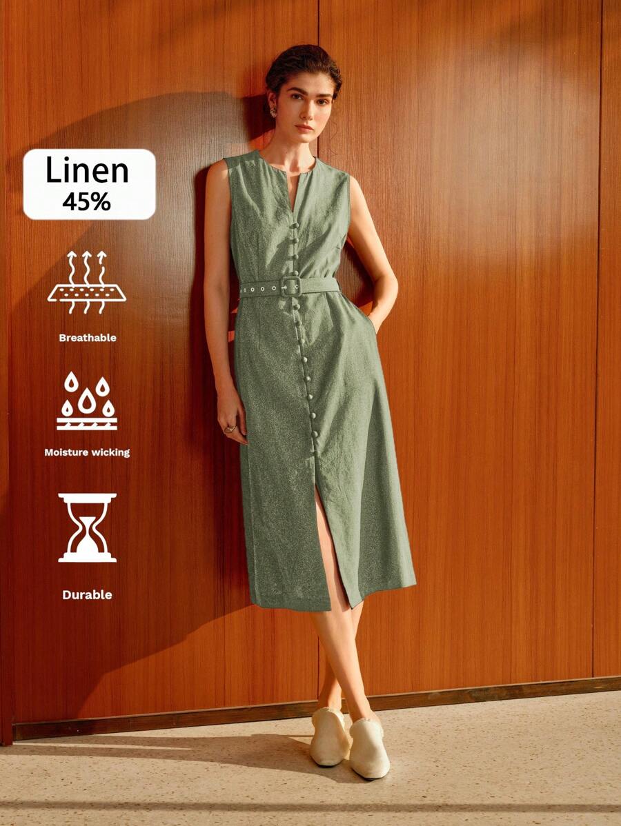 Vestido midi de lino sin mangas elegante y casual para mujer con cinturon