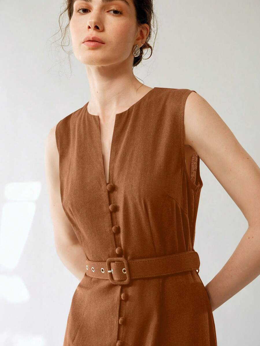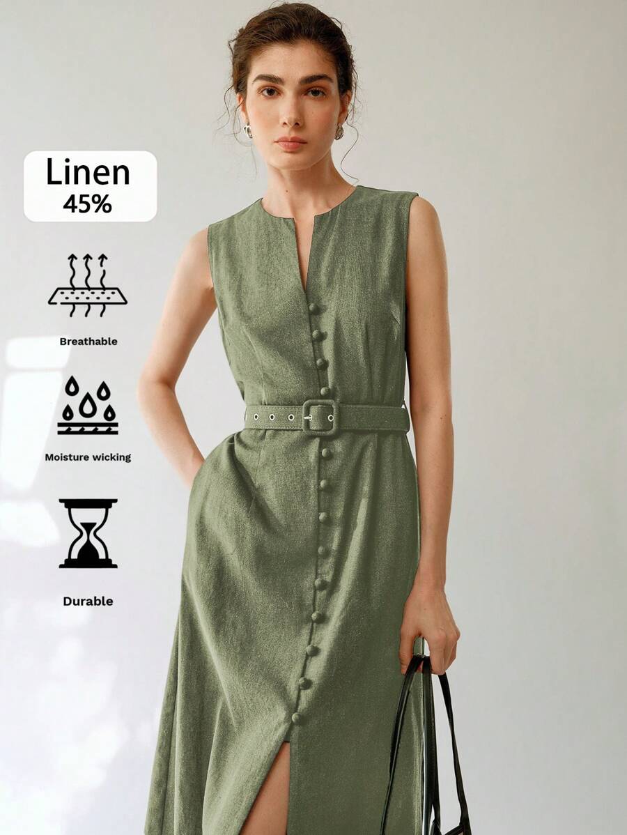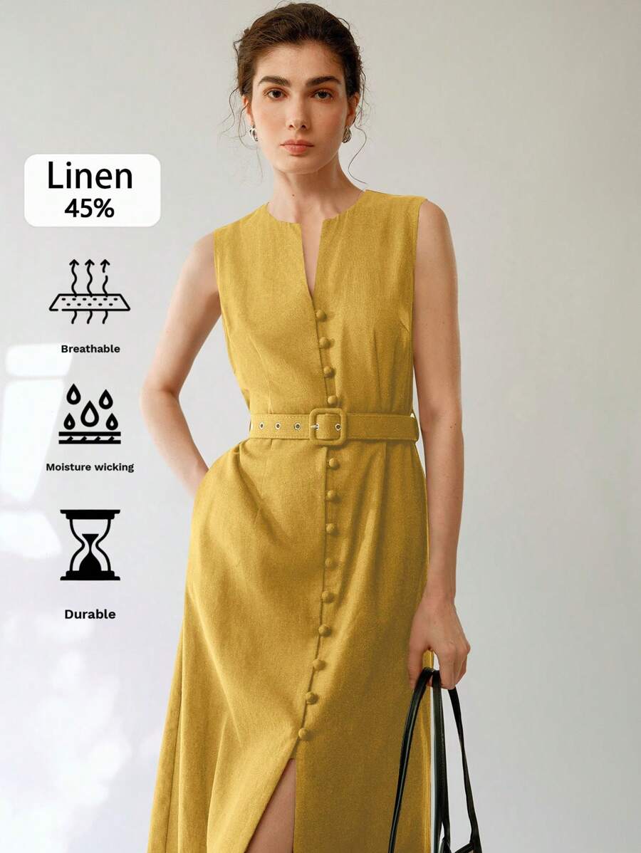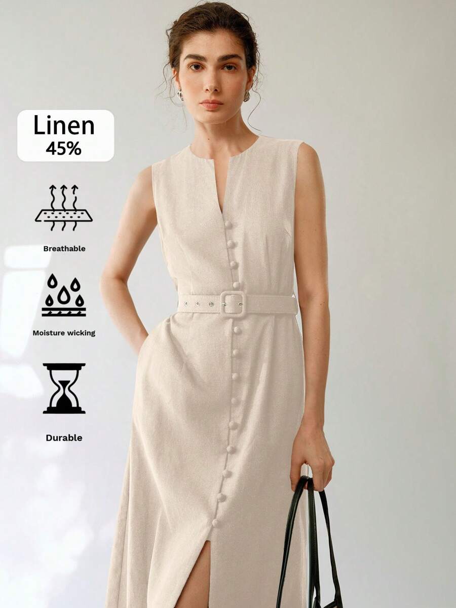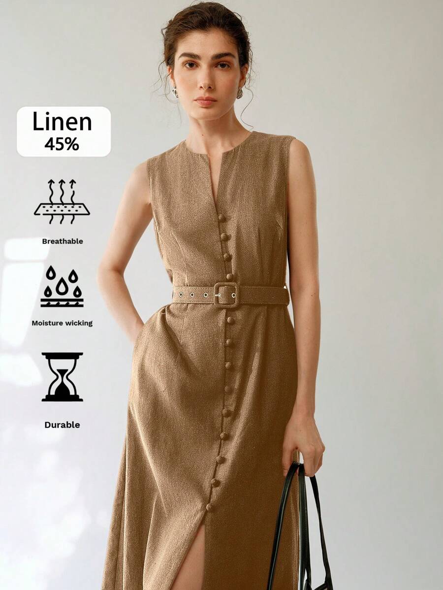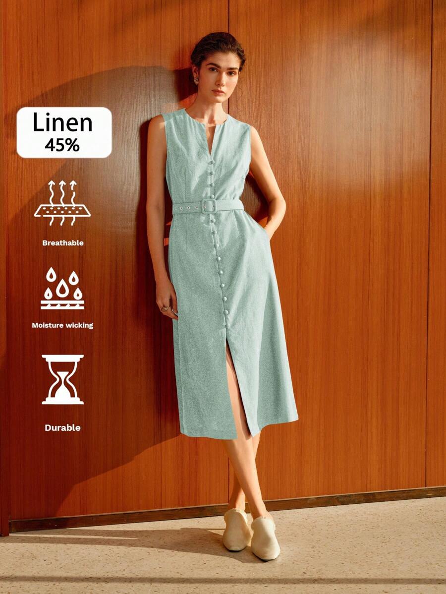 Vestido midi de lino sin mangas elegante y casual para mujer con cinturon