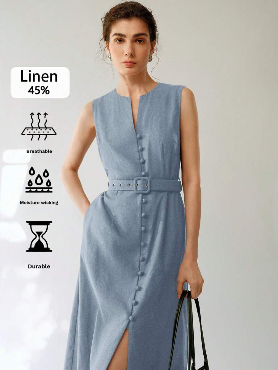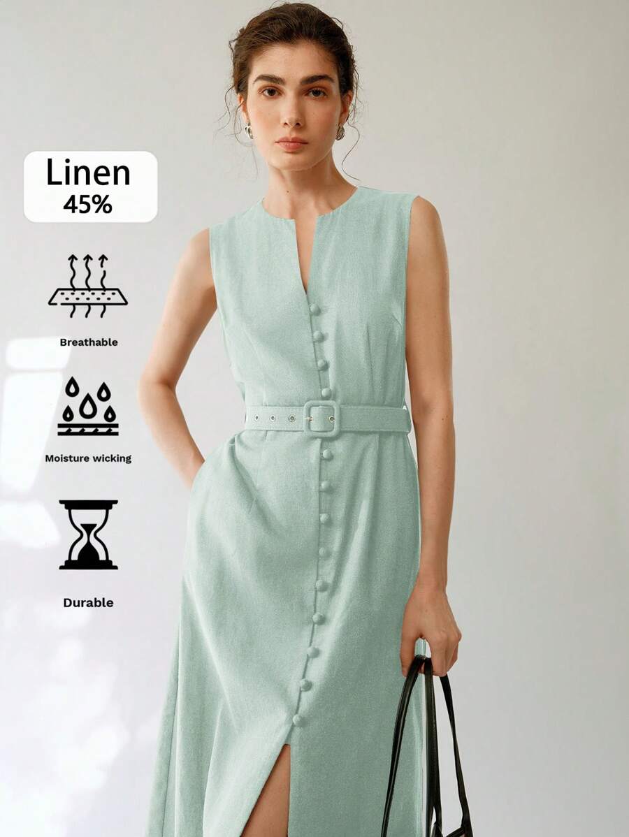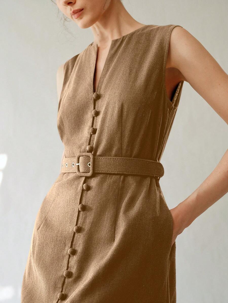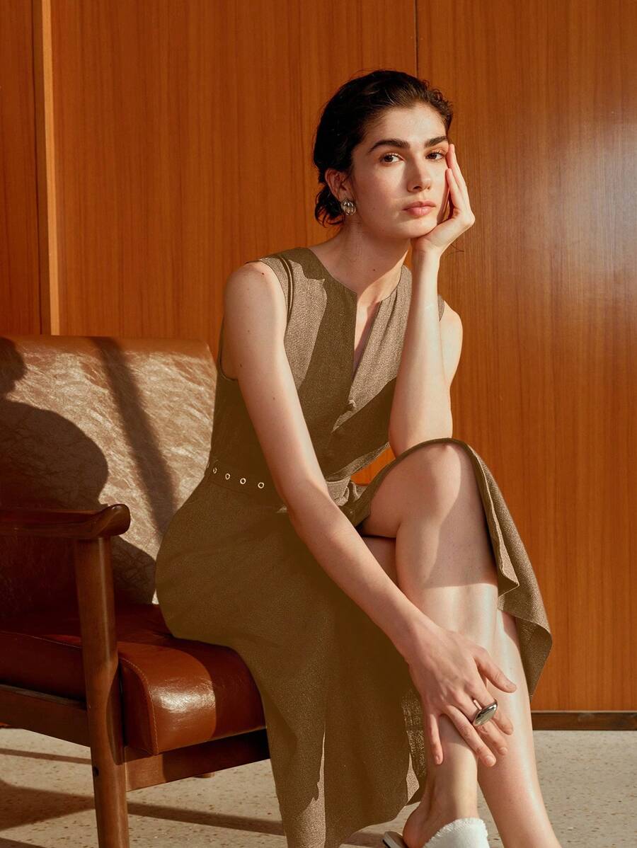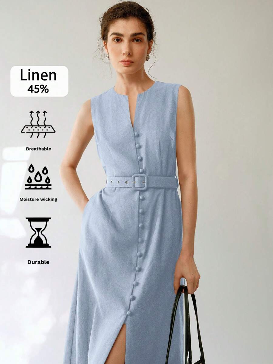 Vestido midi de lino sin mangas elegante y casual para mujer con cinturon
