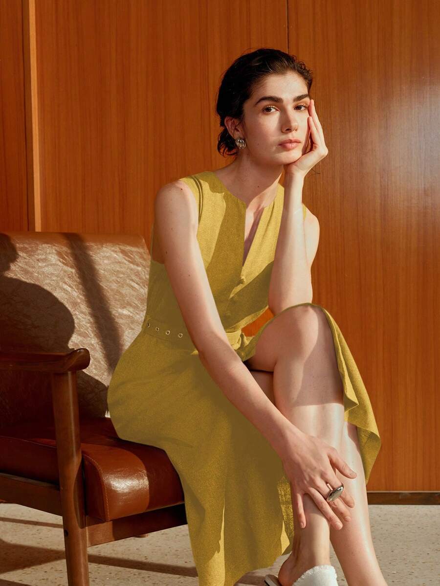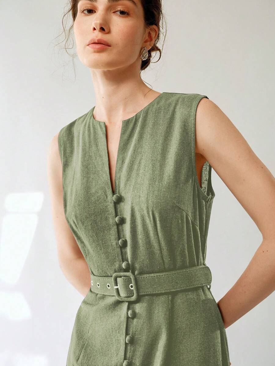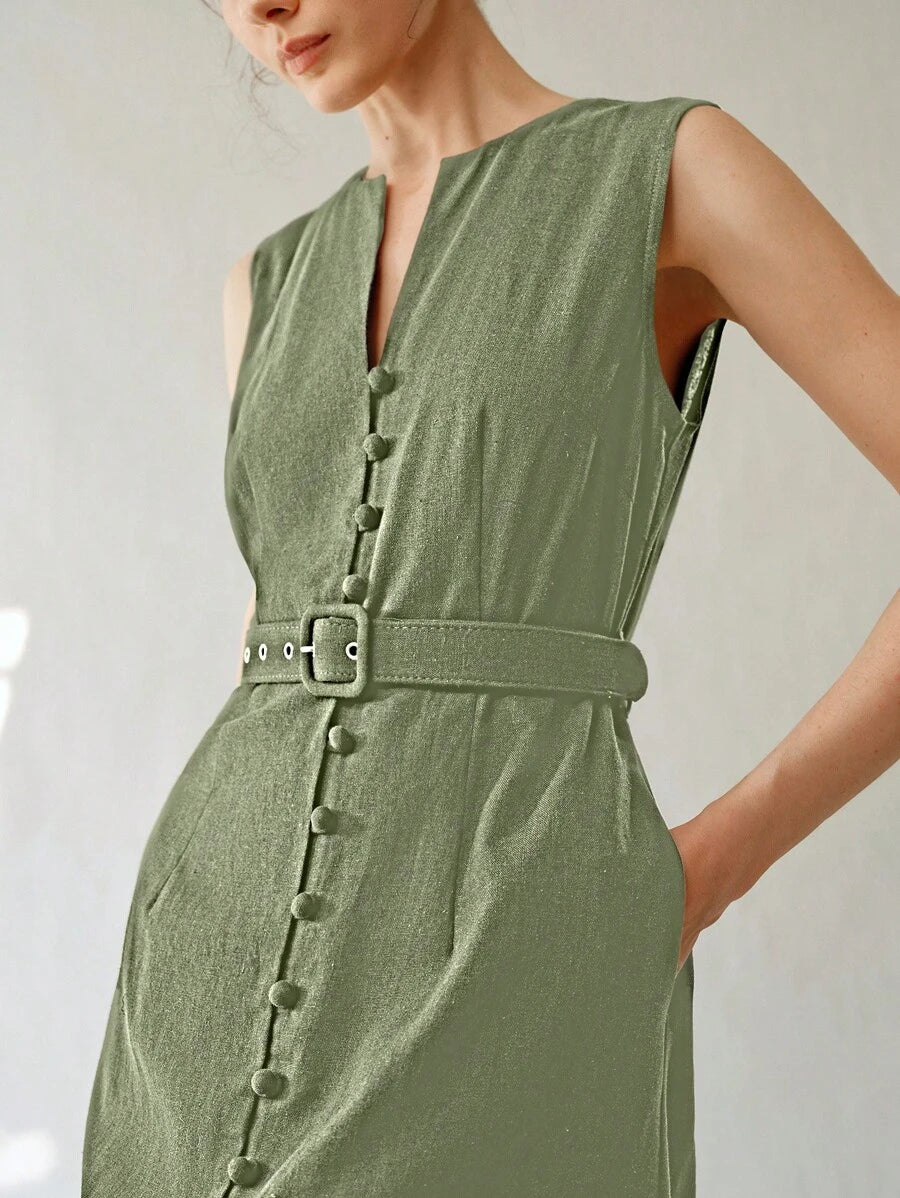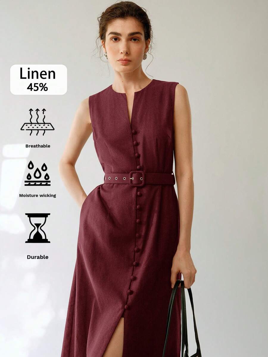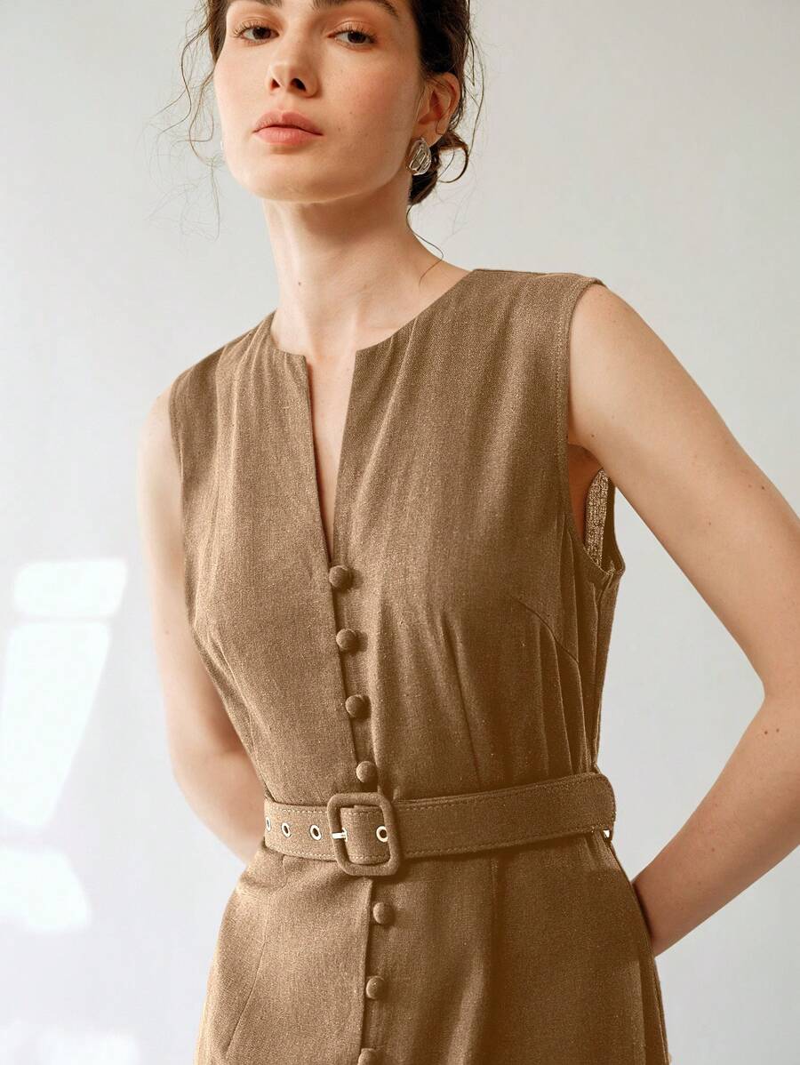 Vestido midi de lino sin mangas elegante y casual para mujer con cinturon