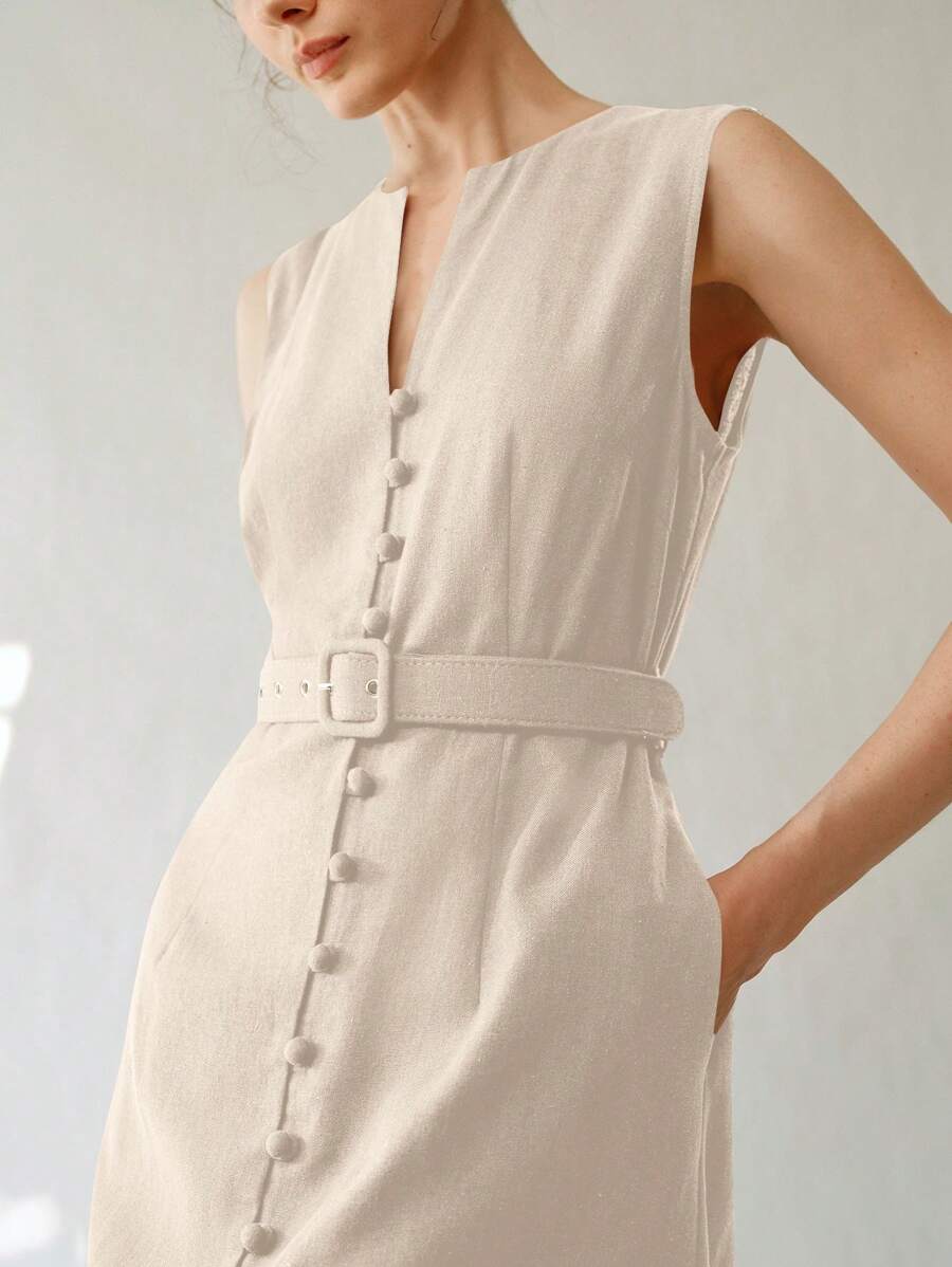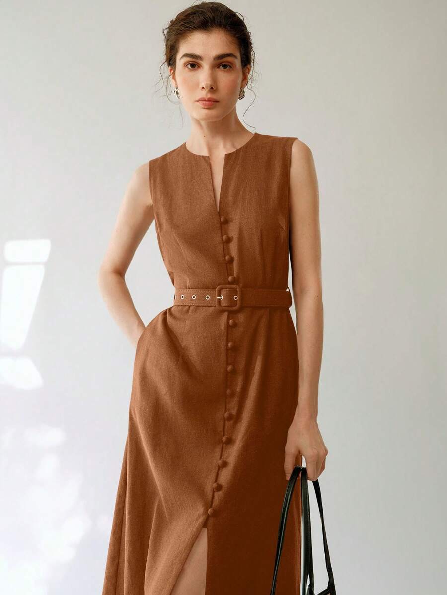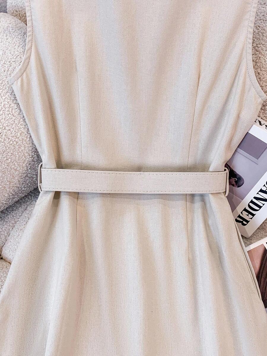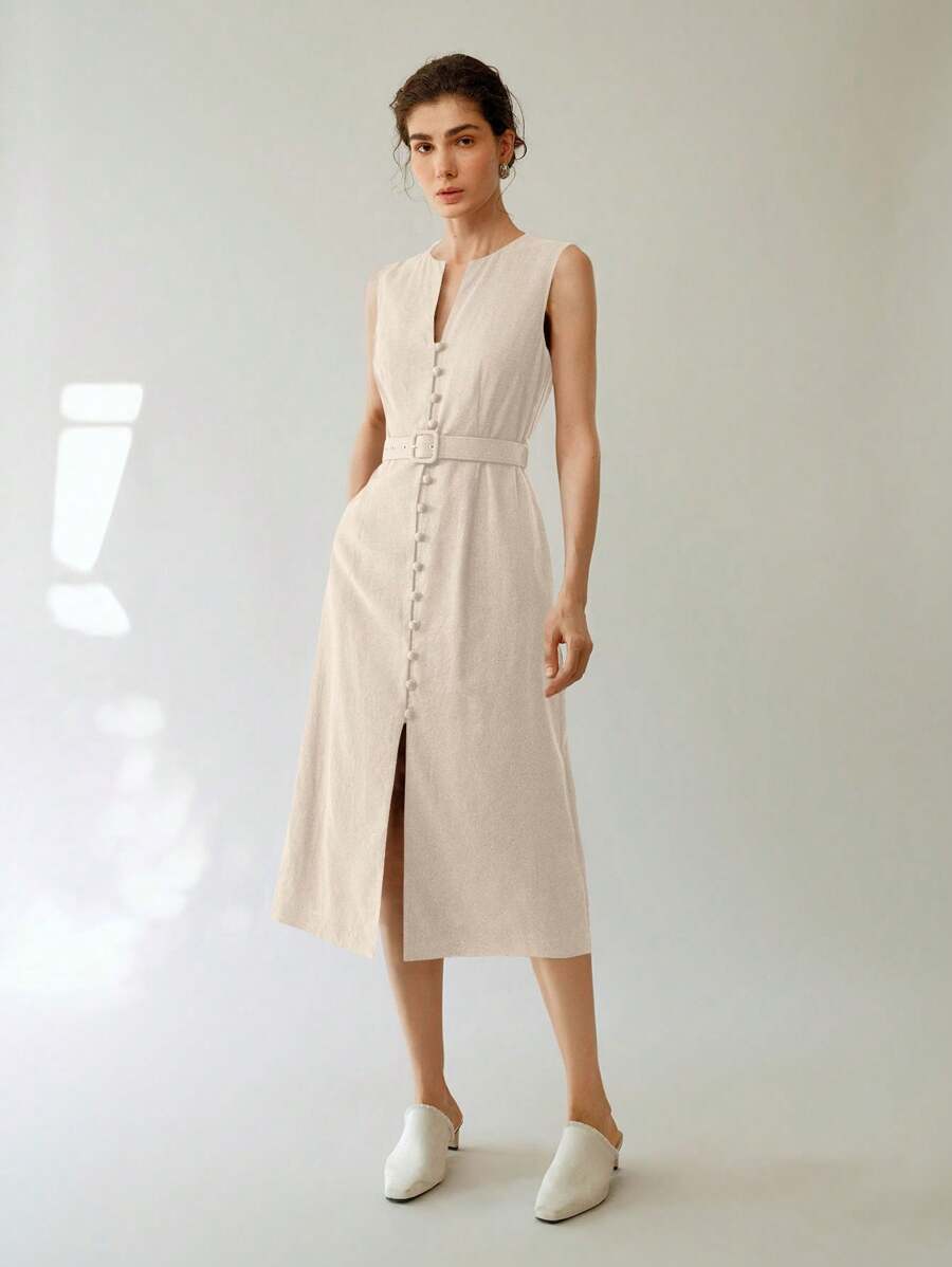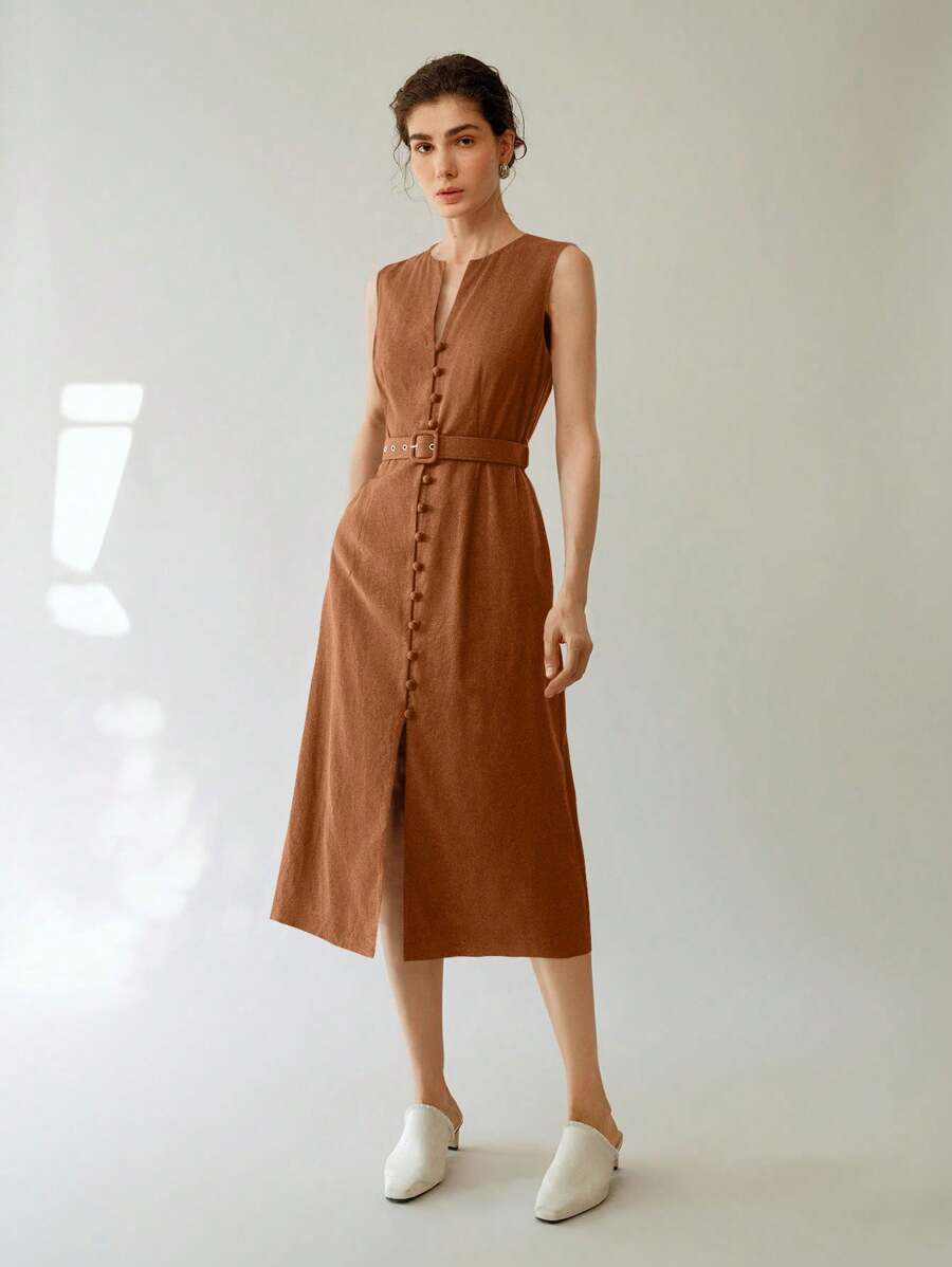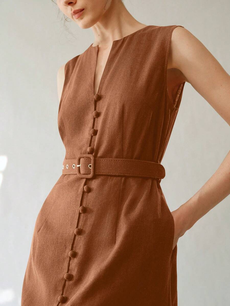 Vestido midi de lino sin mangas elegante y casual para mujer con cinturon