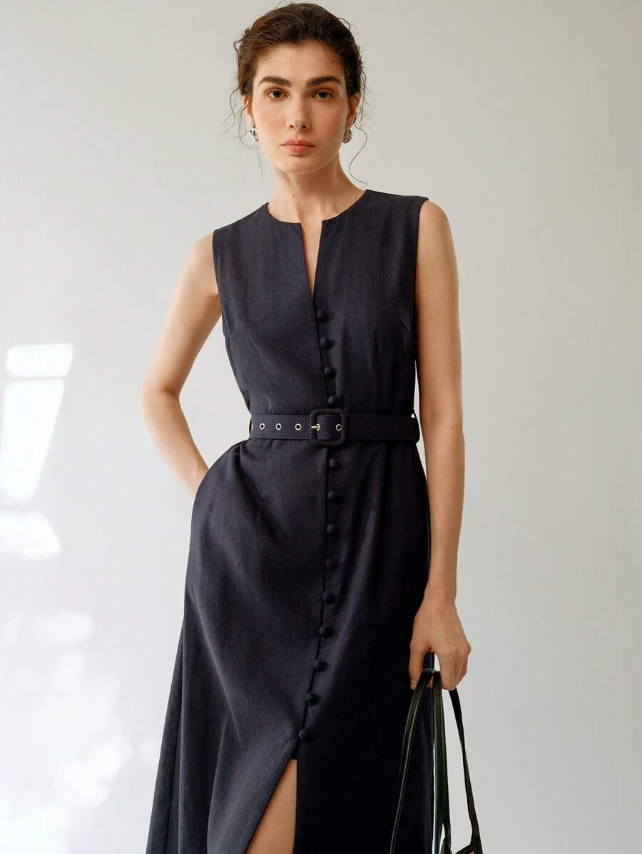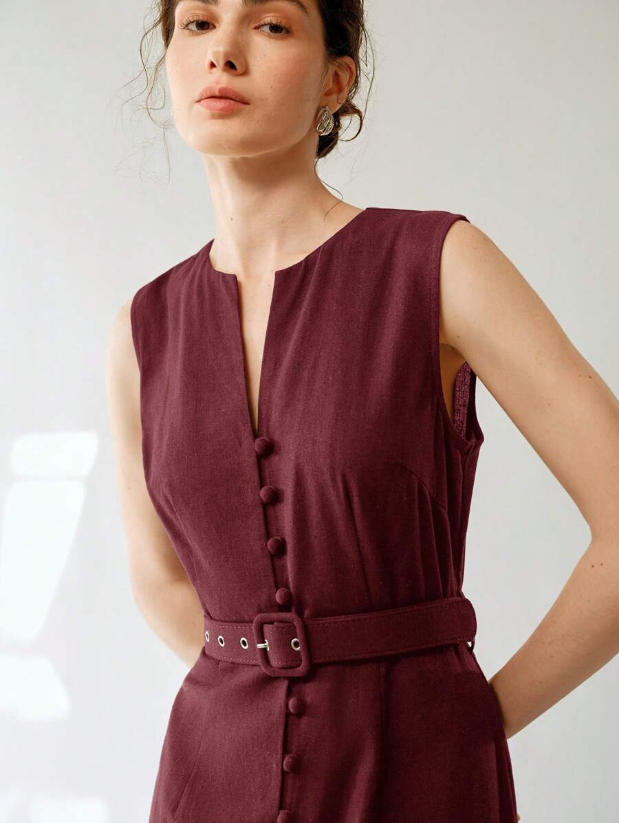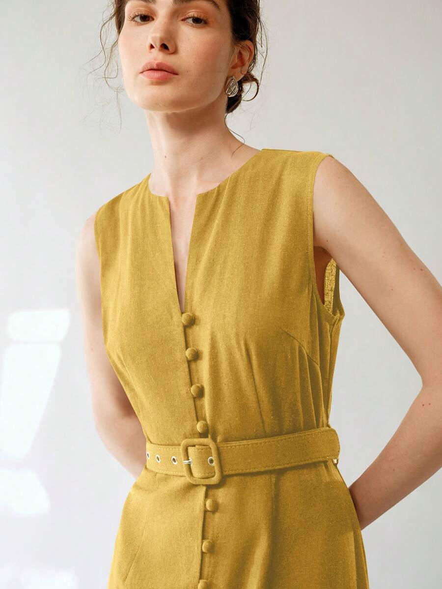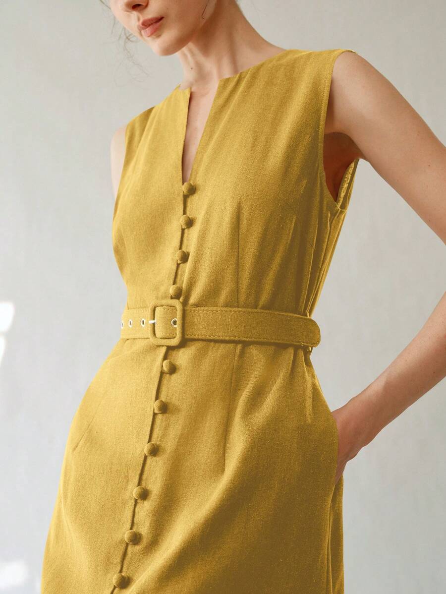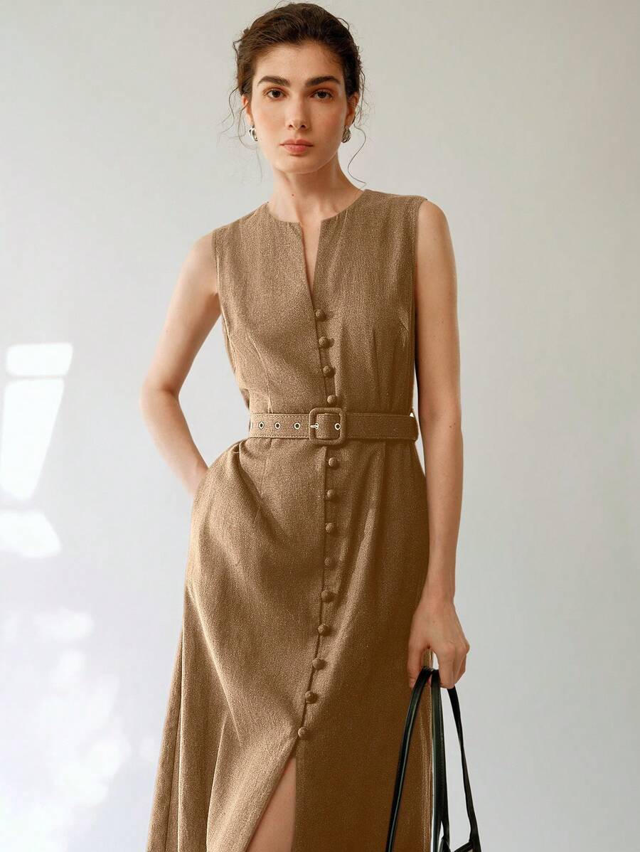 Vestido midi de lino sin mangas elegante y casual para mujer con cinturon