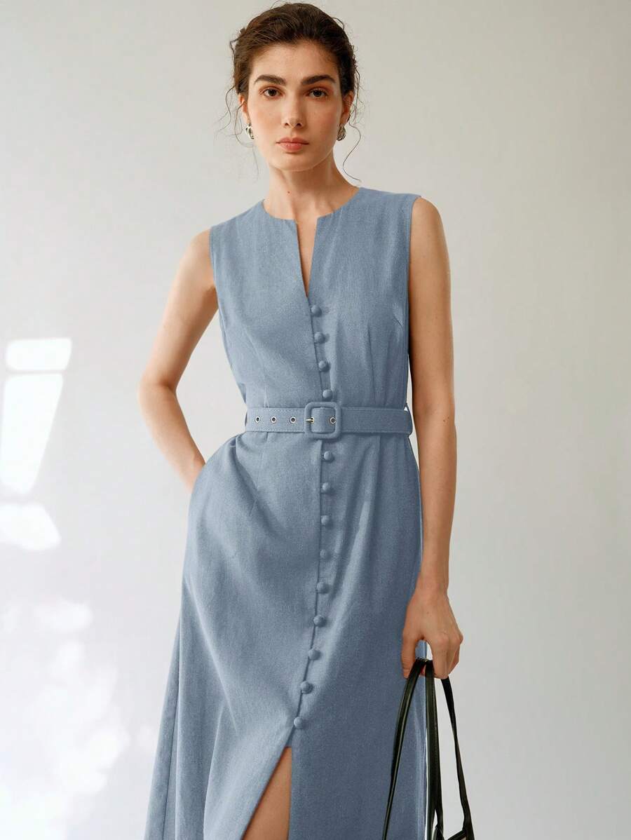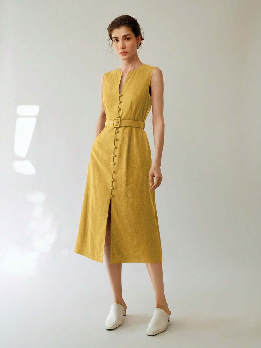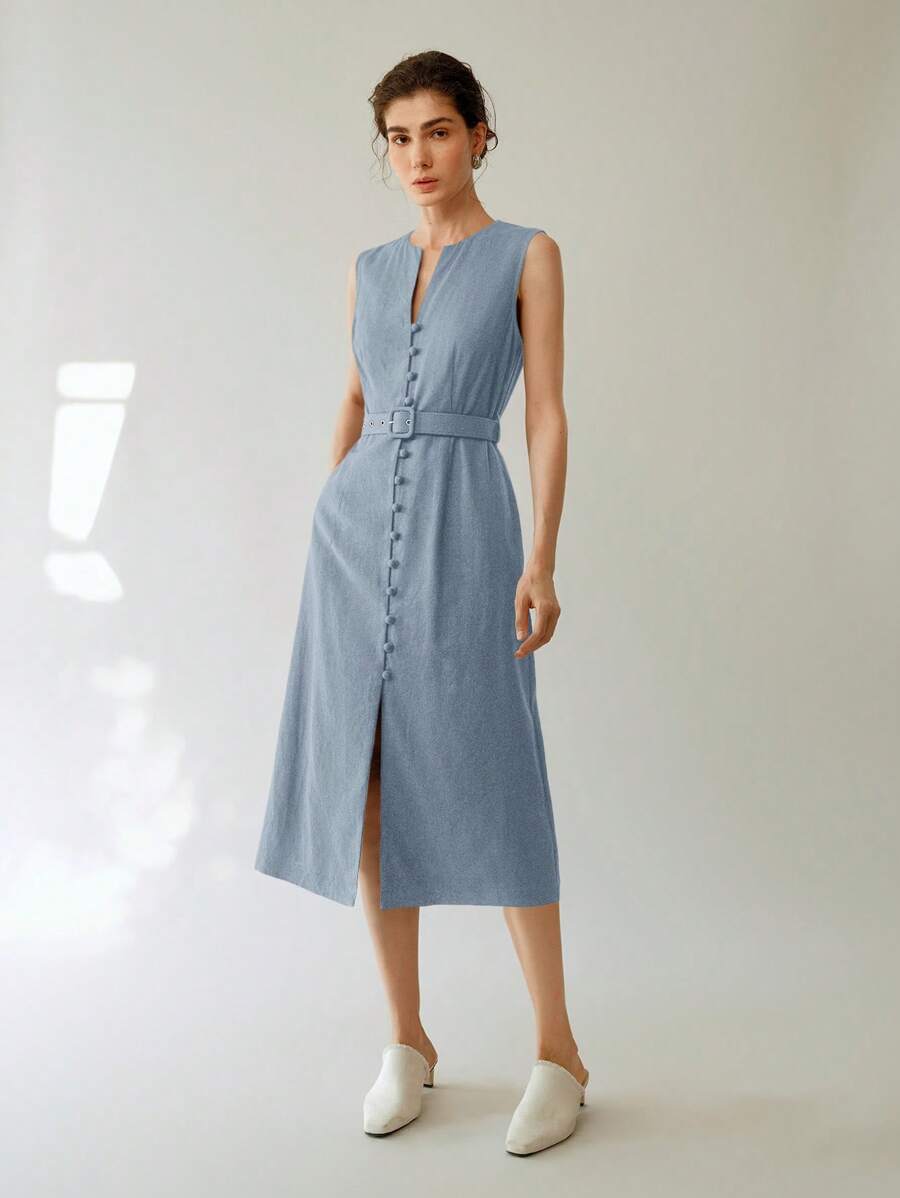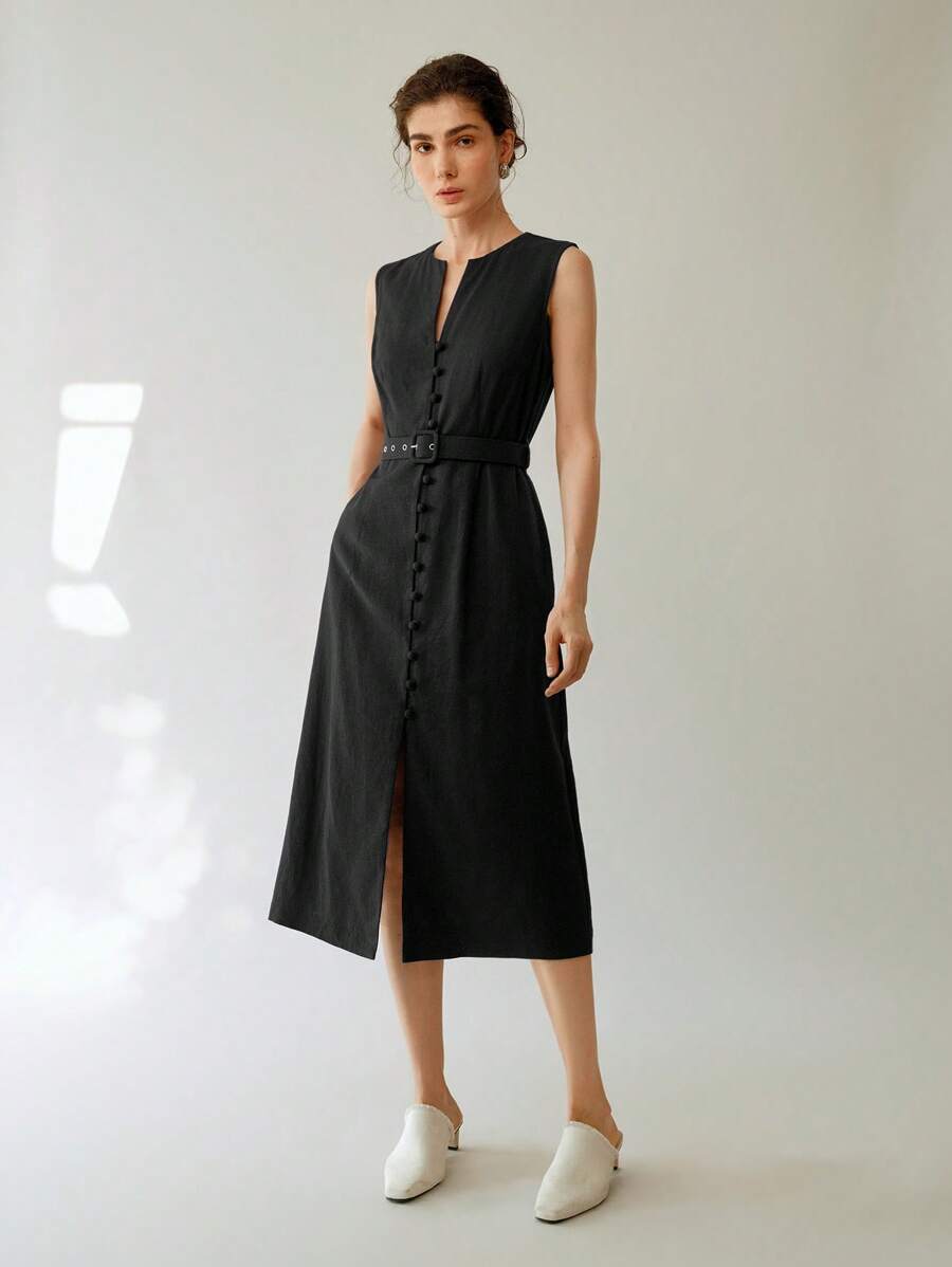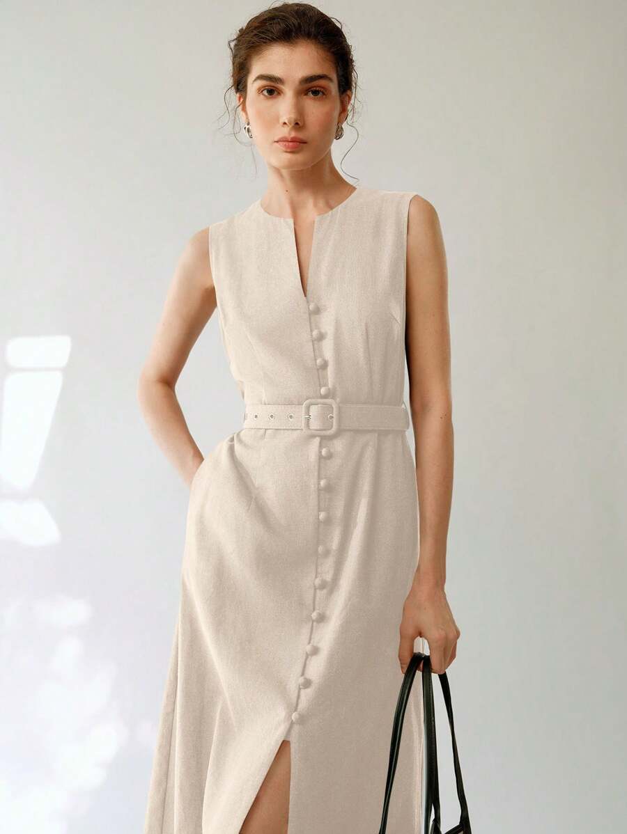 Vestido midi de lino sin mangas elegante y casual para mujer con cinturon