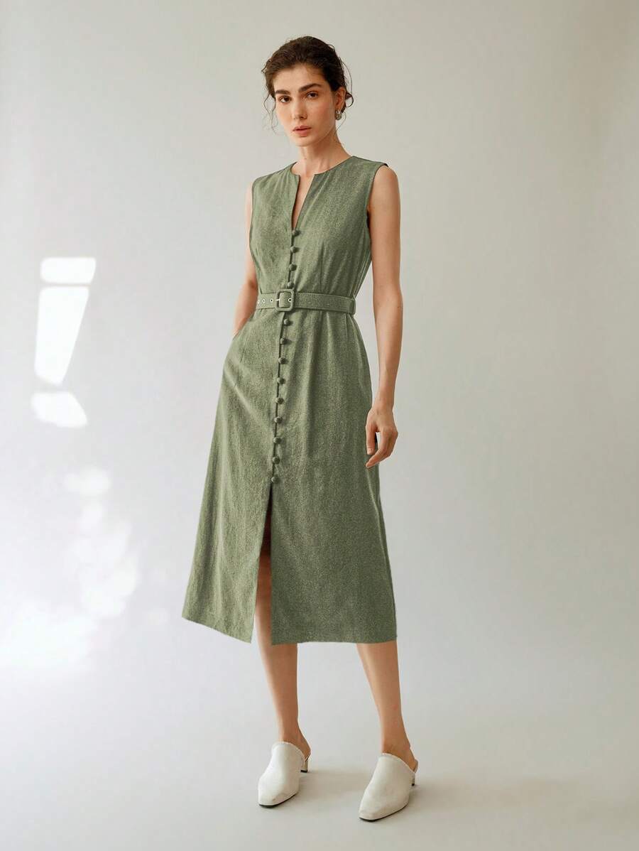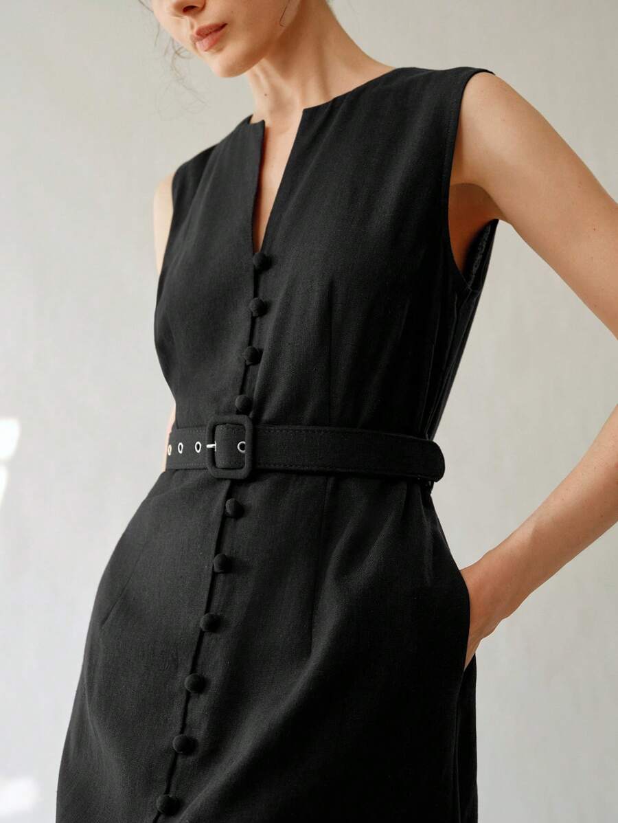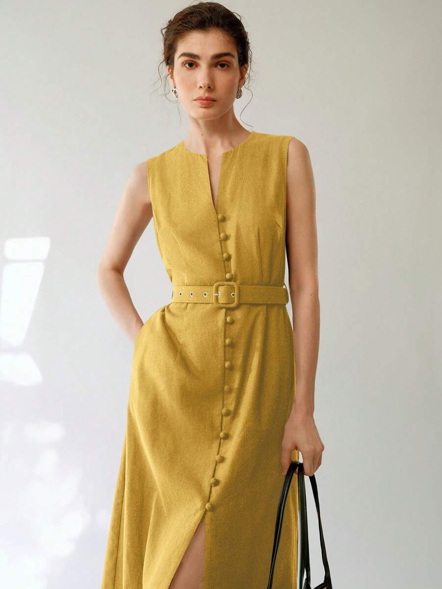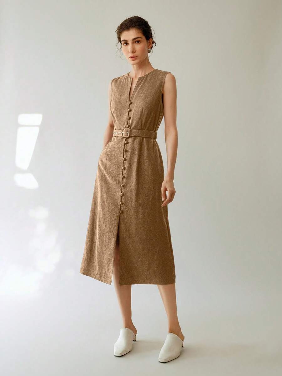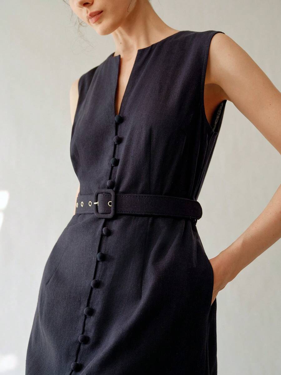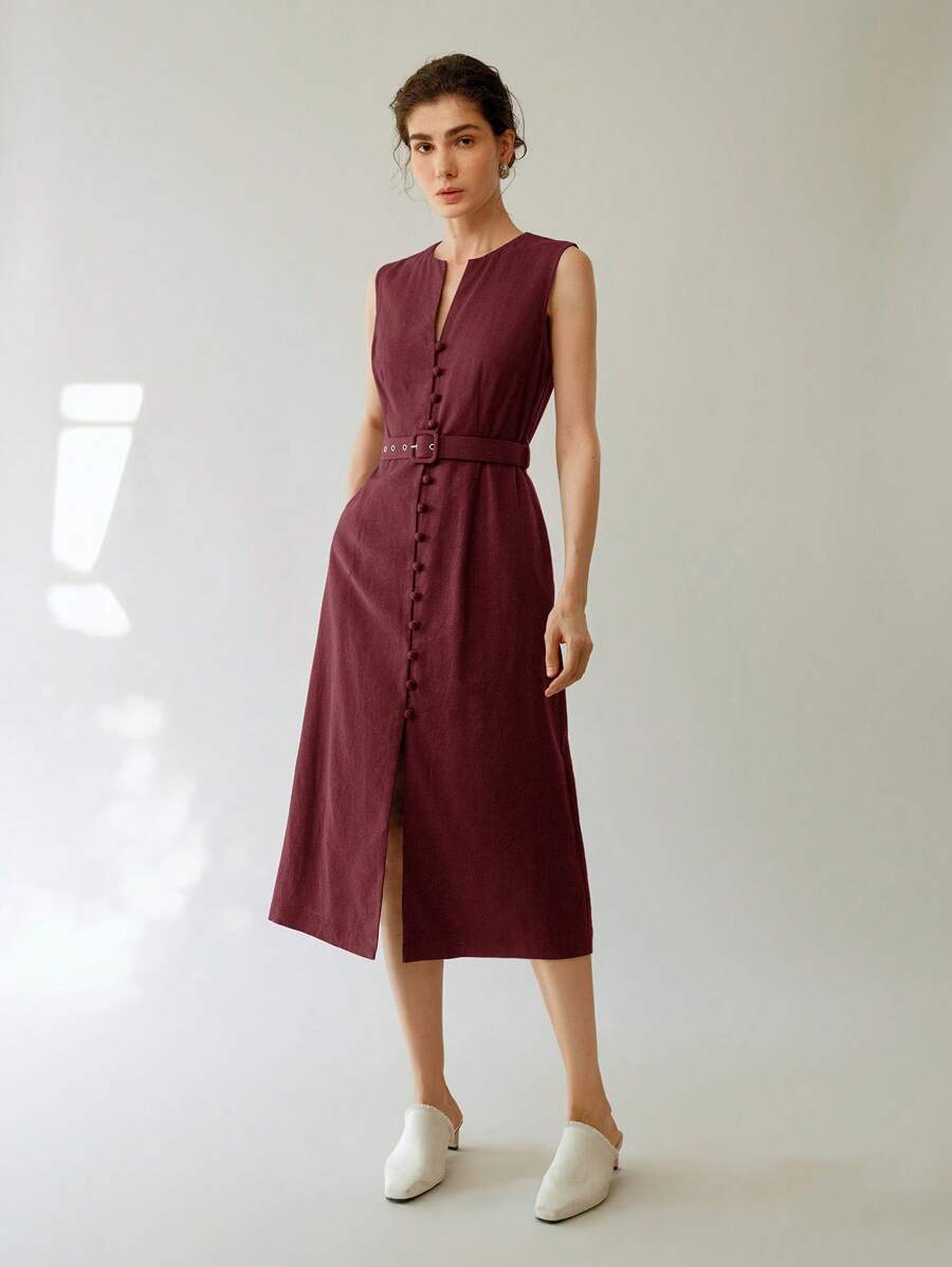 Vestido midi de lino sin mangas elegante y casual para mujer con cinturon