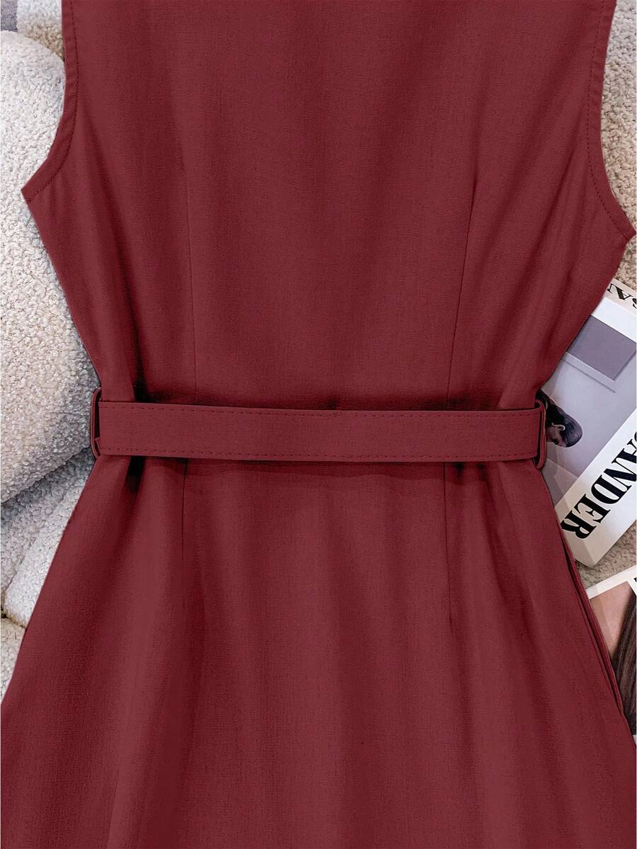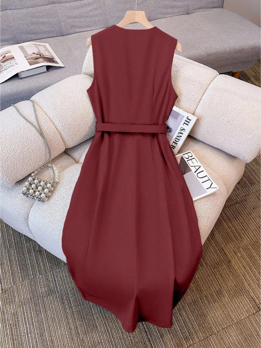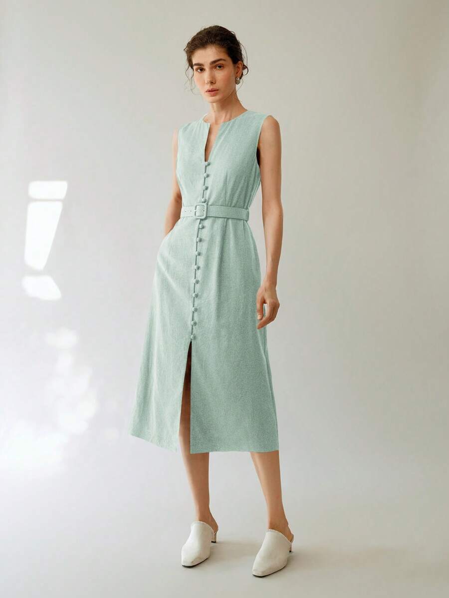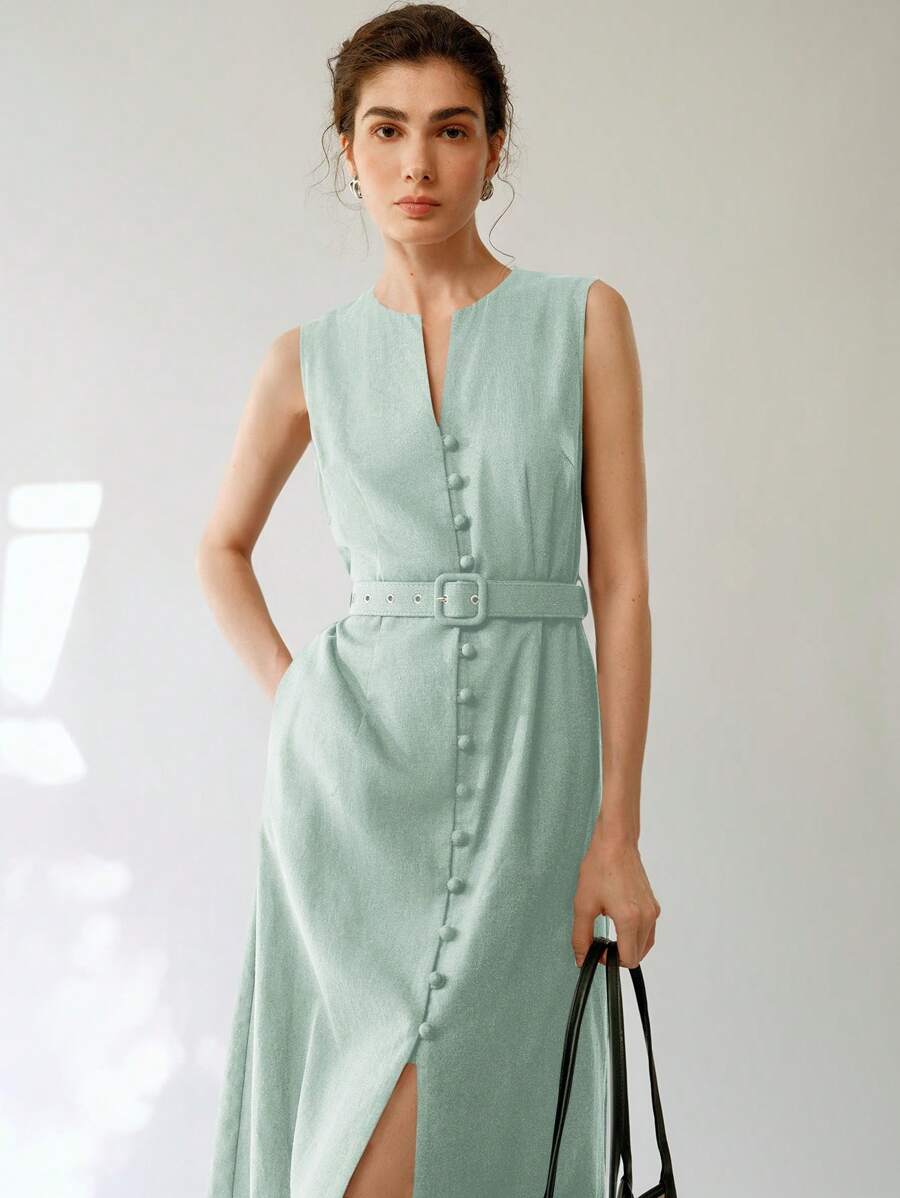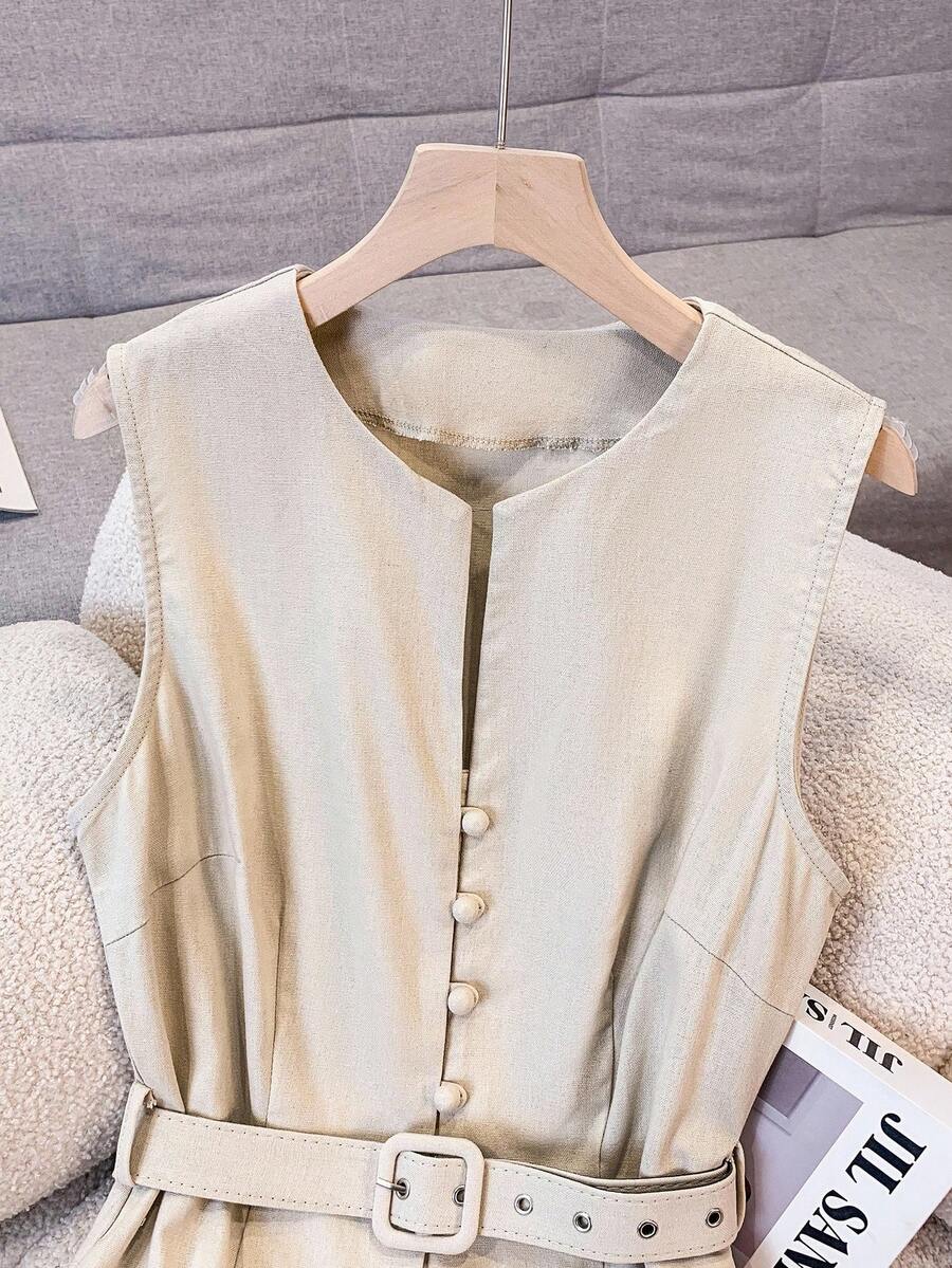 Vestido midi de lino sin mangas elegante y casual para mujer con cinturon