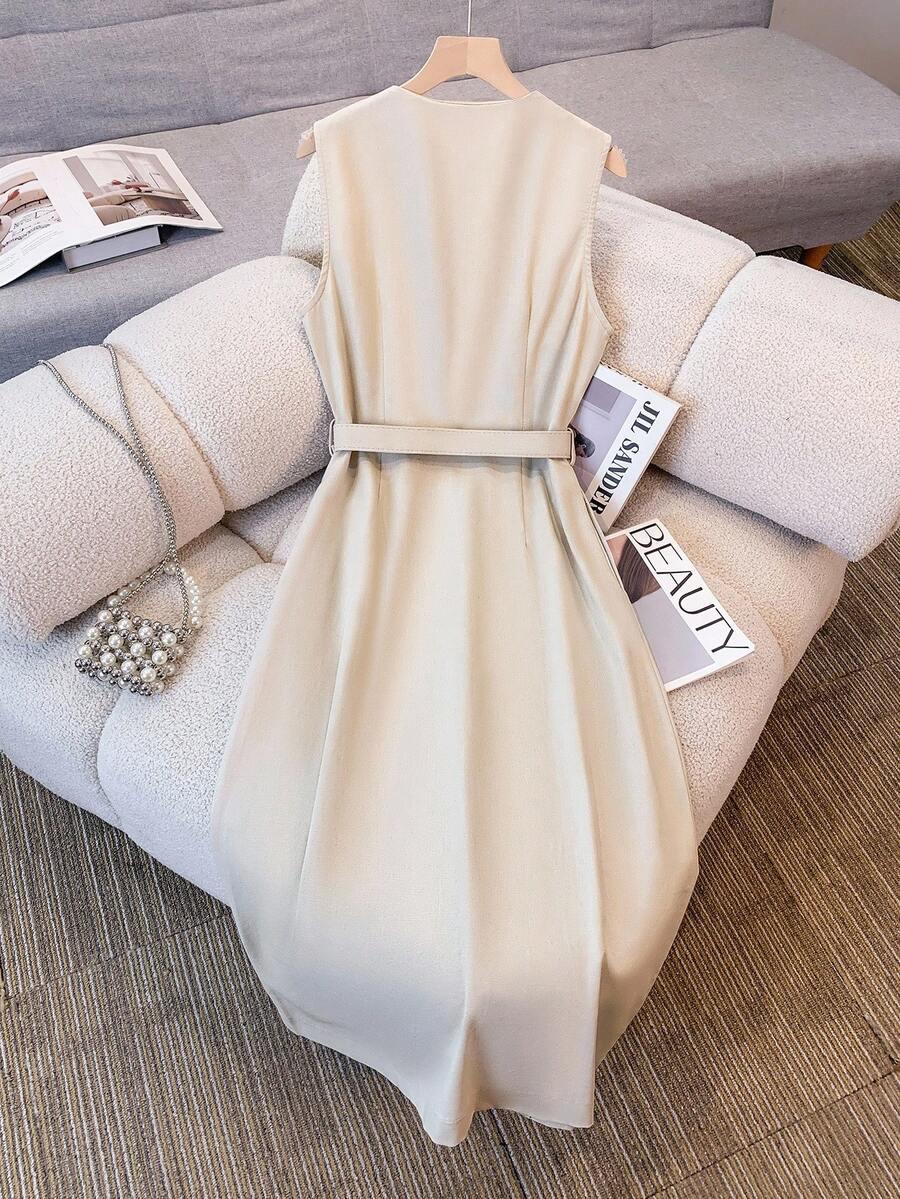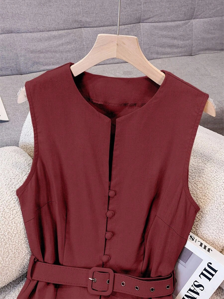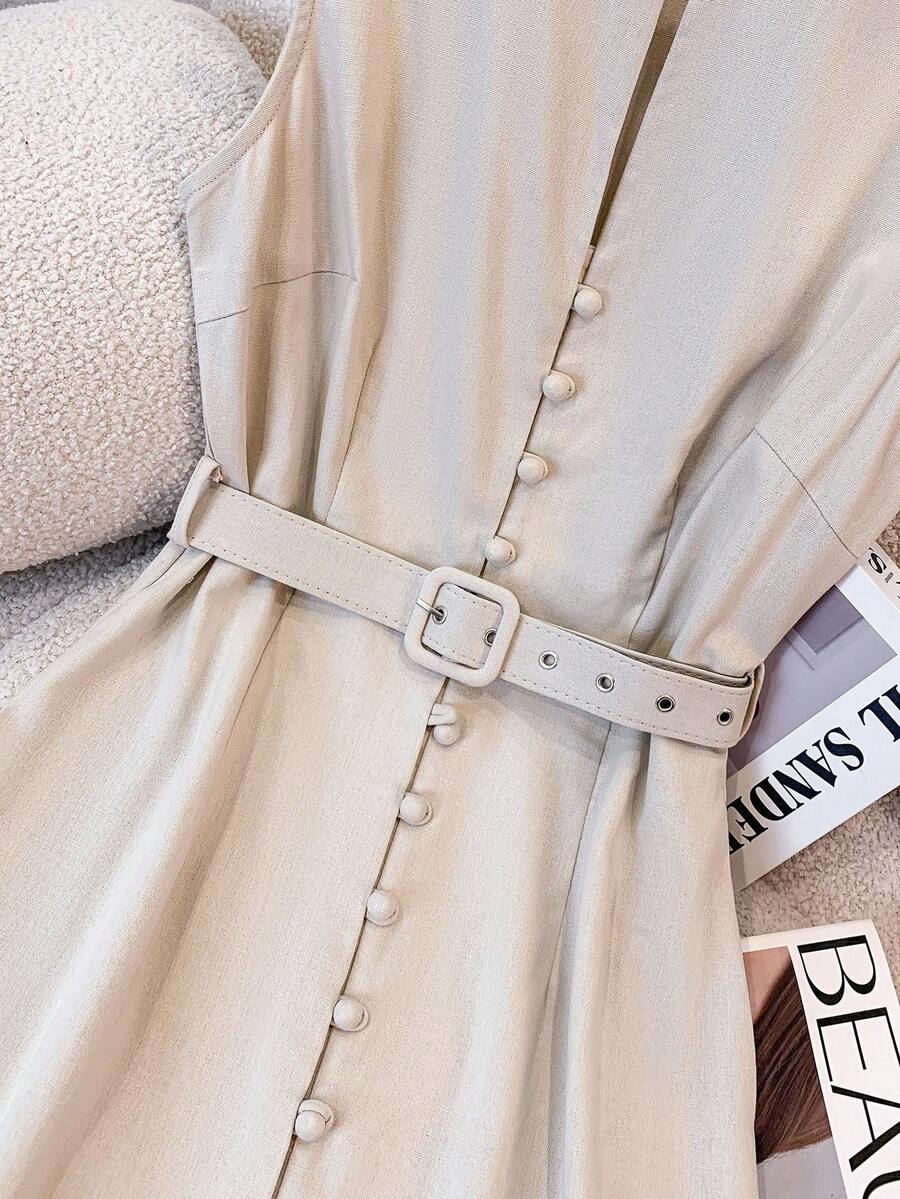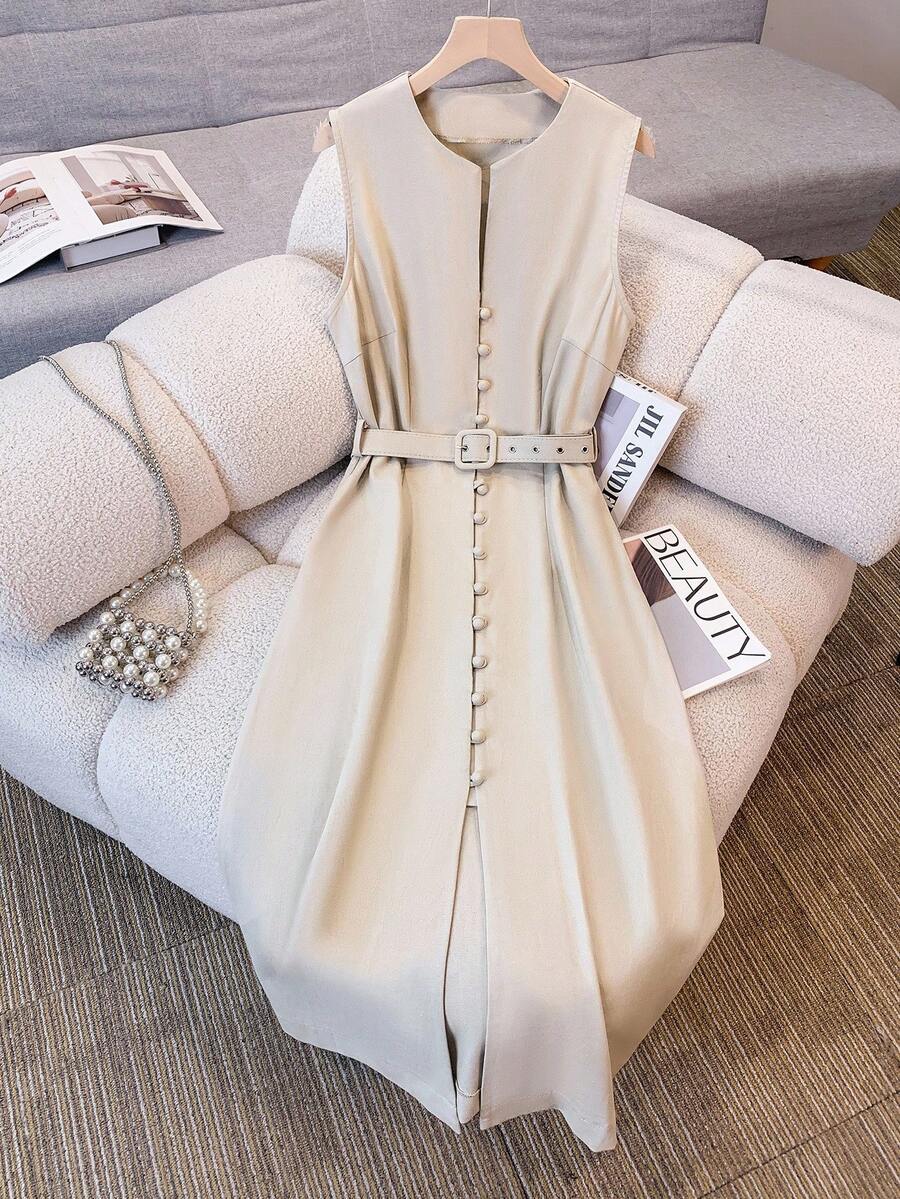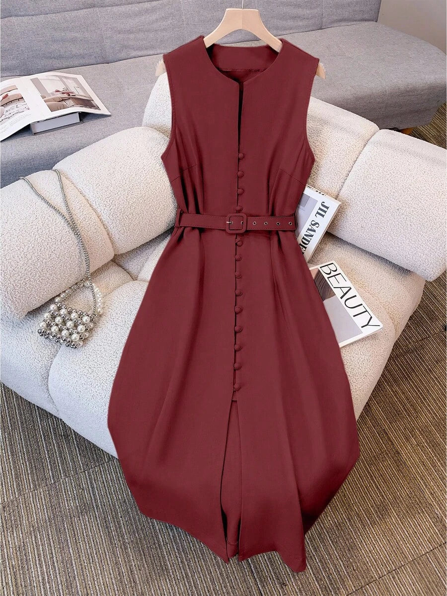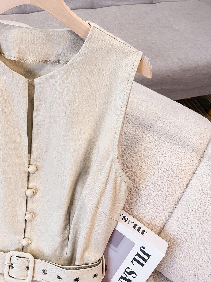 Vestido midi de lino sin mangas elegante y casual para mujer con cinturon