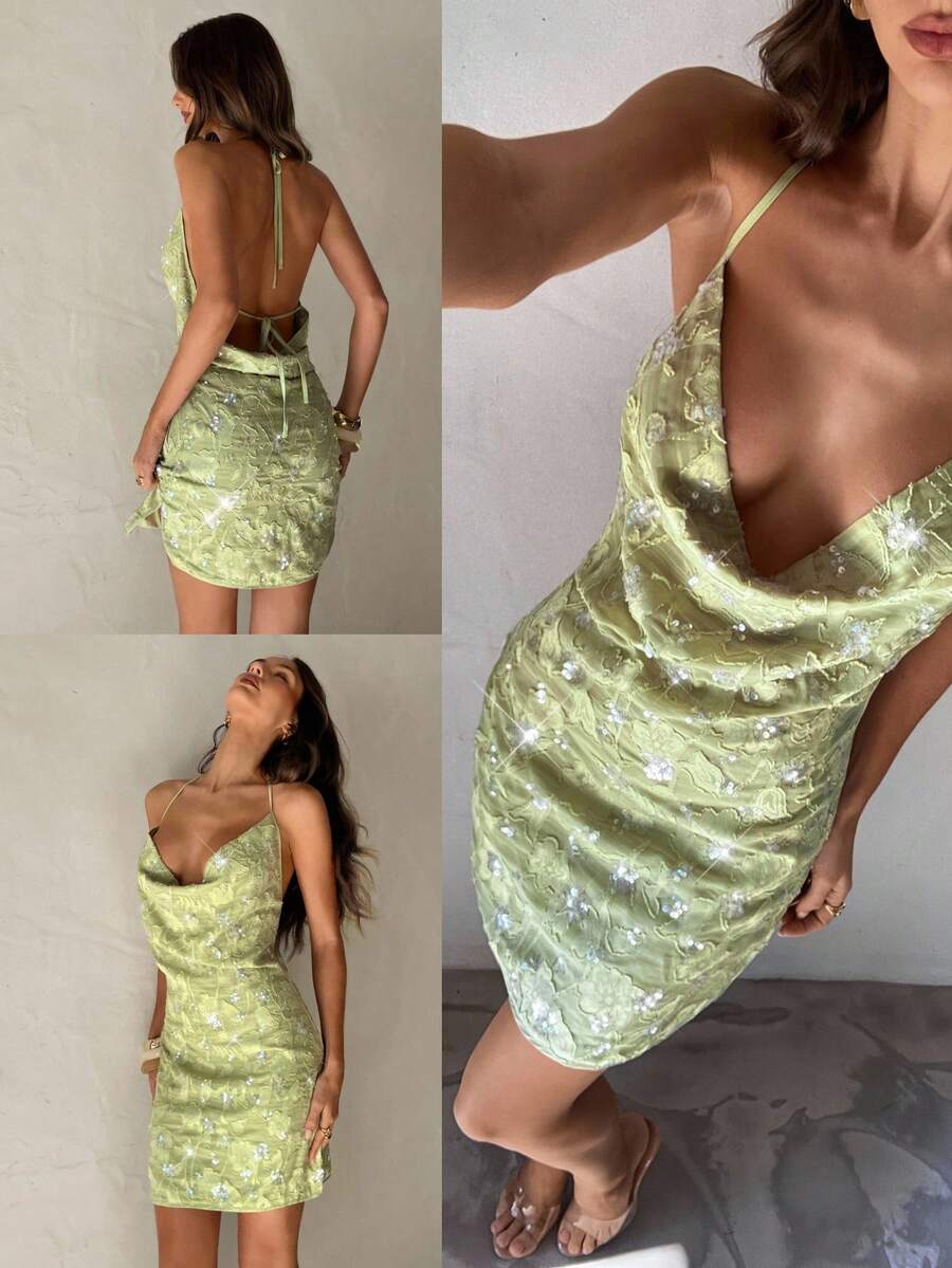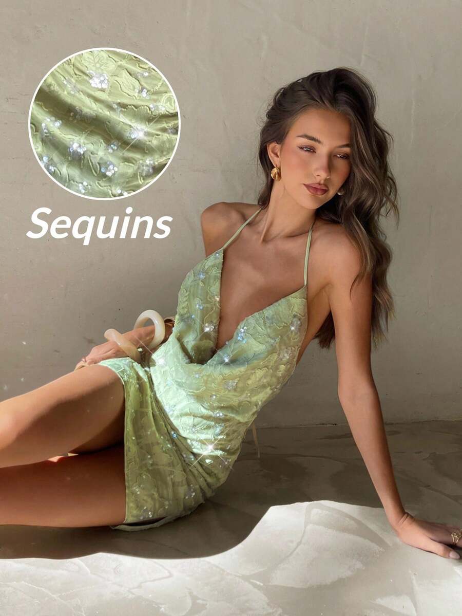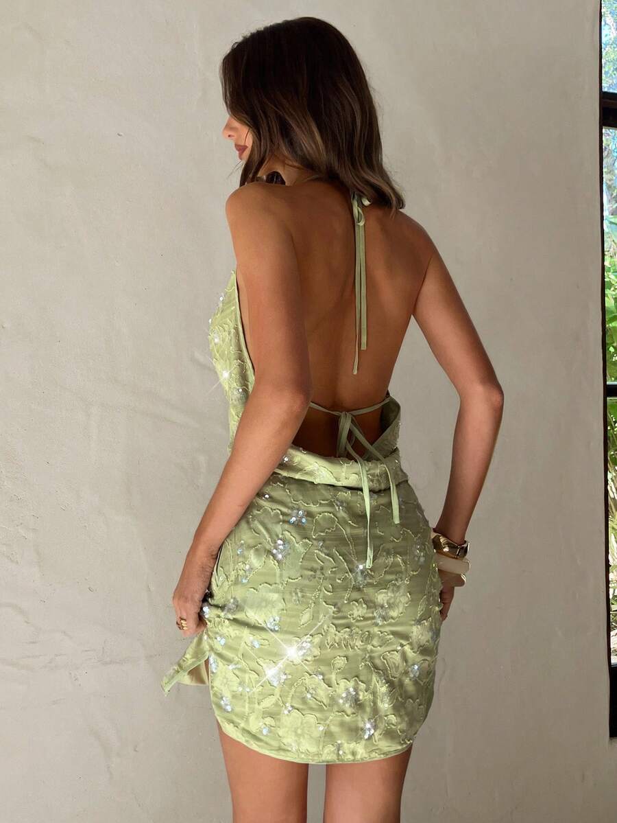 Vestido mini de lentejuelas con espalda descubierta y corte evase para mujer, vestido de fiesta de noche con bordado de flores verdes y cuentas para festival de musica