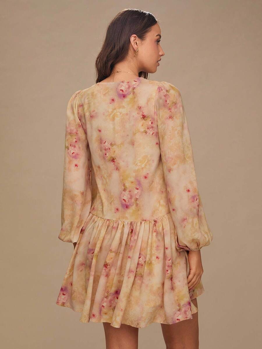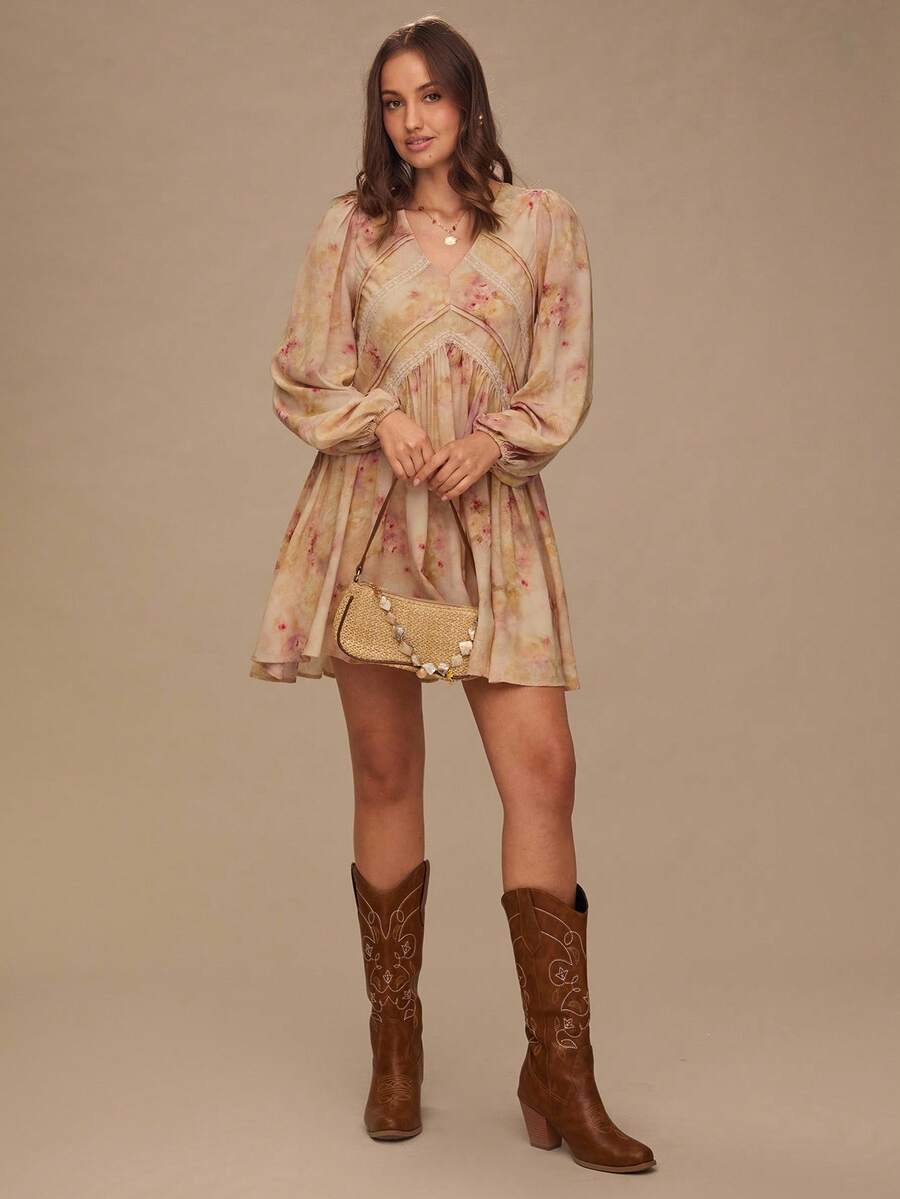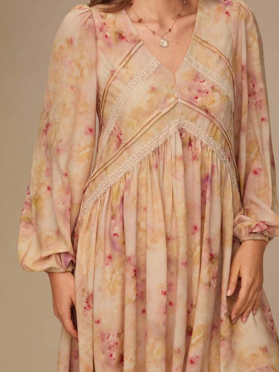 Vestido con estampado floral elegante y mangas de farol, adecuado para vacaciones