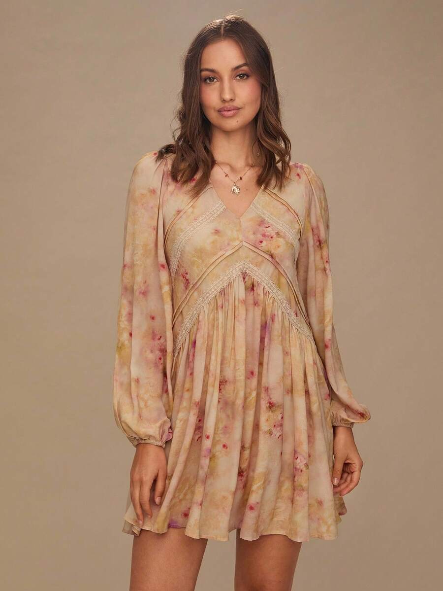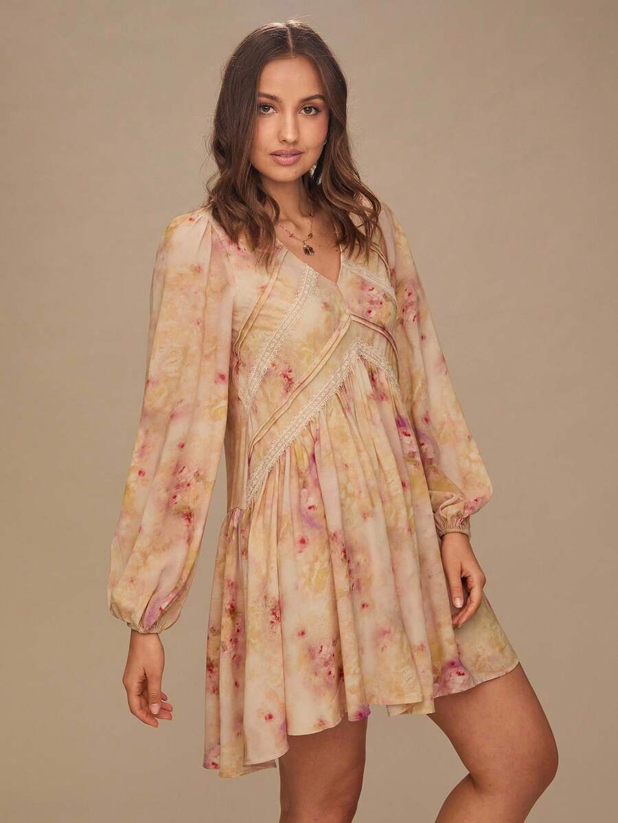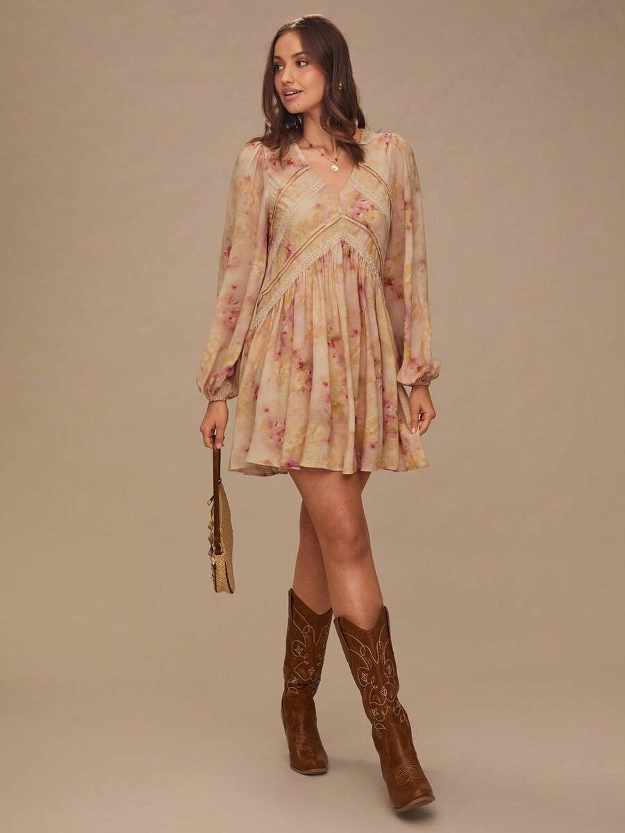 Vestido con estampado floral elegante y mangas de farol, adecuado para vacaciones
