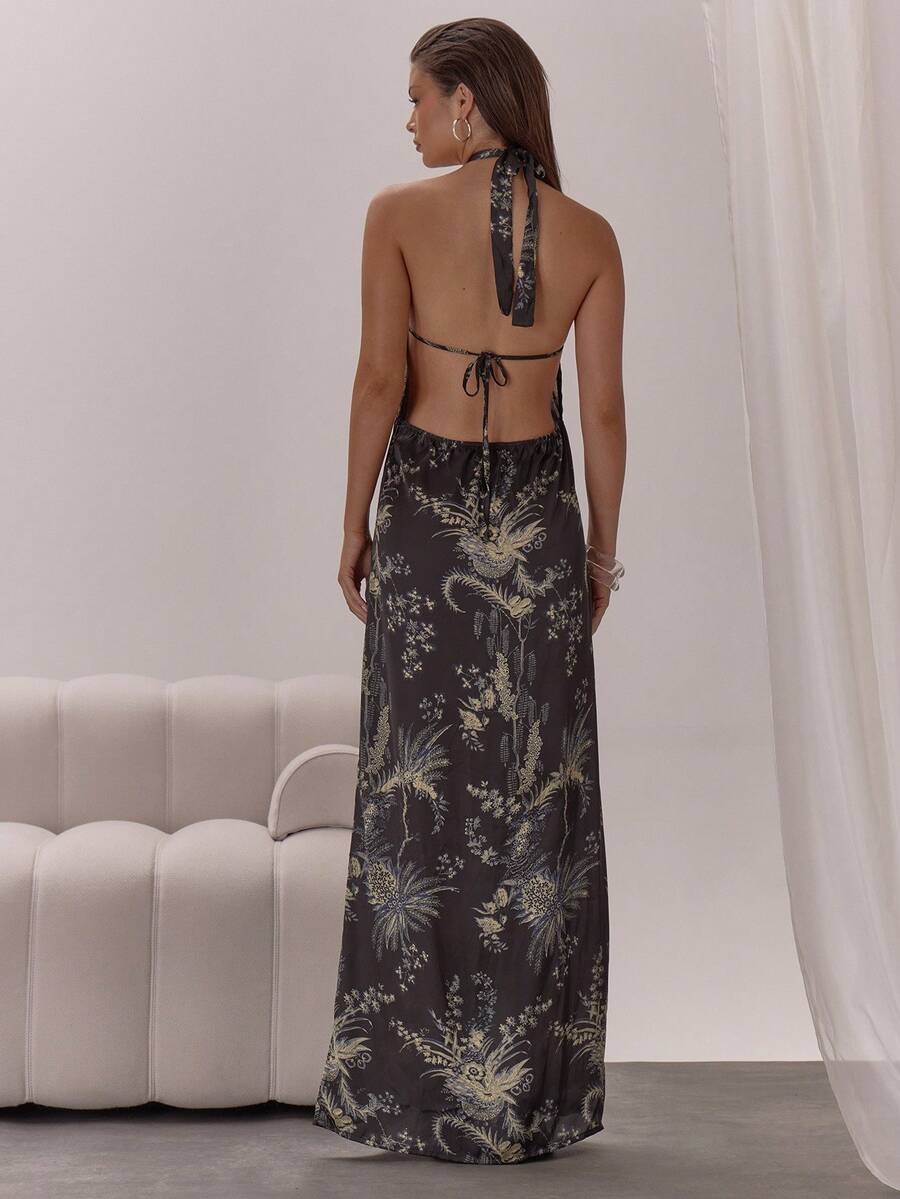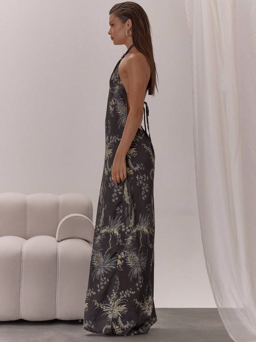 Vestido largo de saten con estampado, con detalles de ribete de cuello halter, elegante y sexy para ocasiones nocturnas, bodas, vacaciones y otono con capas
