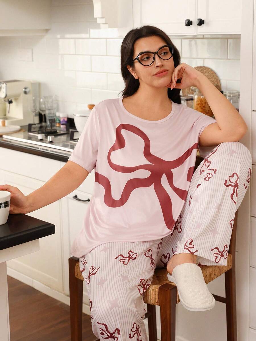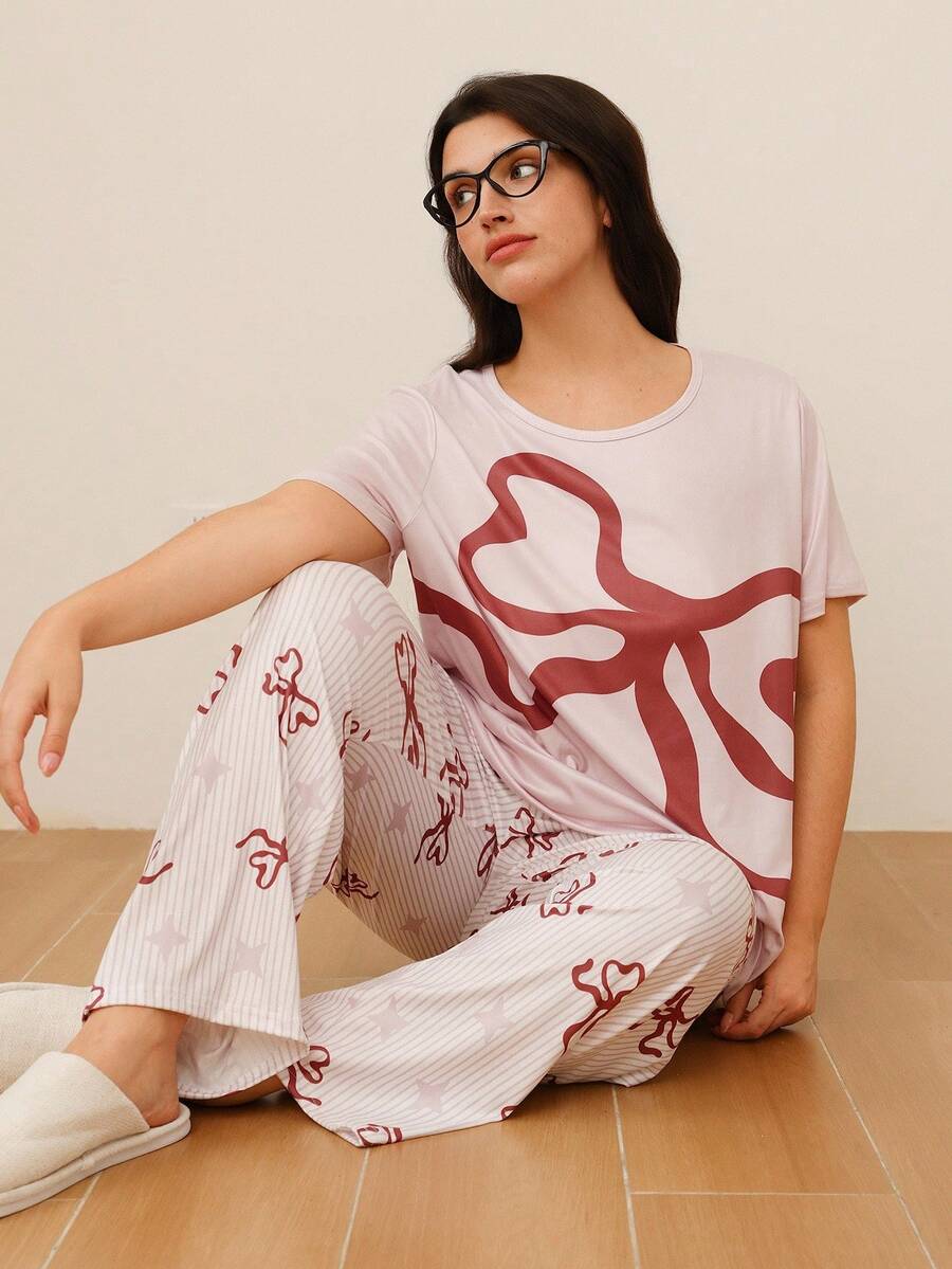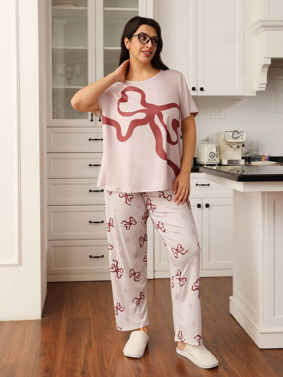 Zzzcrew conjunto de pijama de talla grande con pantalon estampado a todo color y camisa de manga corta con estampado de lazo y rayas