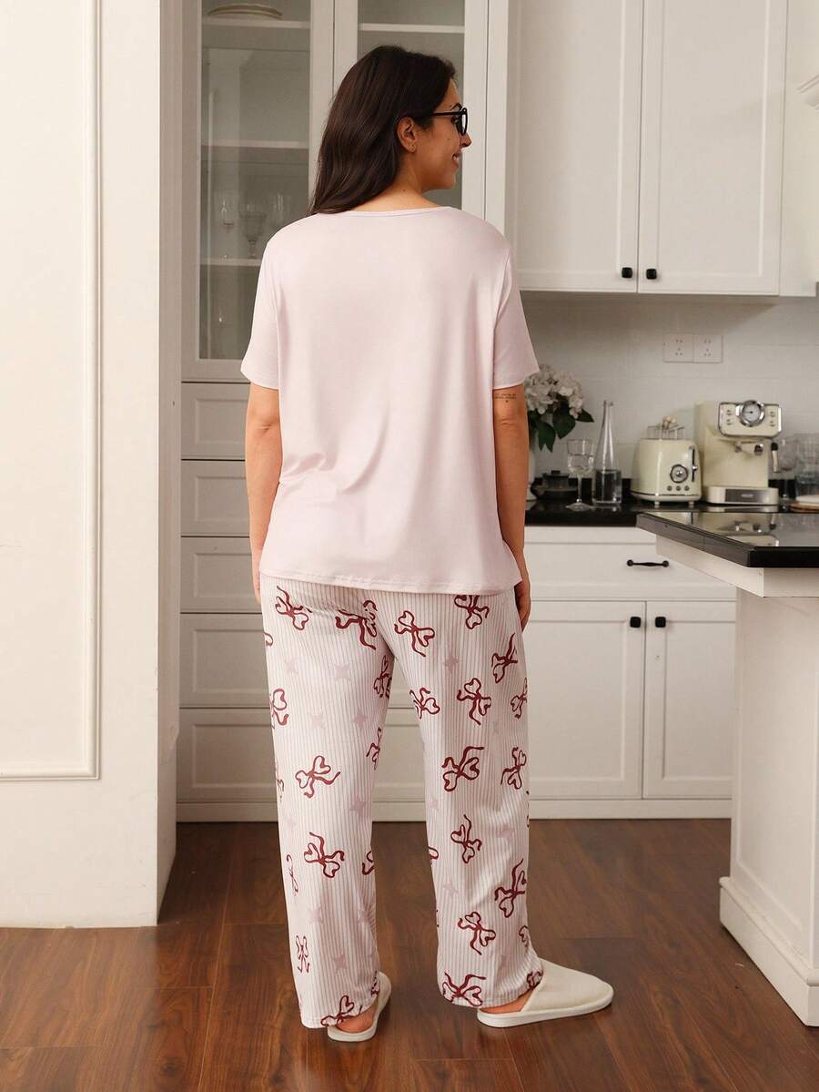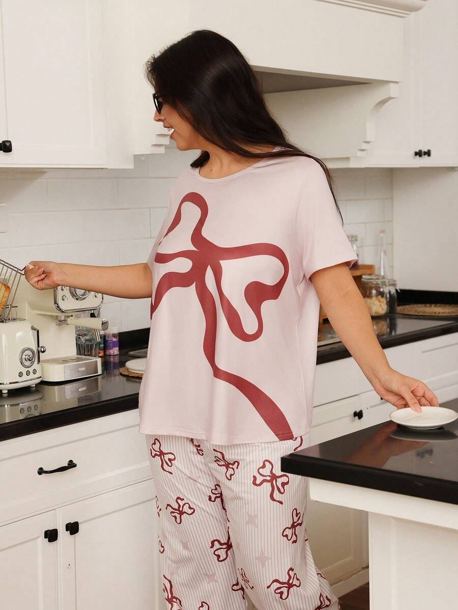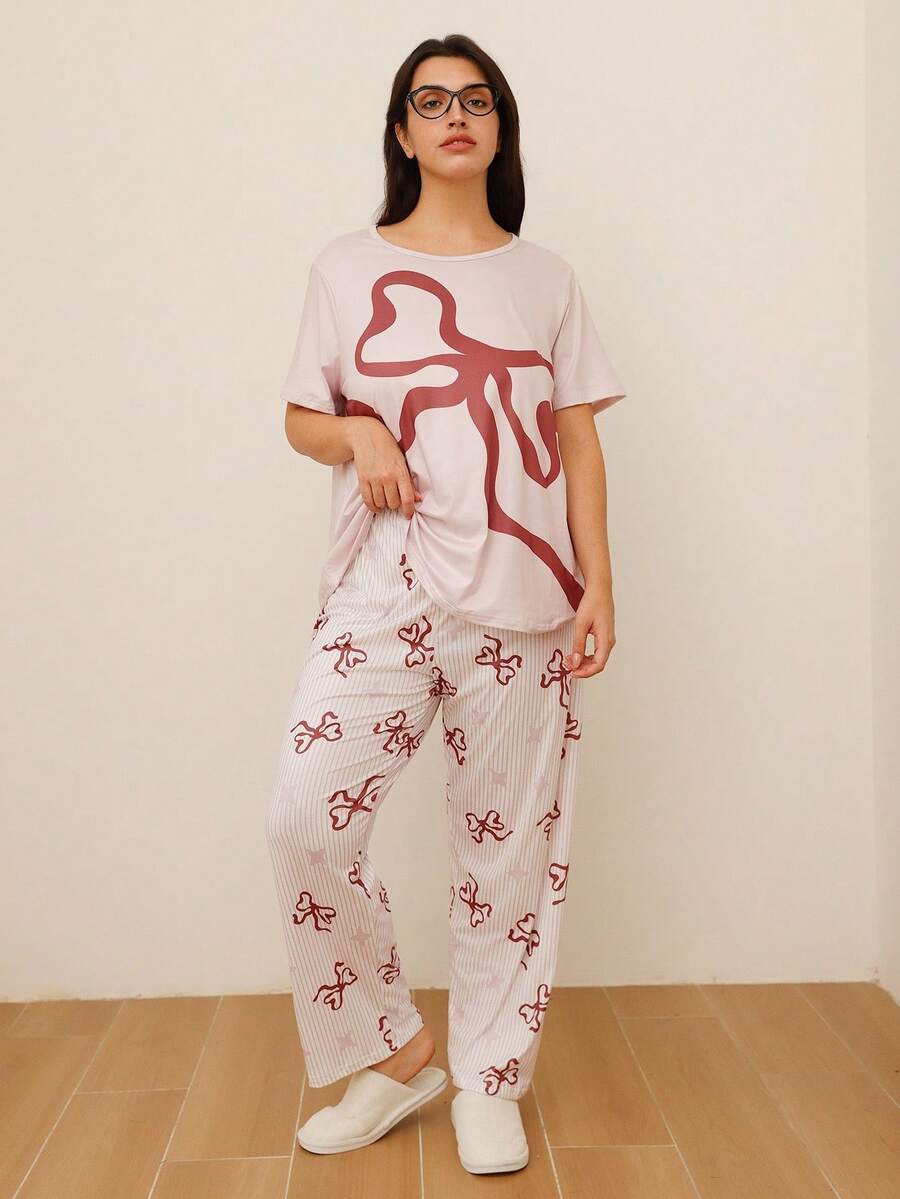 Zzzcrew conjunto de pijama de talla grande con pantalon estampado a todo color y camisa de manga corta con estampado de lazo y rayas
