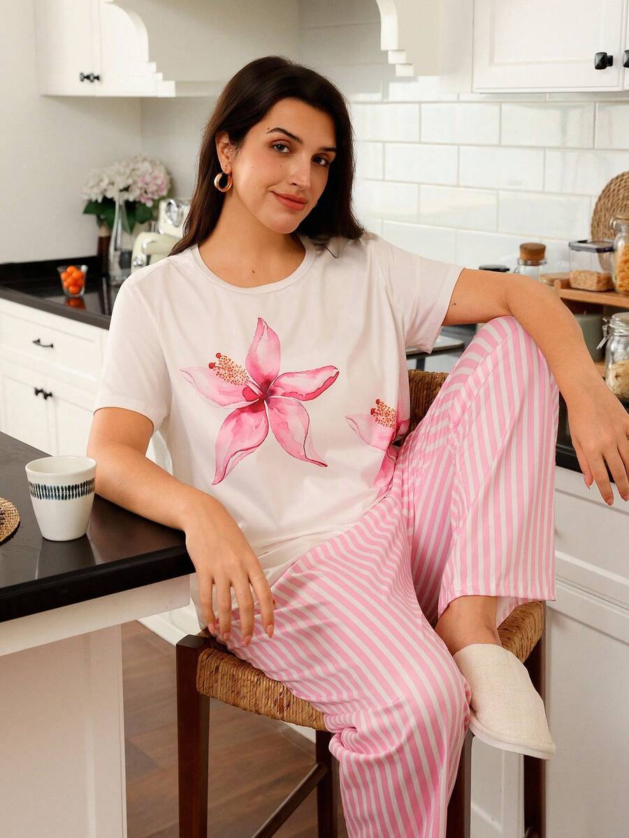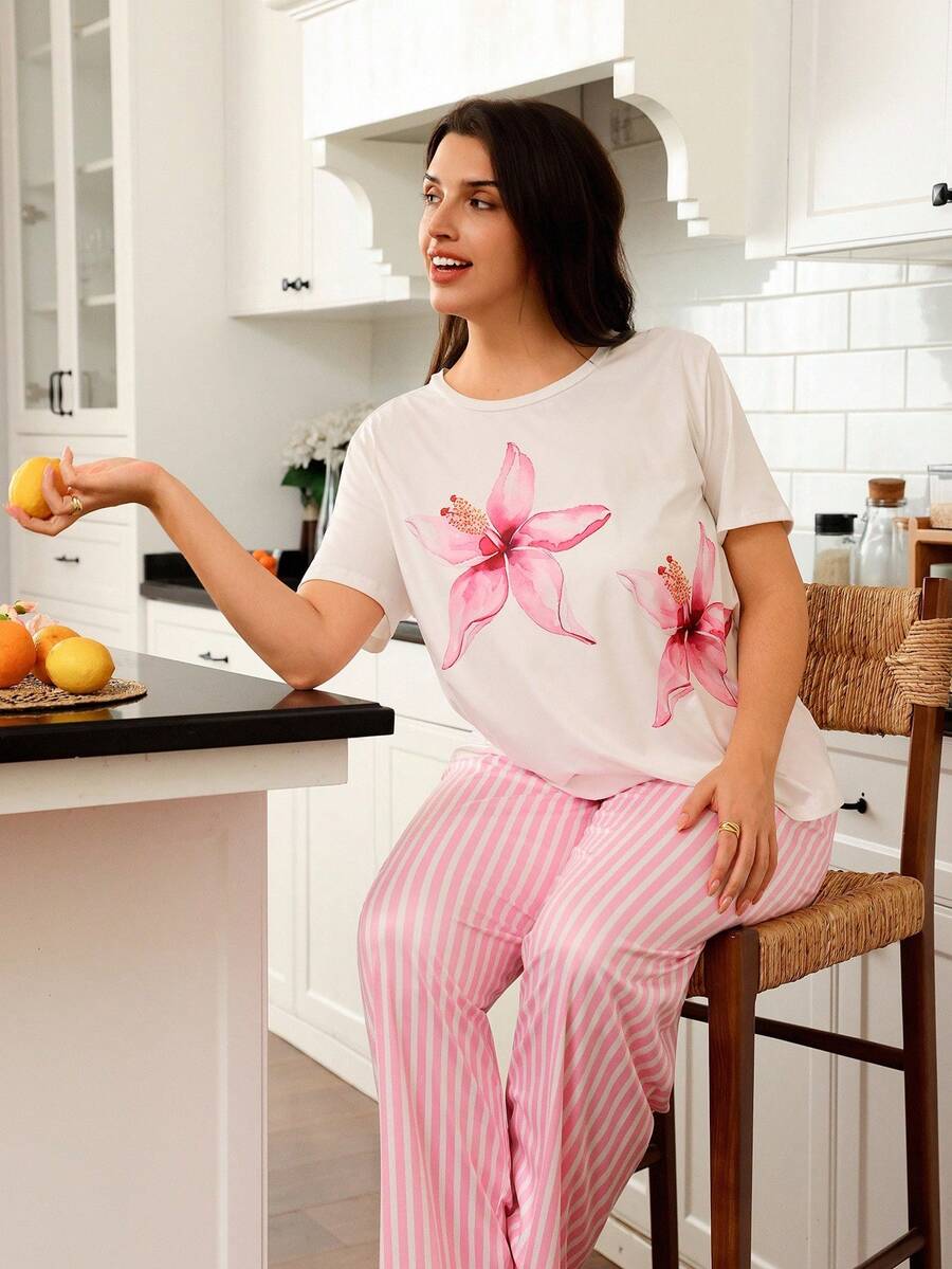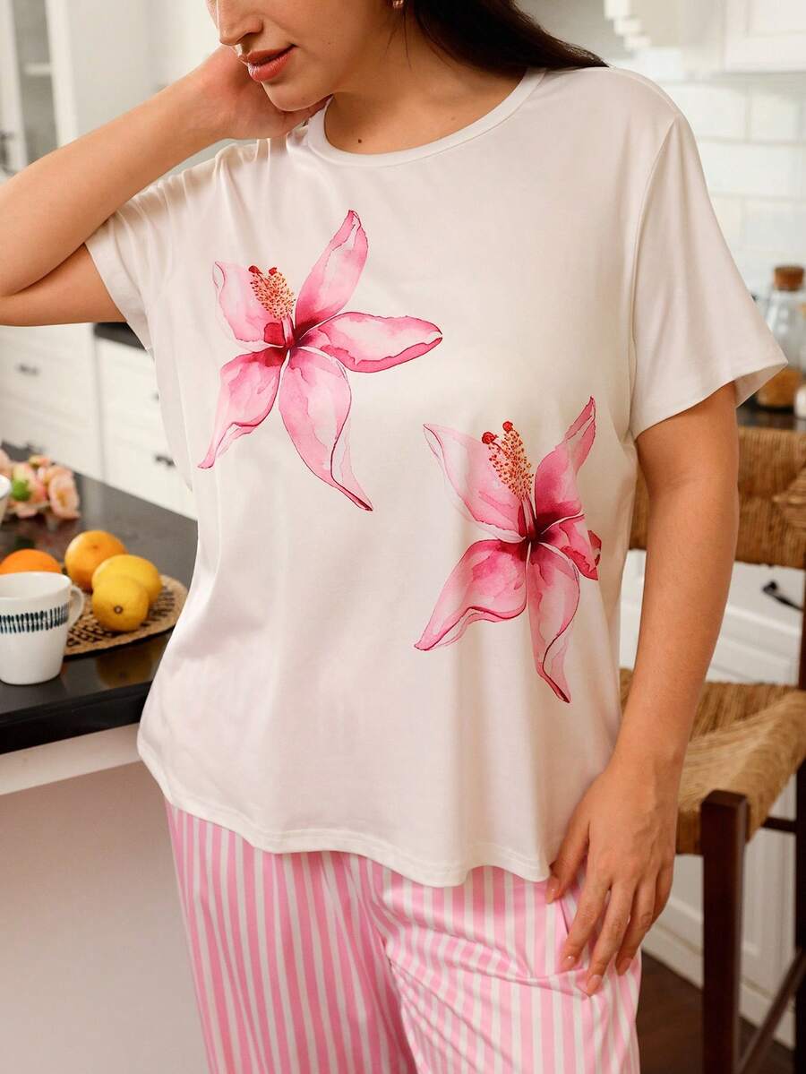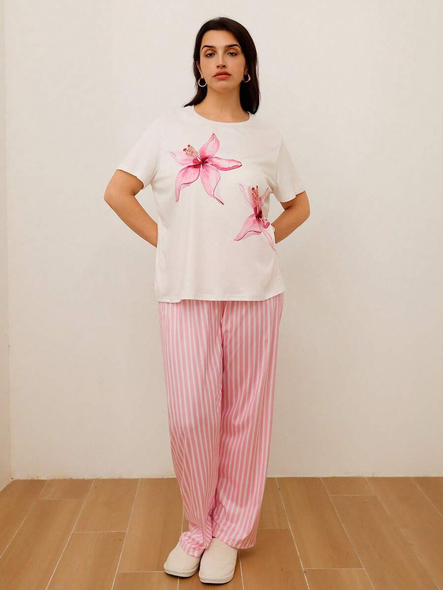 Zzzcrew conjunto de pijama de 2 piezas con top de manga corta con estampado floral y pantalon largo a rayas para mujer talla grande de zzzcrew