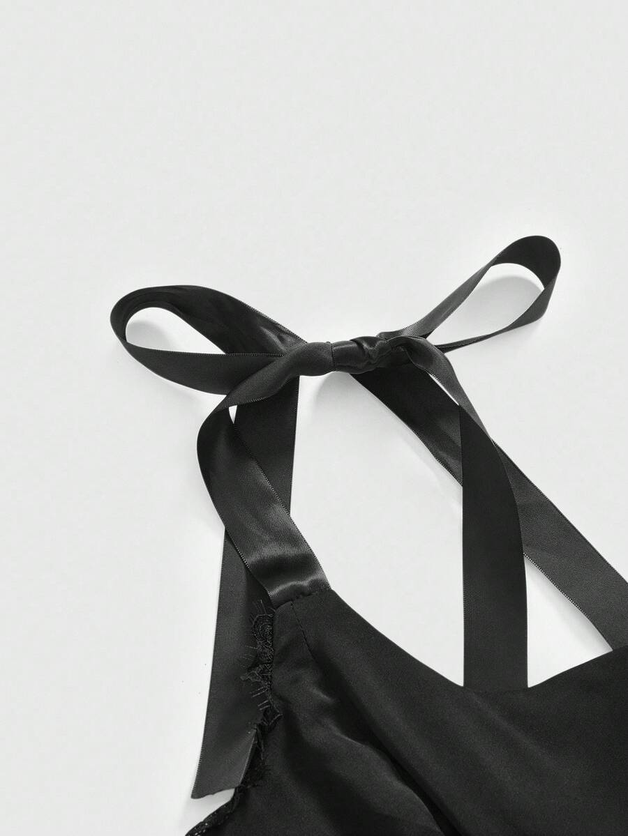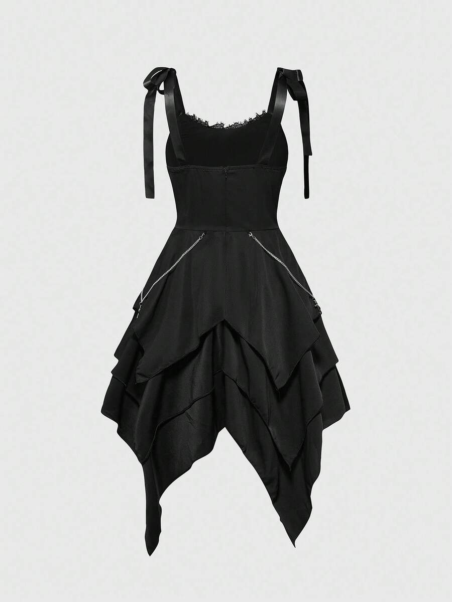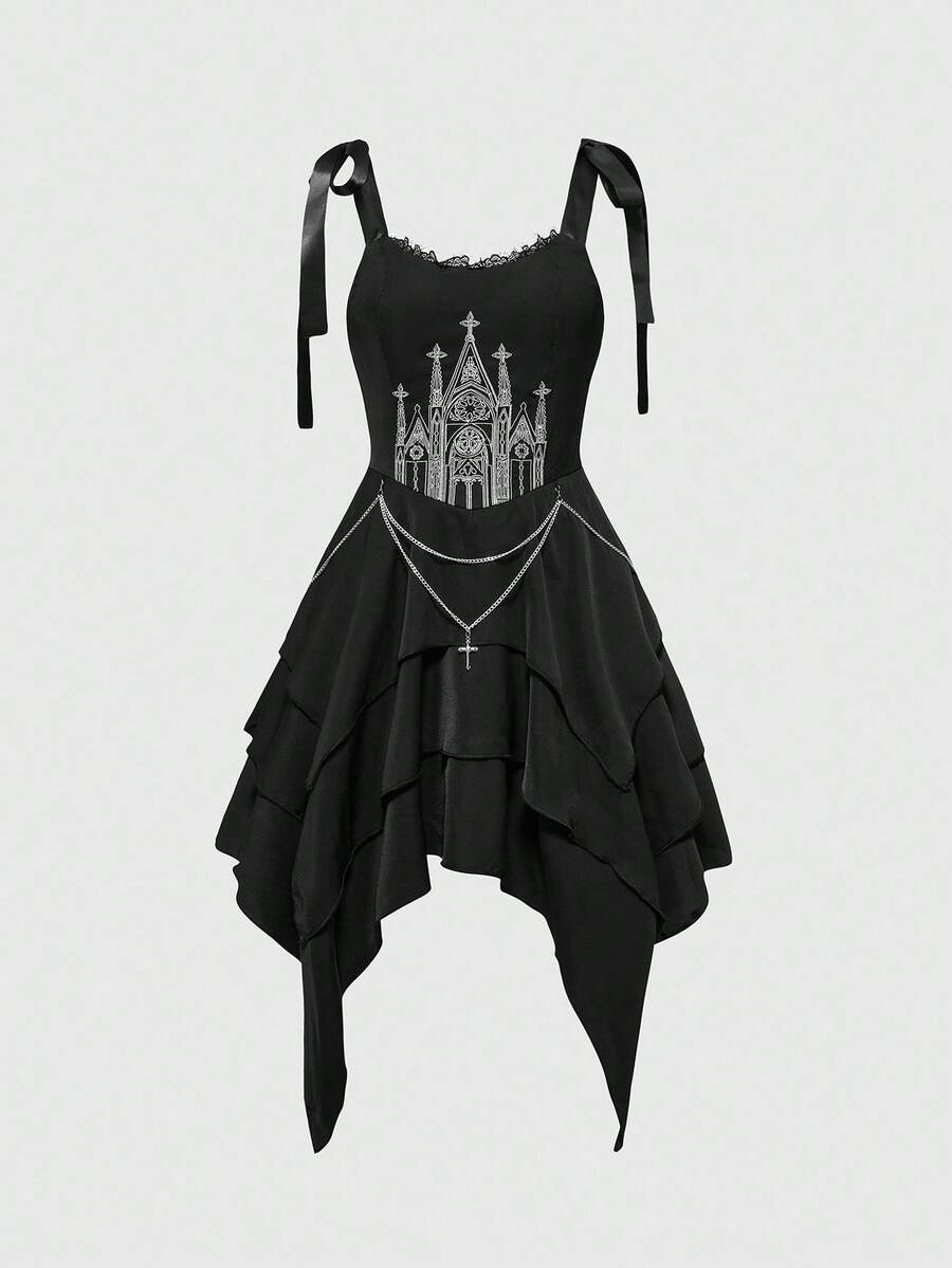 Vestido midi con decoracion de cadena cruzada, cuello cuadrado con encaje, bajo asimetrico y con volantes, estampado de castillo gotico de halloween