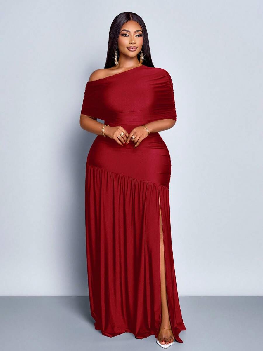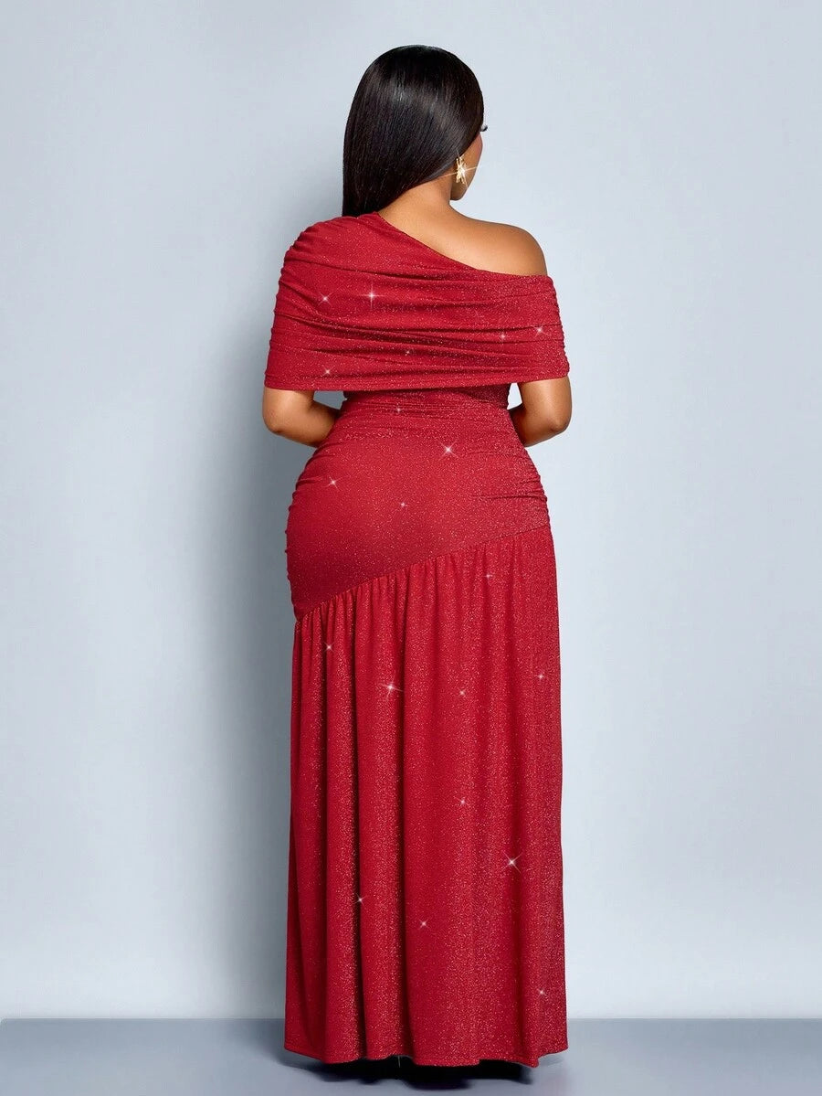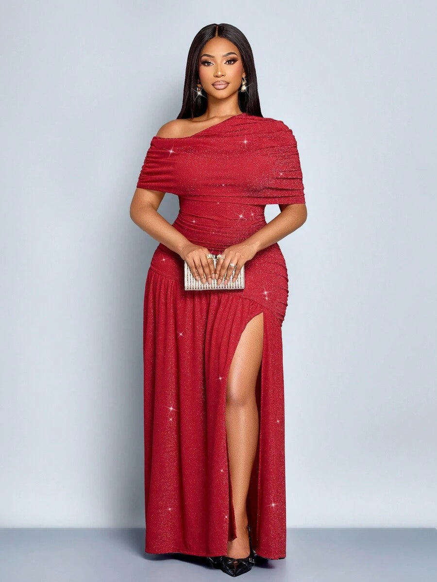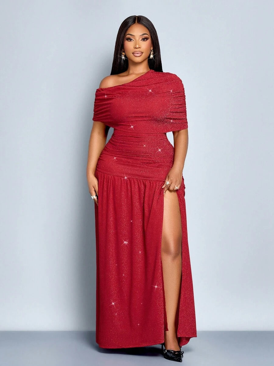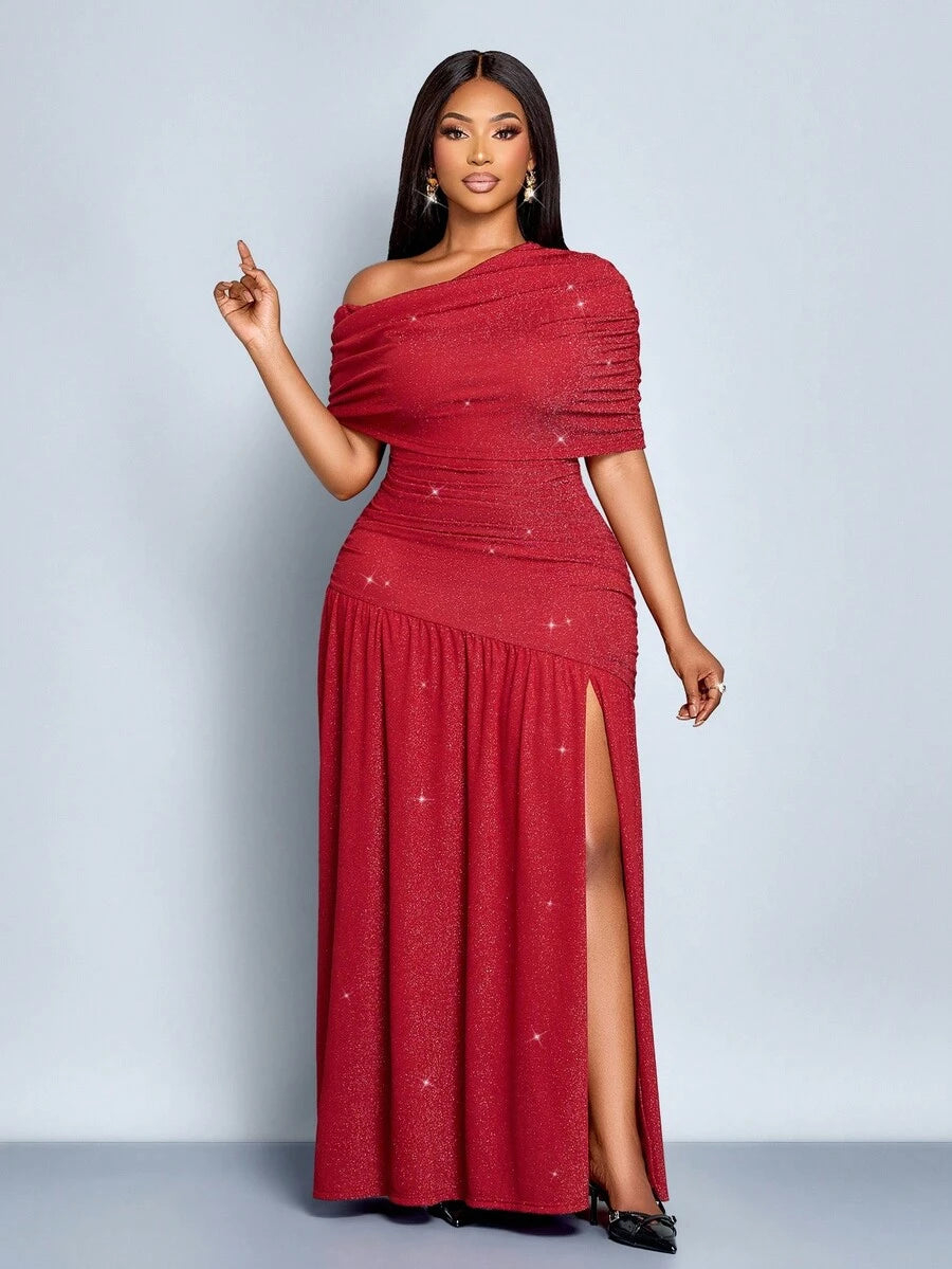 Vestido largo de punto con un hombro, cuello con volantes, abertura frontal y tela brillante roja elegante para fiesta, para mujer de talla grande