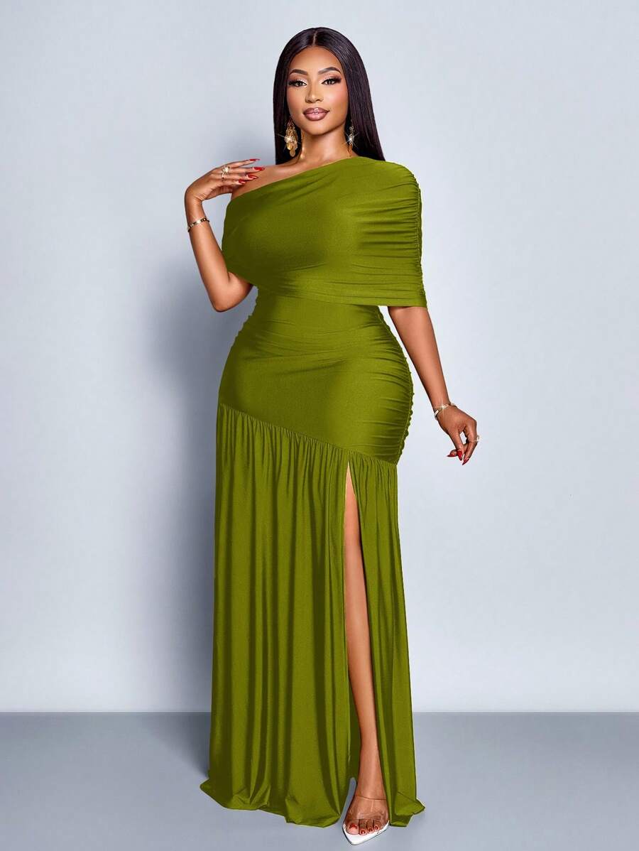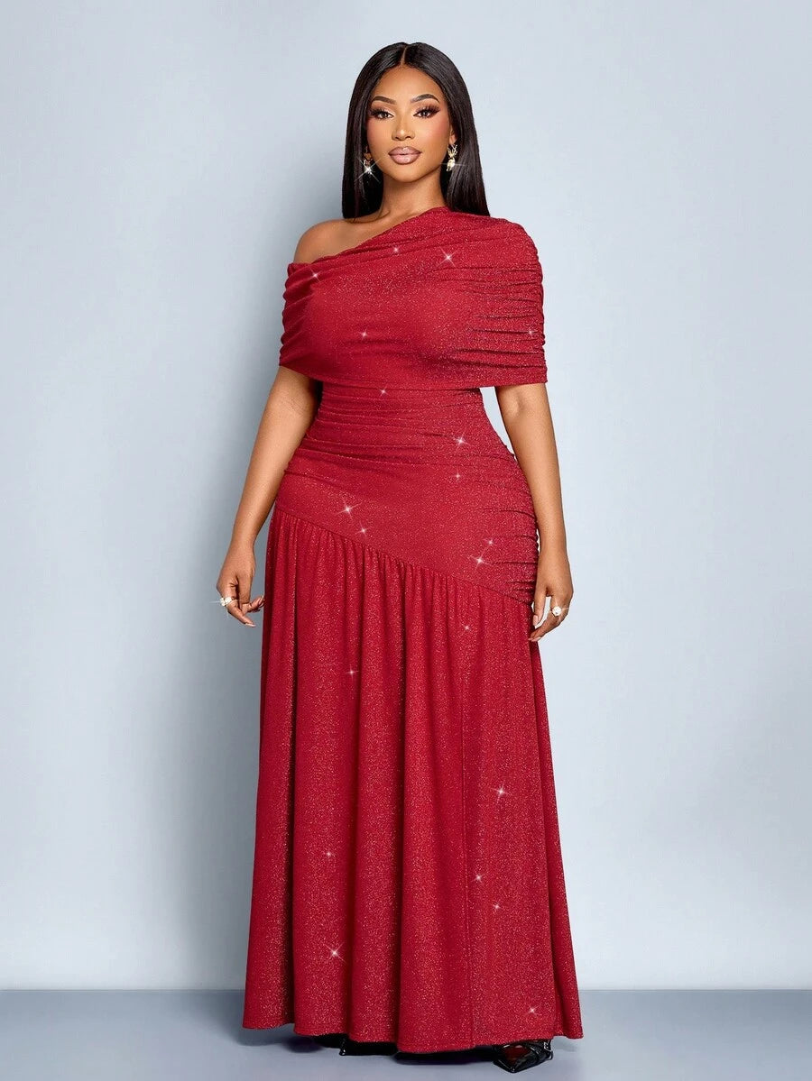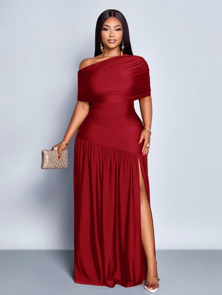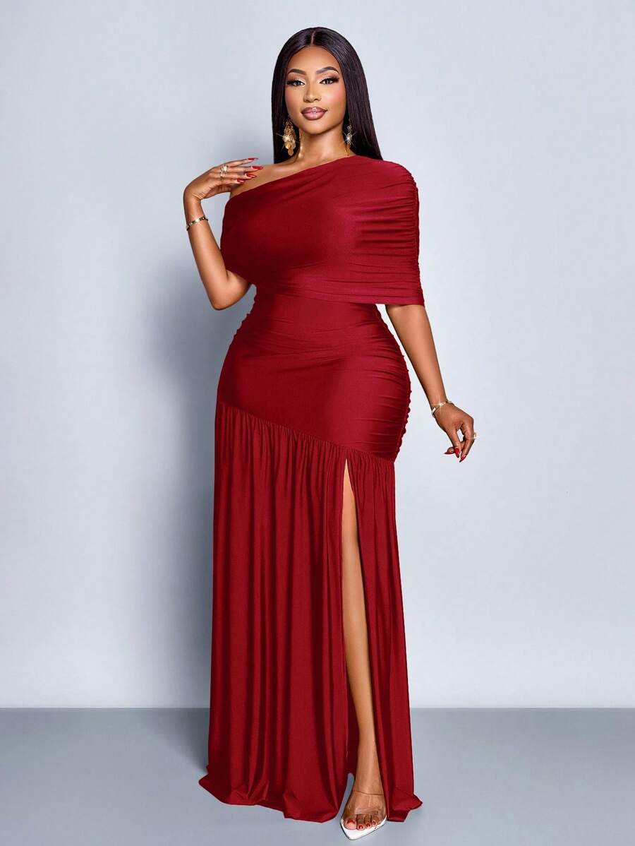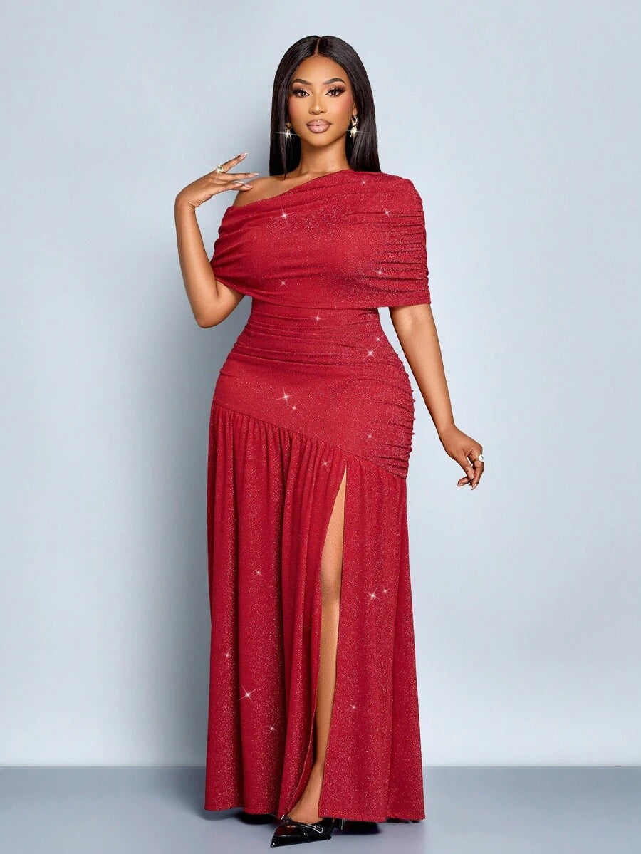 Vestido largo de punto con un hombro, cuello con volantes, abertura frontal y tela brillante roja elegante para fiesta, para mujer de talla grande