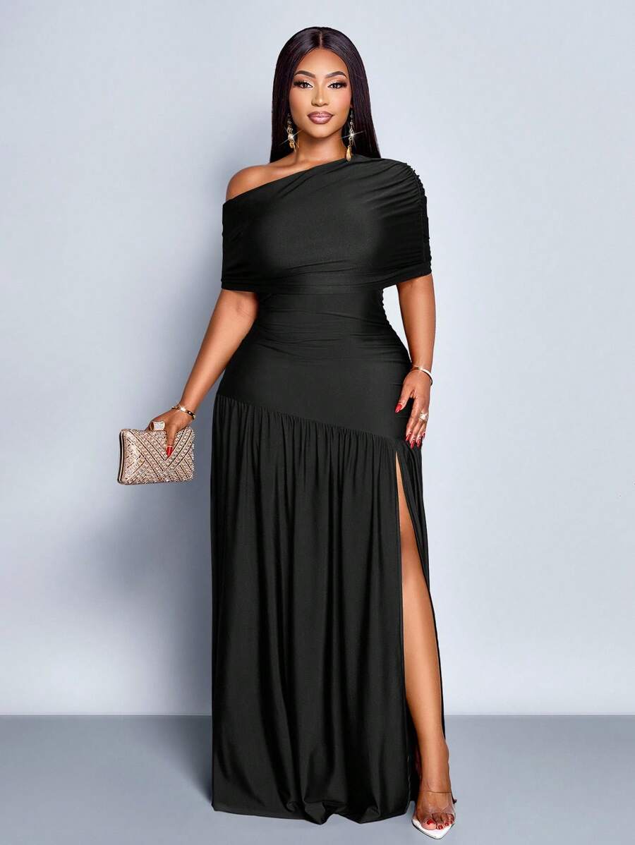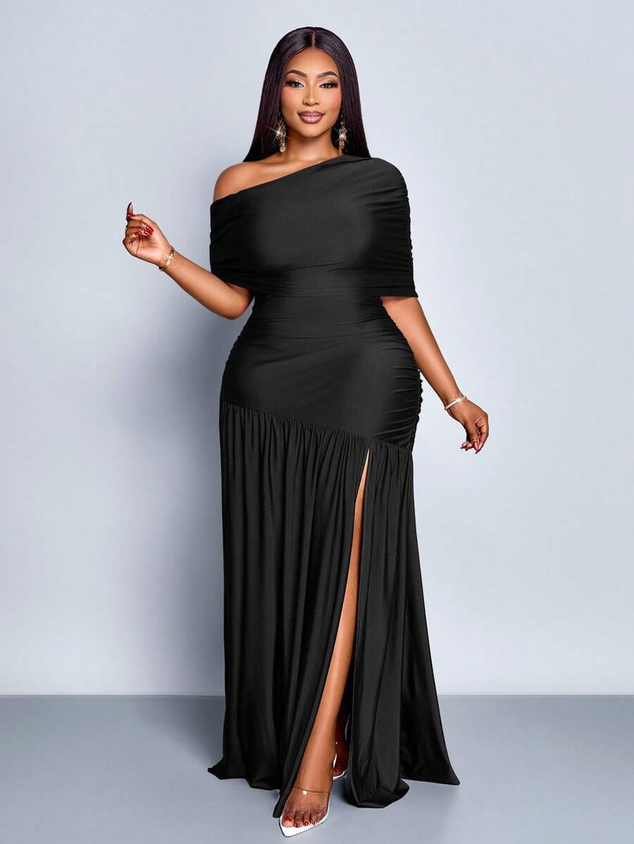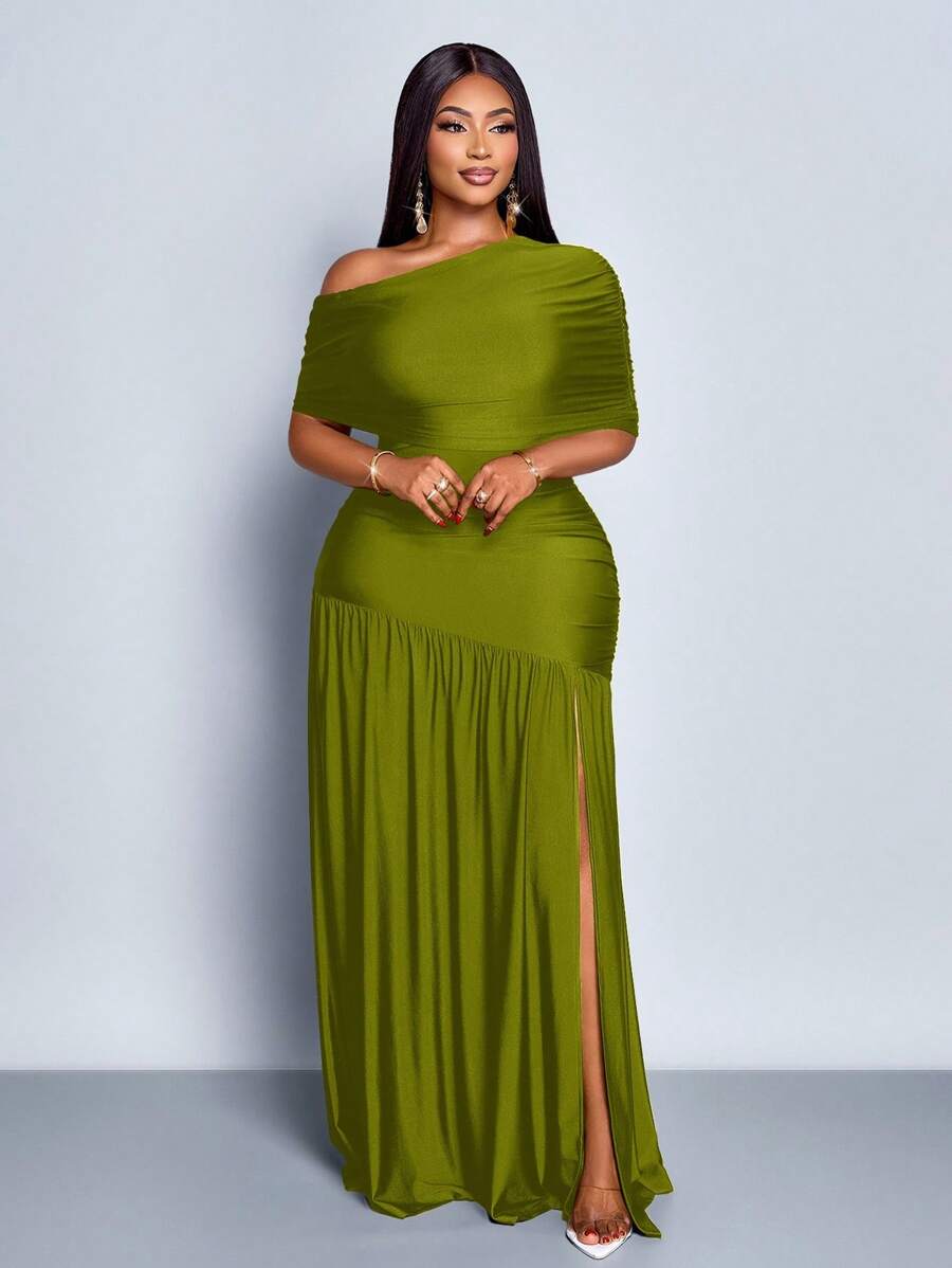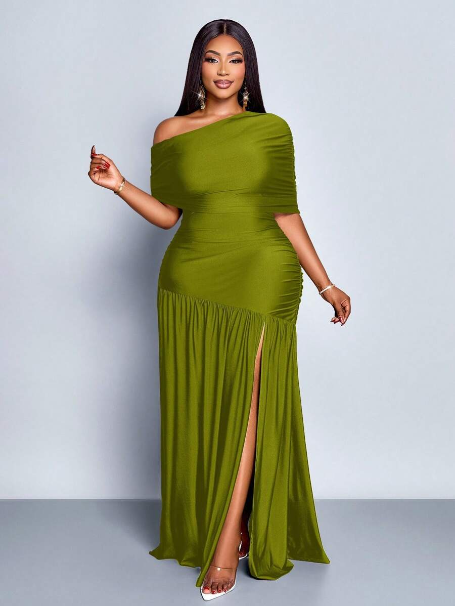 Vestido largo de punto con un hombro, cuello con volantes, abertura frontal y tela brillante roja elegante para fiesta, para mujer de talla grande