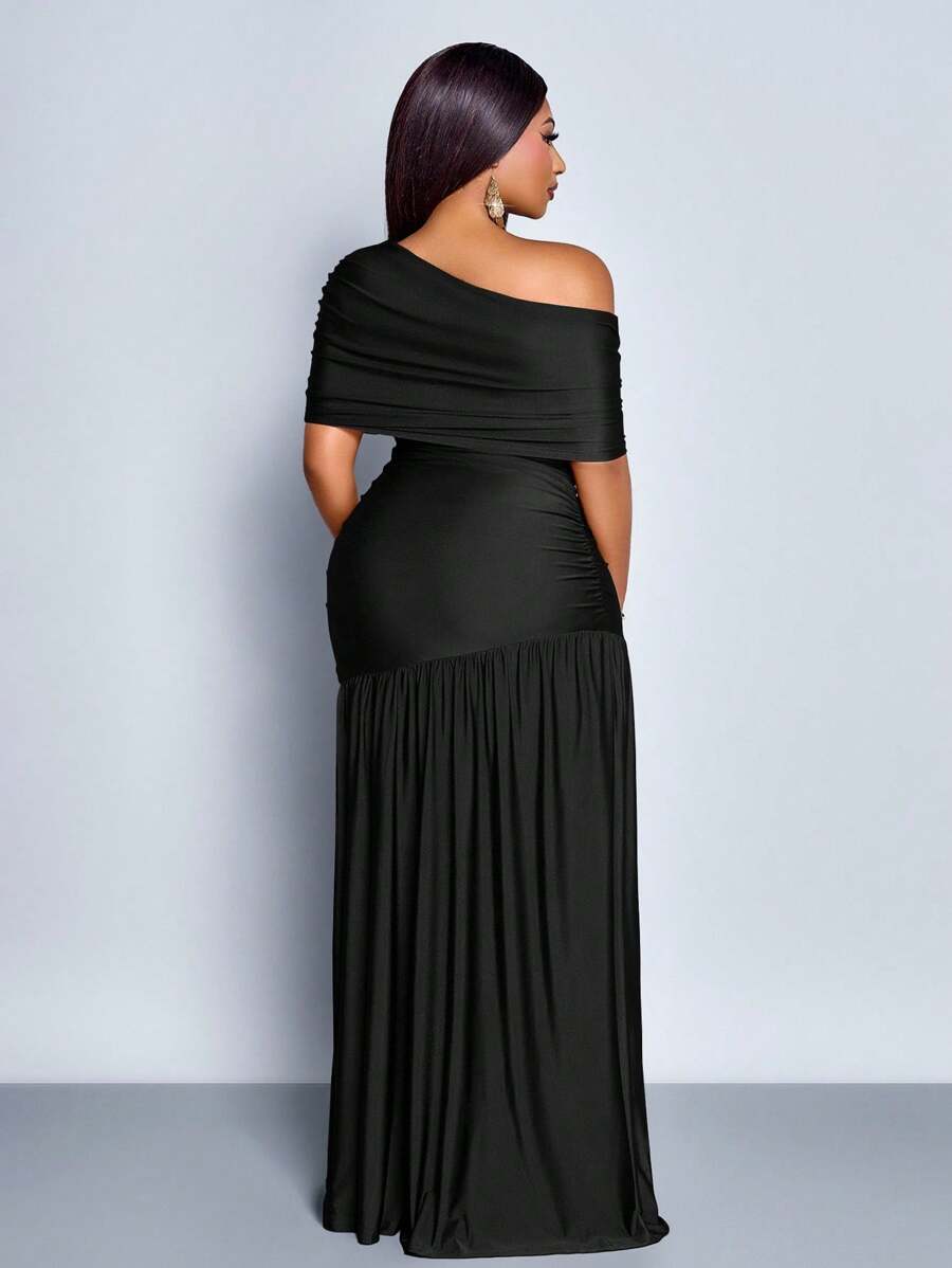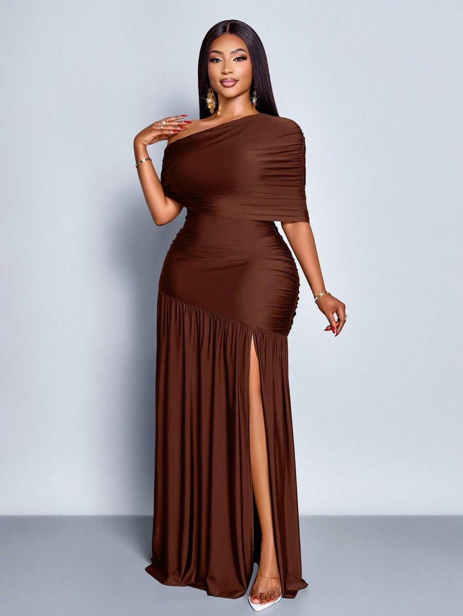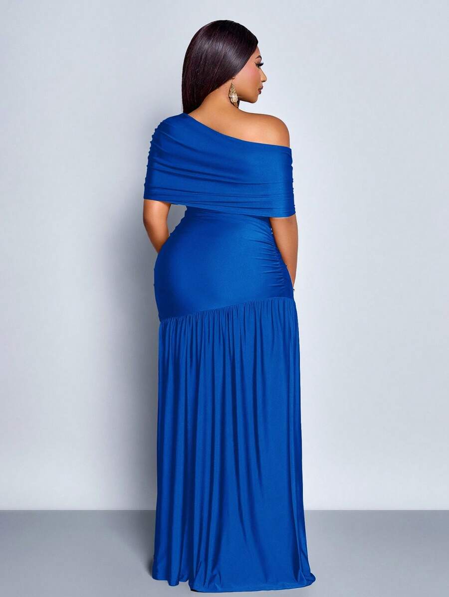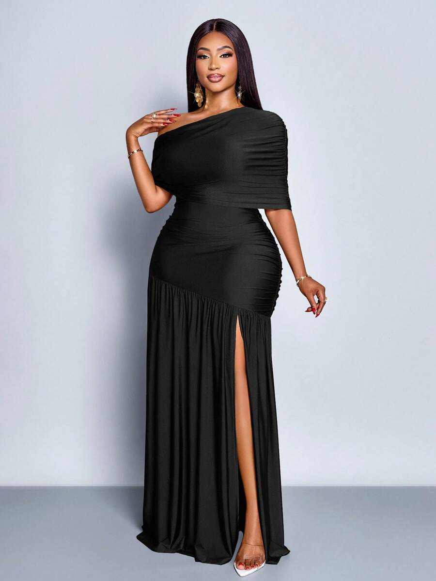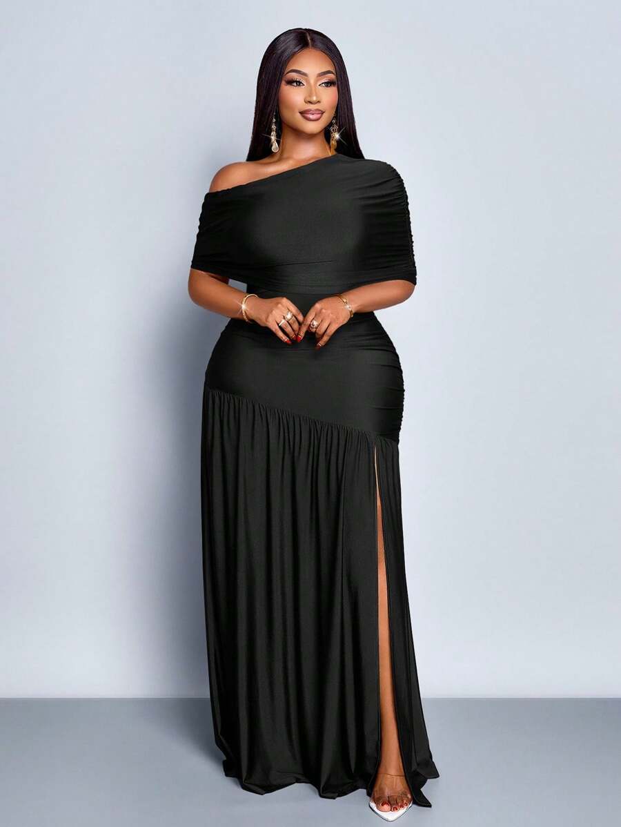 Vestido largo de punto con un hombro, cuello con volantes, abertura frontal y tela brillante roja elegante para fiesta, para mujer de talla grande