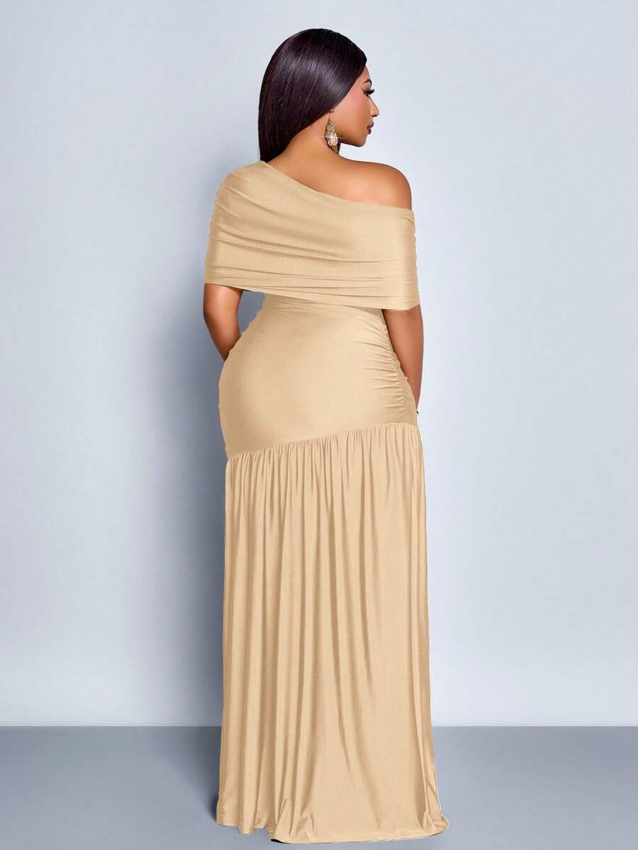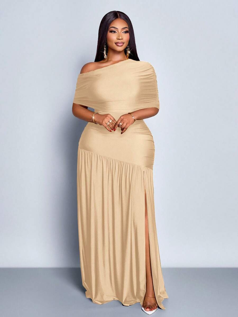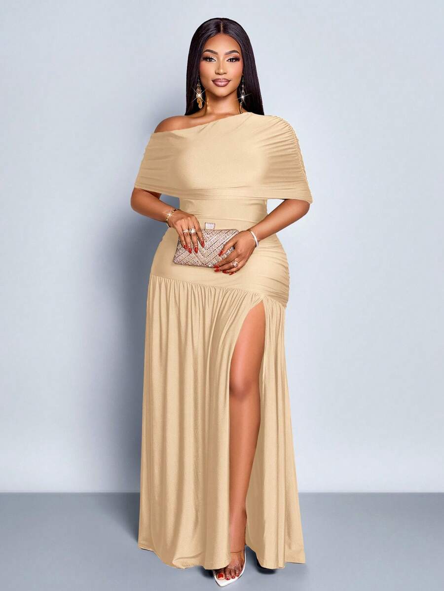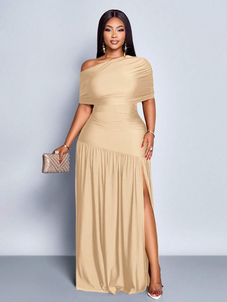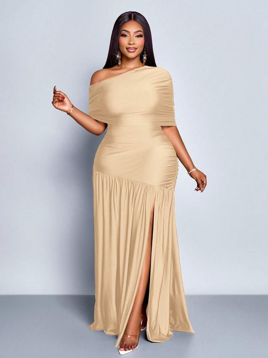 Vestido largo de punto con un hombro, cuello con volantes, abertura frontal y tela brillante roja elegante para fiesta, para mujer de talla grande
