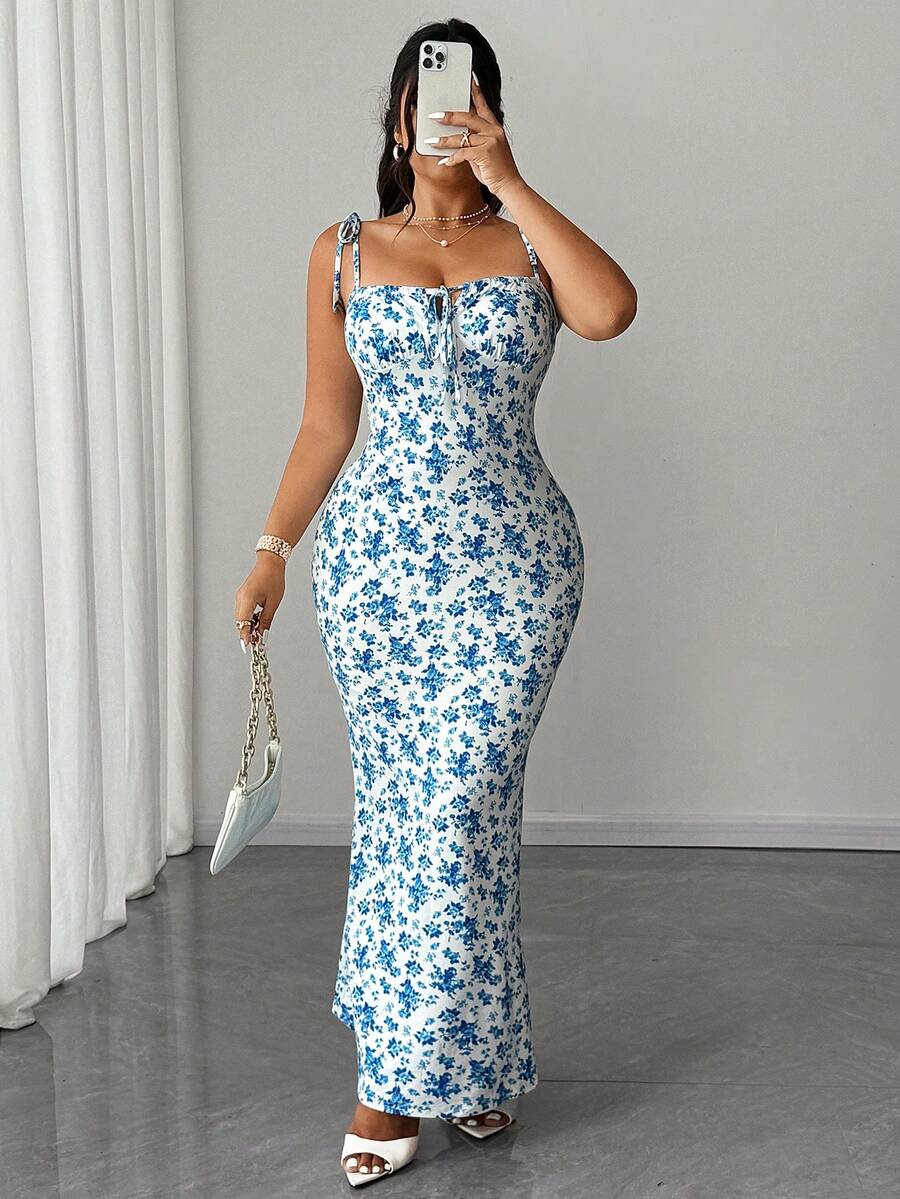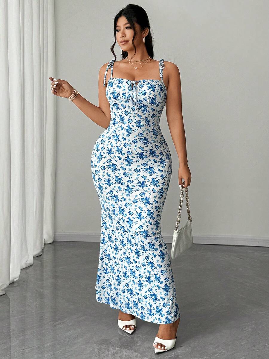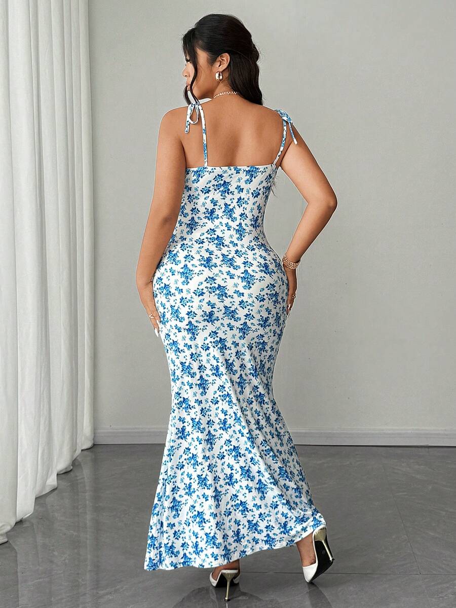 Vestido elegante de talla grande para mujer con tirantes finos, estampado floral diminuto y dobladillo de cola de pez ajustado