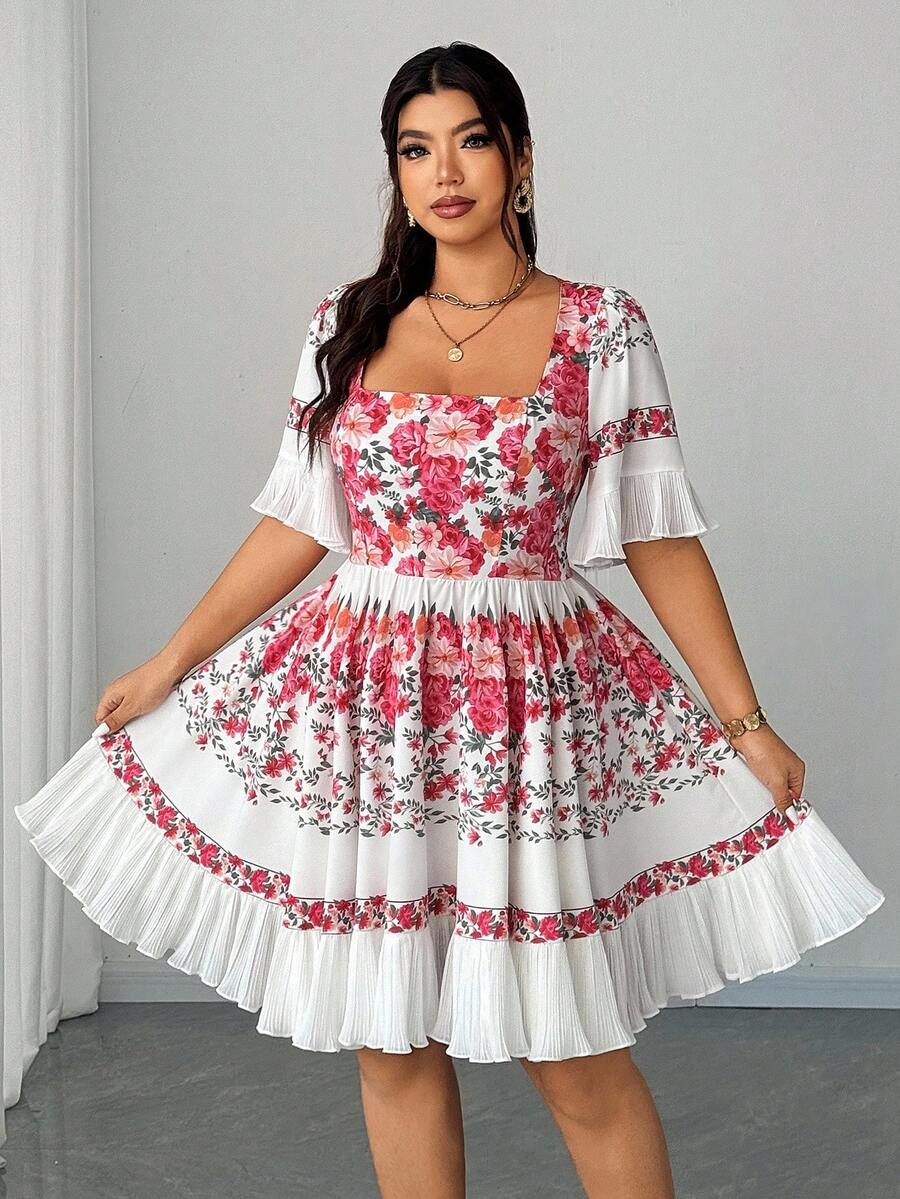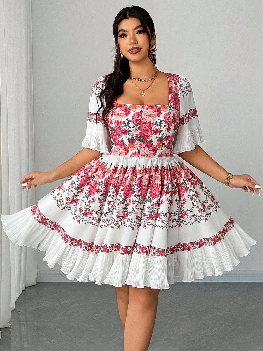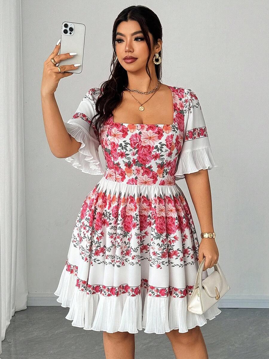 Vestido elegante de mujer talla grande con cuello cuadrado, mangas acampanadas y volantes en el bajo, con estampado floral