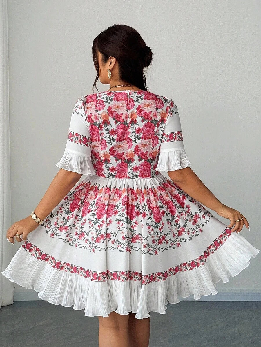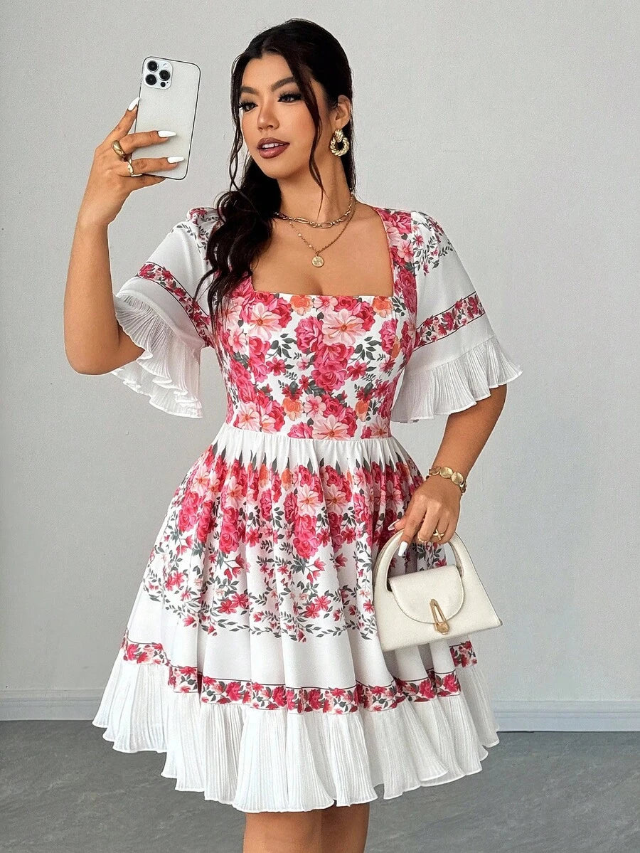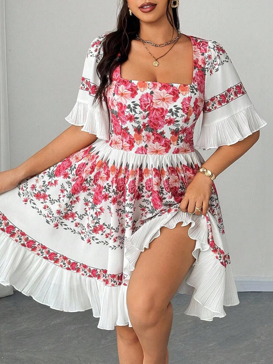 Vestido elegante de mujer talla grande con cuello cuadrado, mangas acampanadas y volantes en el bajo, con estampado floral