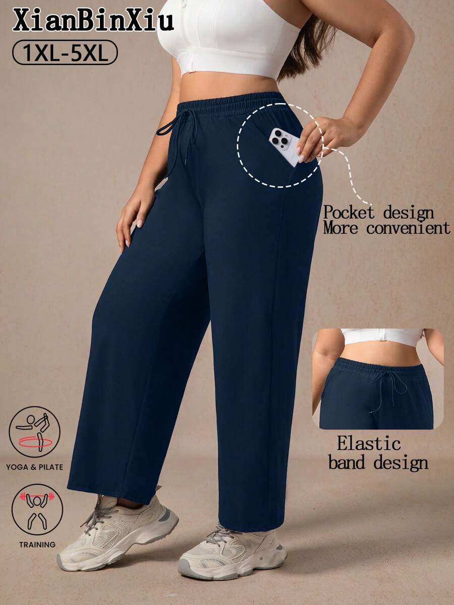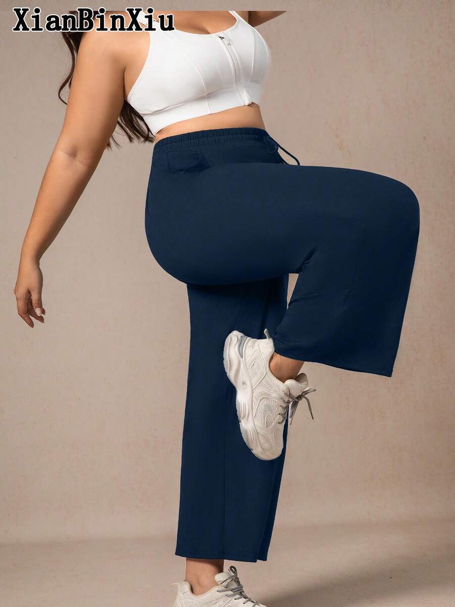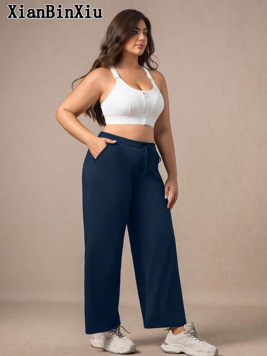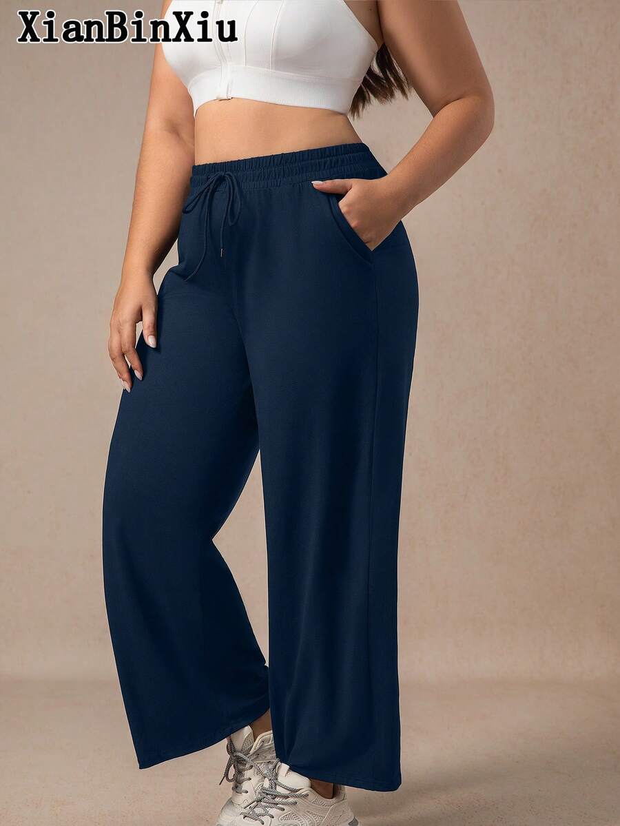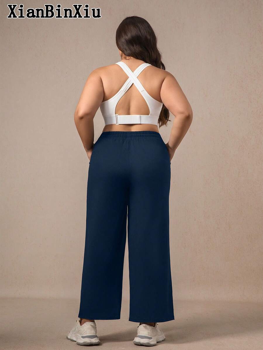 Xianbinxiu 1 pieza pantalones deportivos casuales de pierna recta y ajuste holgado con bolsillos para mujer talla grande, negro y azul marino