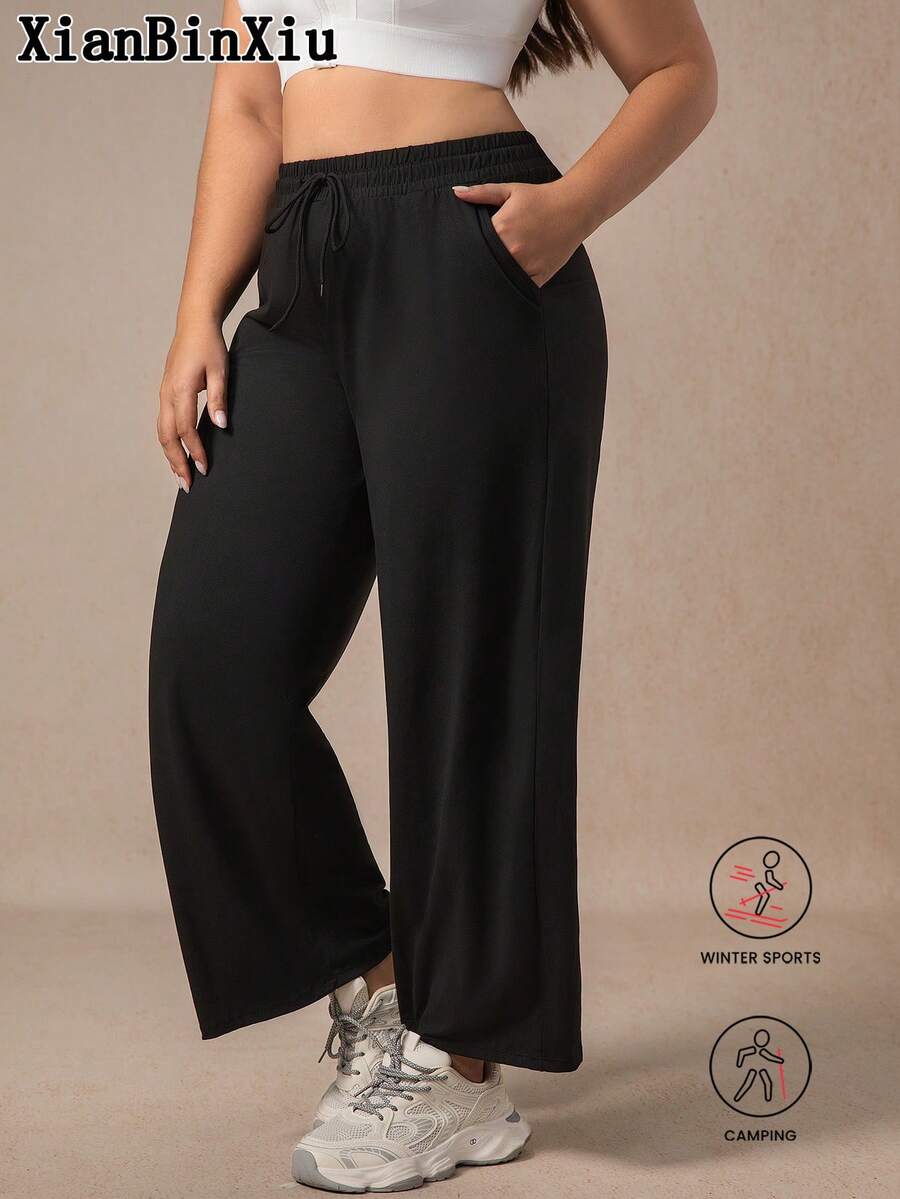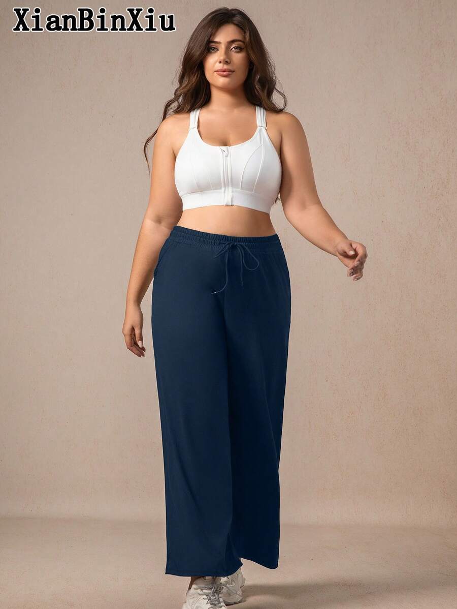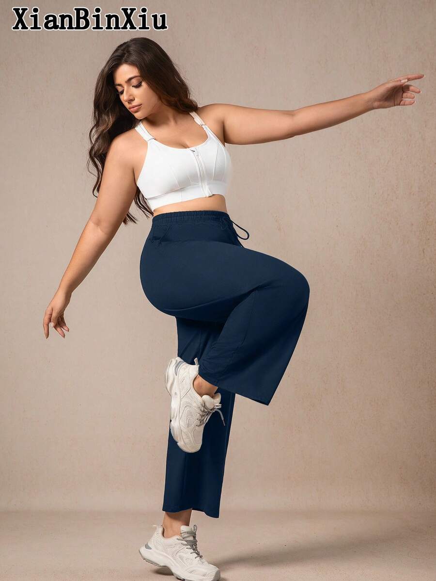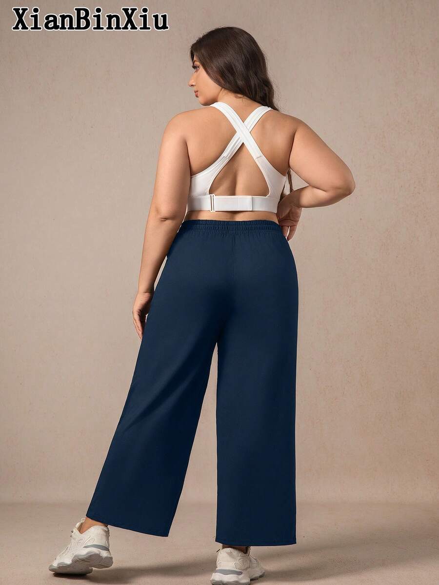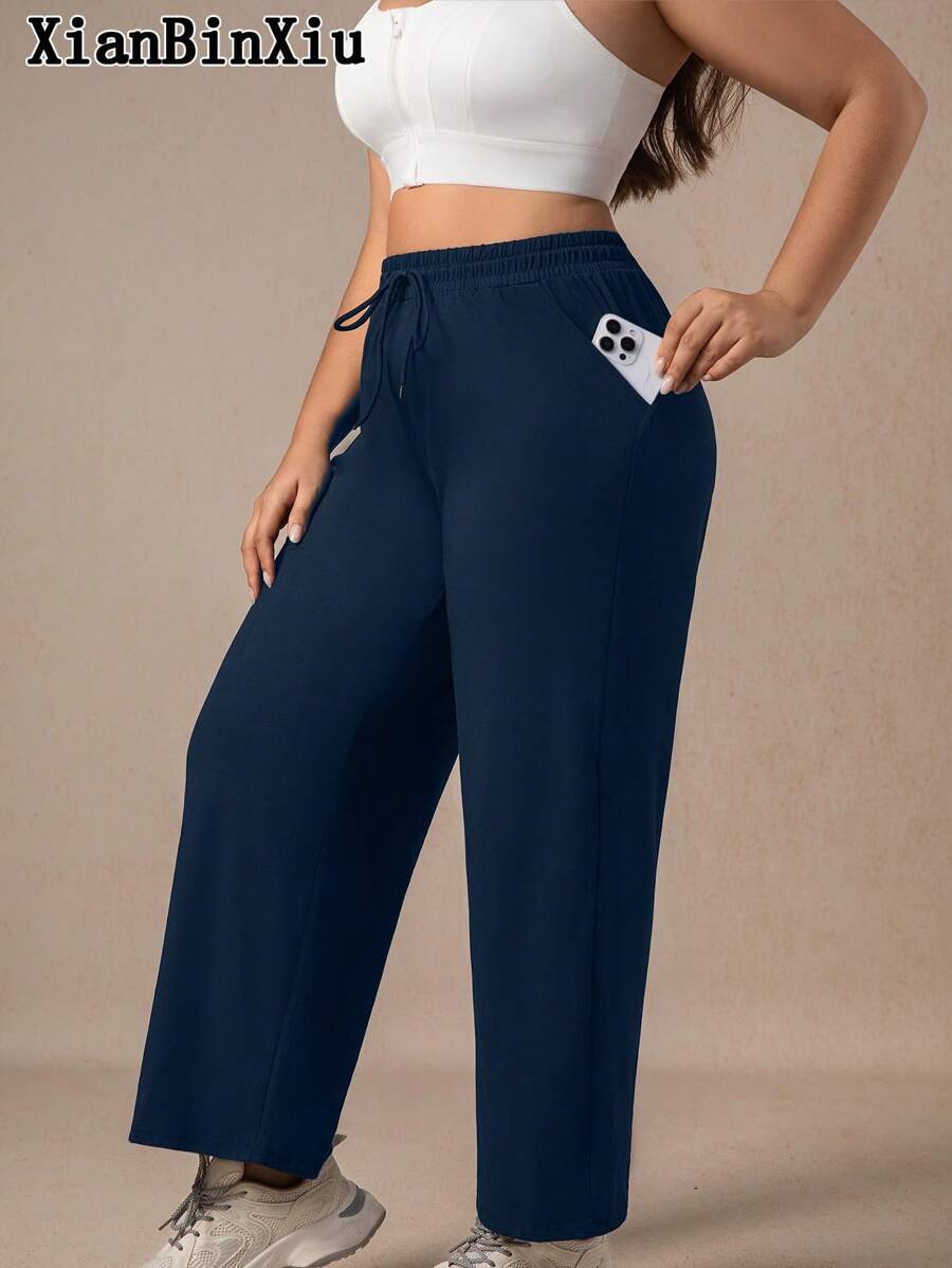 Xianbinxiu 1 pieza pantalones deportivos casuales de pierna recta y ajuste holgado con bolsillos para mujer talla grande, negro y azul marino