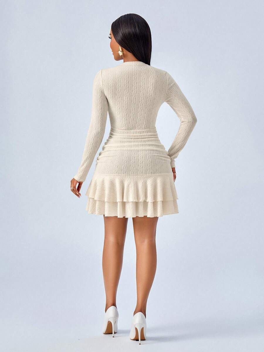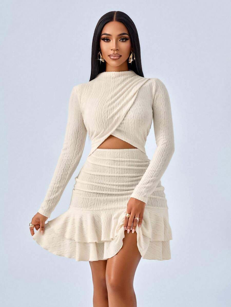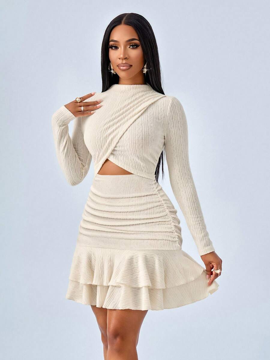 Vestido mini de mujer para otono e invierno, de uso diario y casual, elegante, de tela de jacquard color albaricoque, con cuello alto pequeno, mangas largas, cintura cruzada y envolvente, dobladillo con doble volante hueco