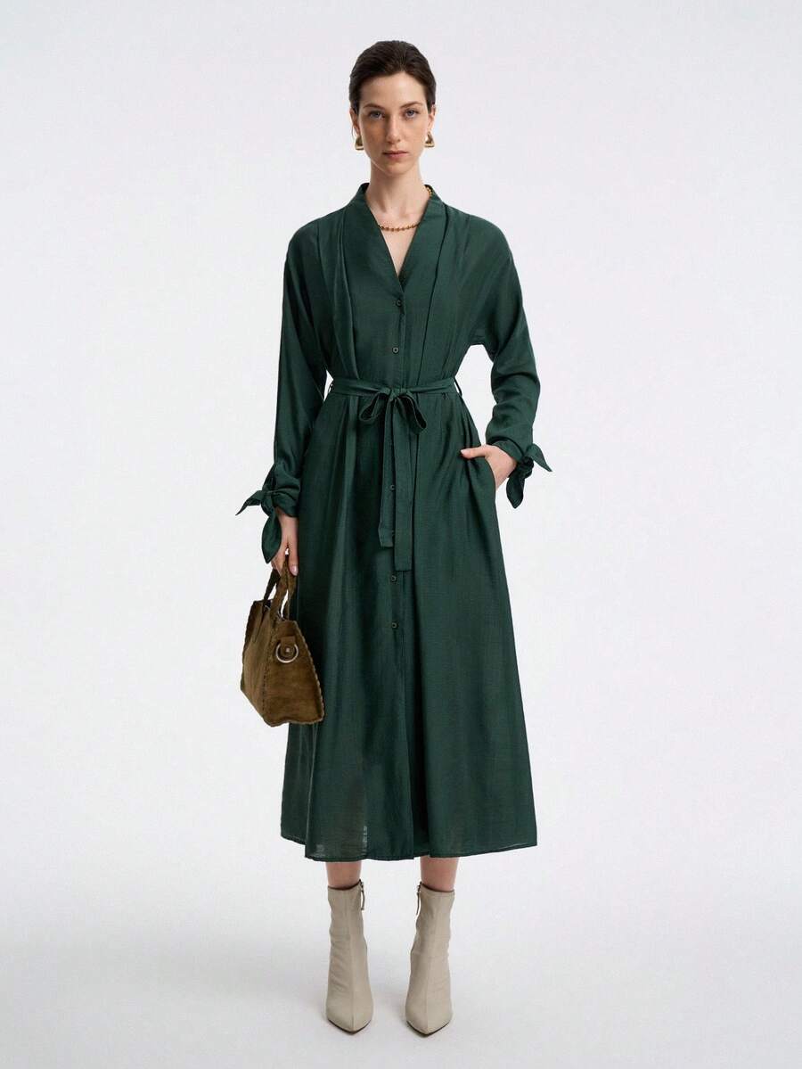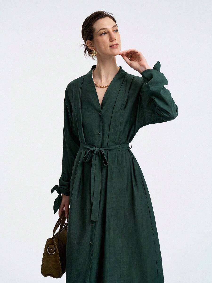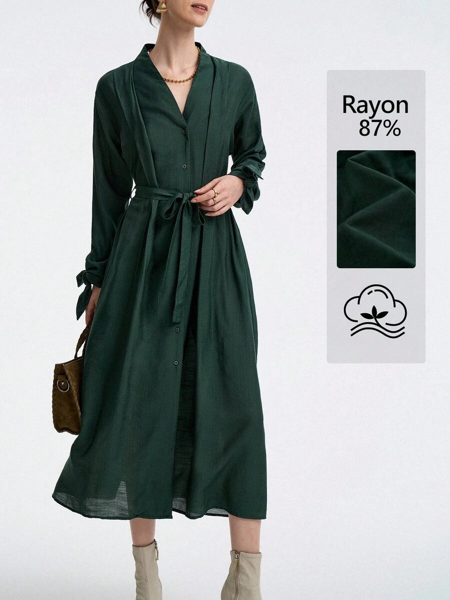 Vestido de mujer con cuello en v, manga larga, volante en los hombros, cintura con lazo y punos con botones, elegante y versatil para la oficina o las vacaciones, adecuado para primavera, otono e invierno