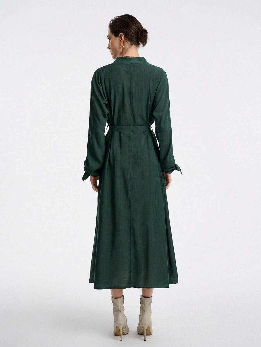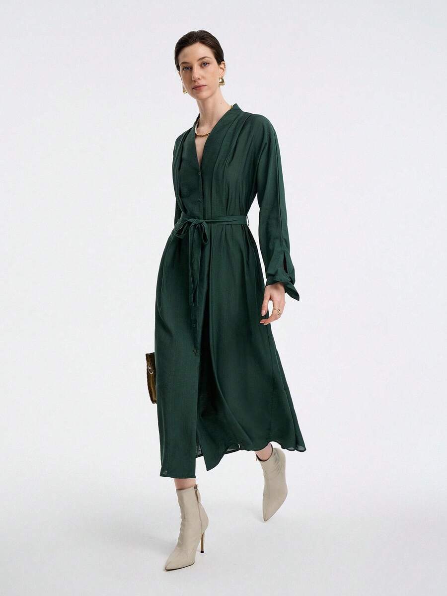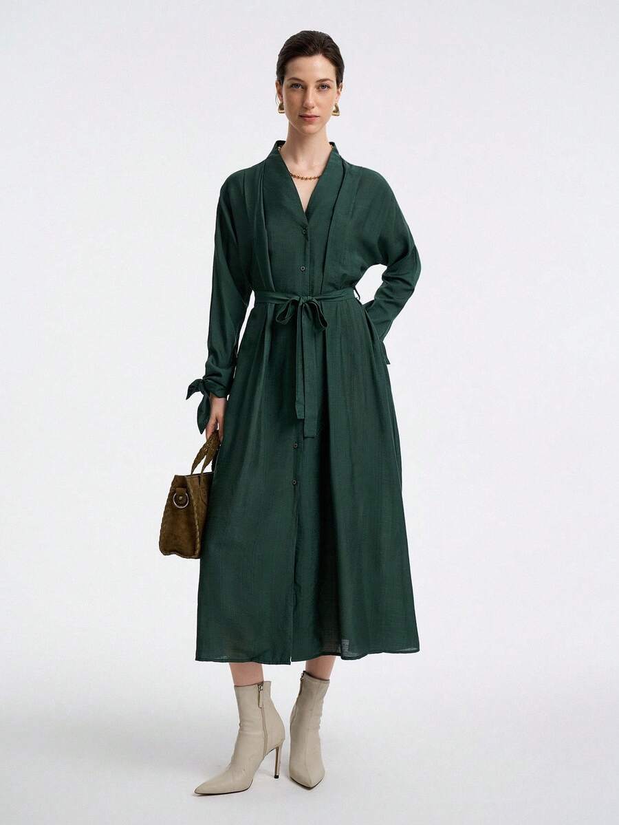 Vestido de mujer con cuello en v, manga larga, volante en los hombros, cintura con lazo y punos con botones, elegante y versatil para la oficina o las vacaciones, adecuado para primavera, otono e invierno