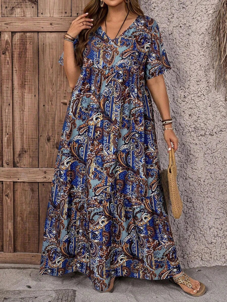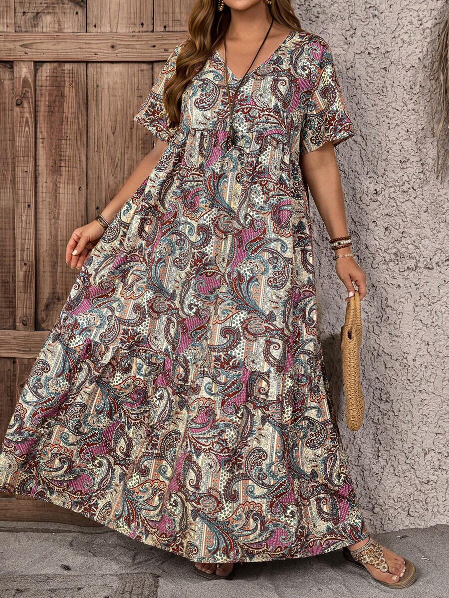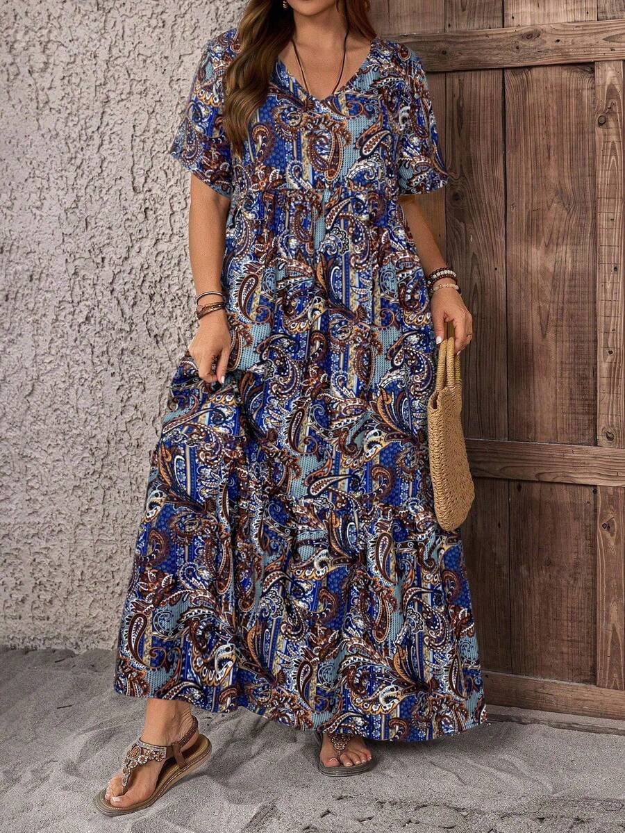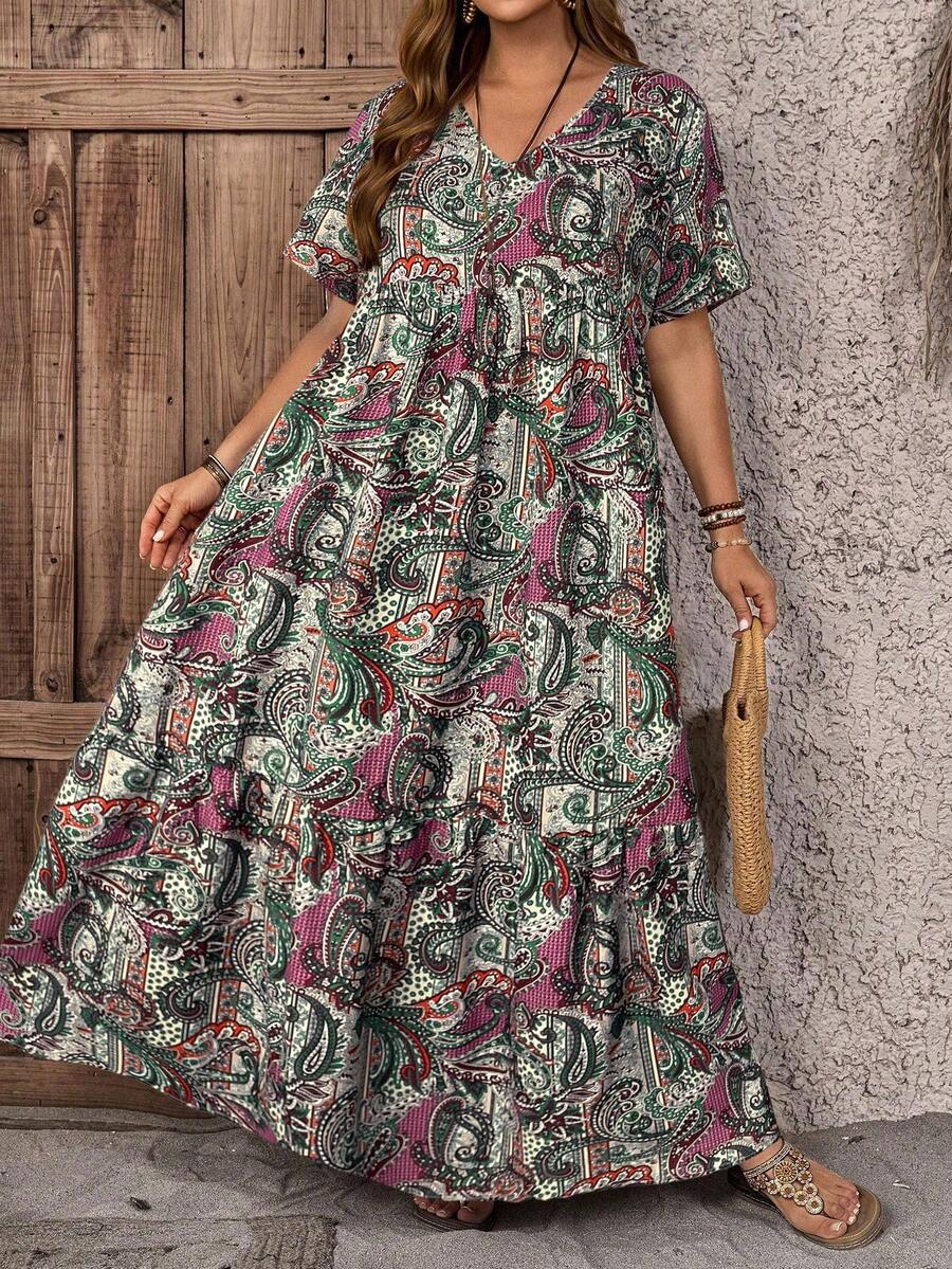 Vestido largo casual y holgado con estampado de plantas y cuello en v para tallas grandes, atuendo casual de campo y vacaciones para mujer, sencillo y de moda para uso diario, blusas de verano para mujer, conjuntos de verano para mujer