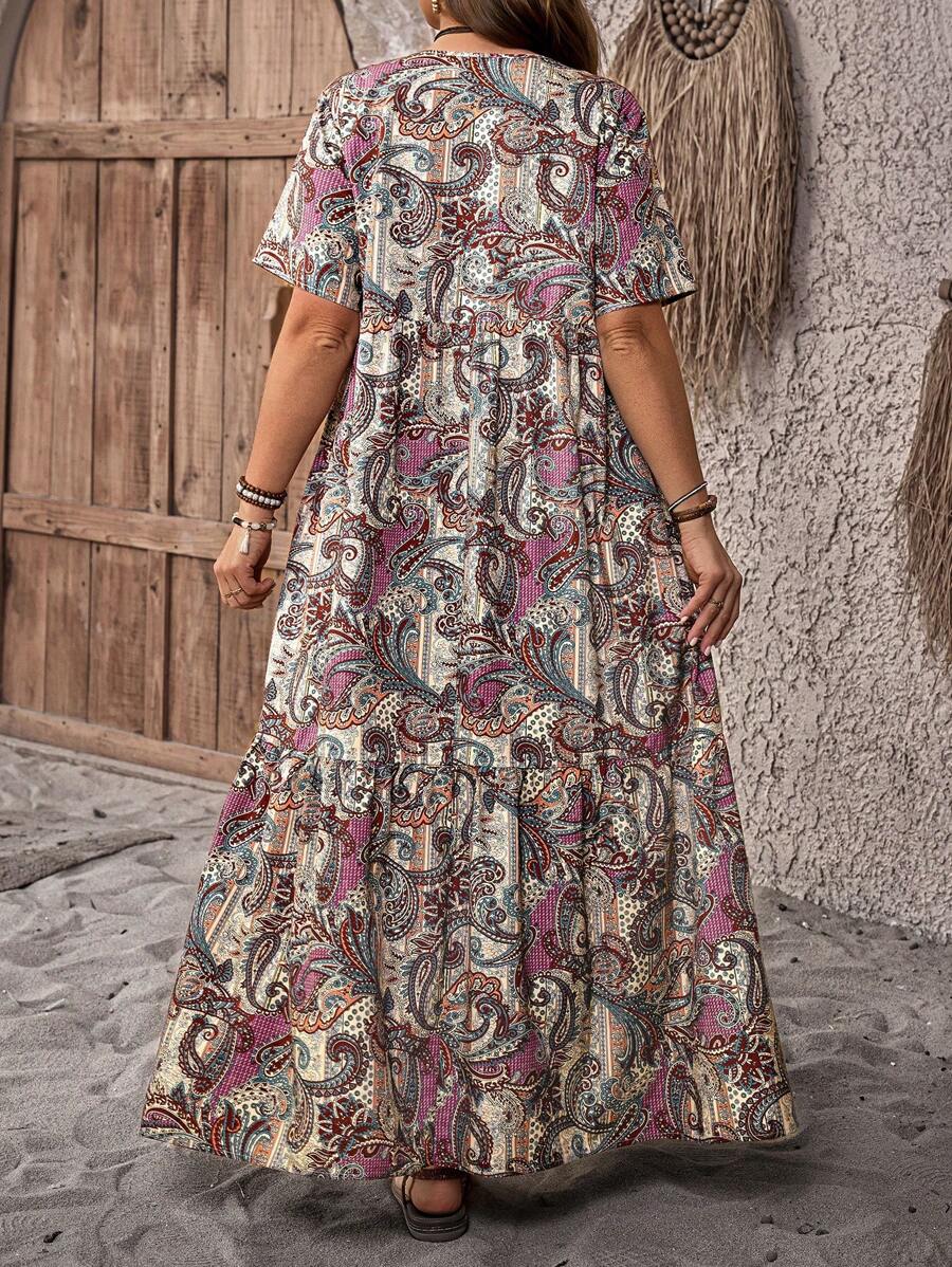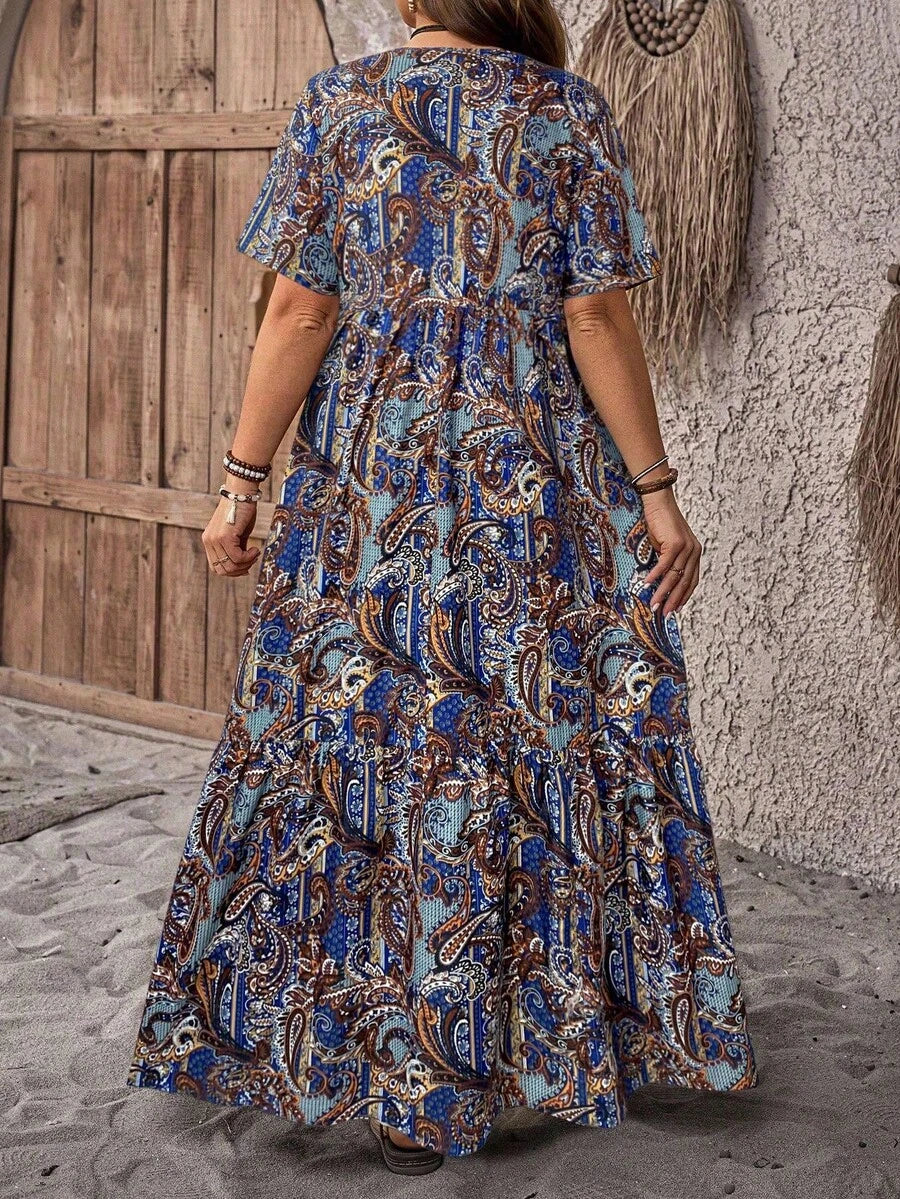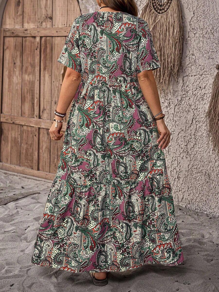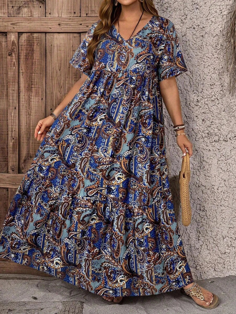 Vestido largo casual y holgado con estampado de plantas y cuello en v para tallas grandes, atuendo casual de campo y vacaciones para mujer, sencillo y de moda para uso diario, blusas de verano para mujer, conjuntos de verano para mujer