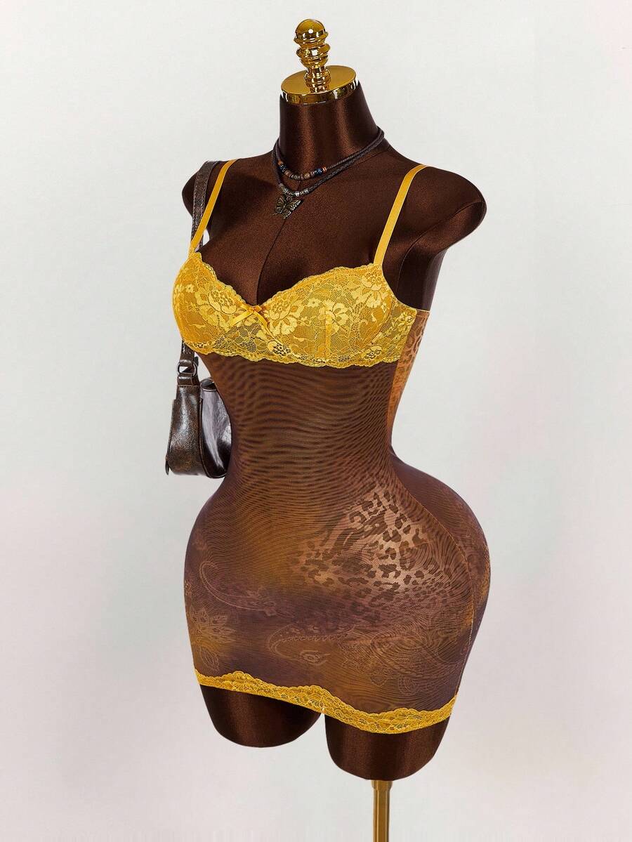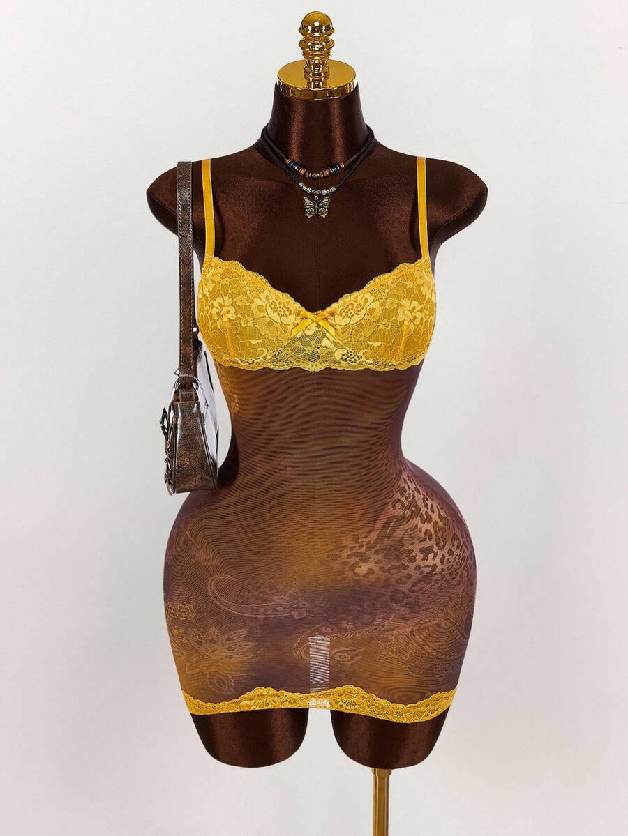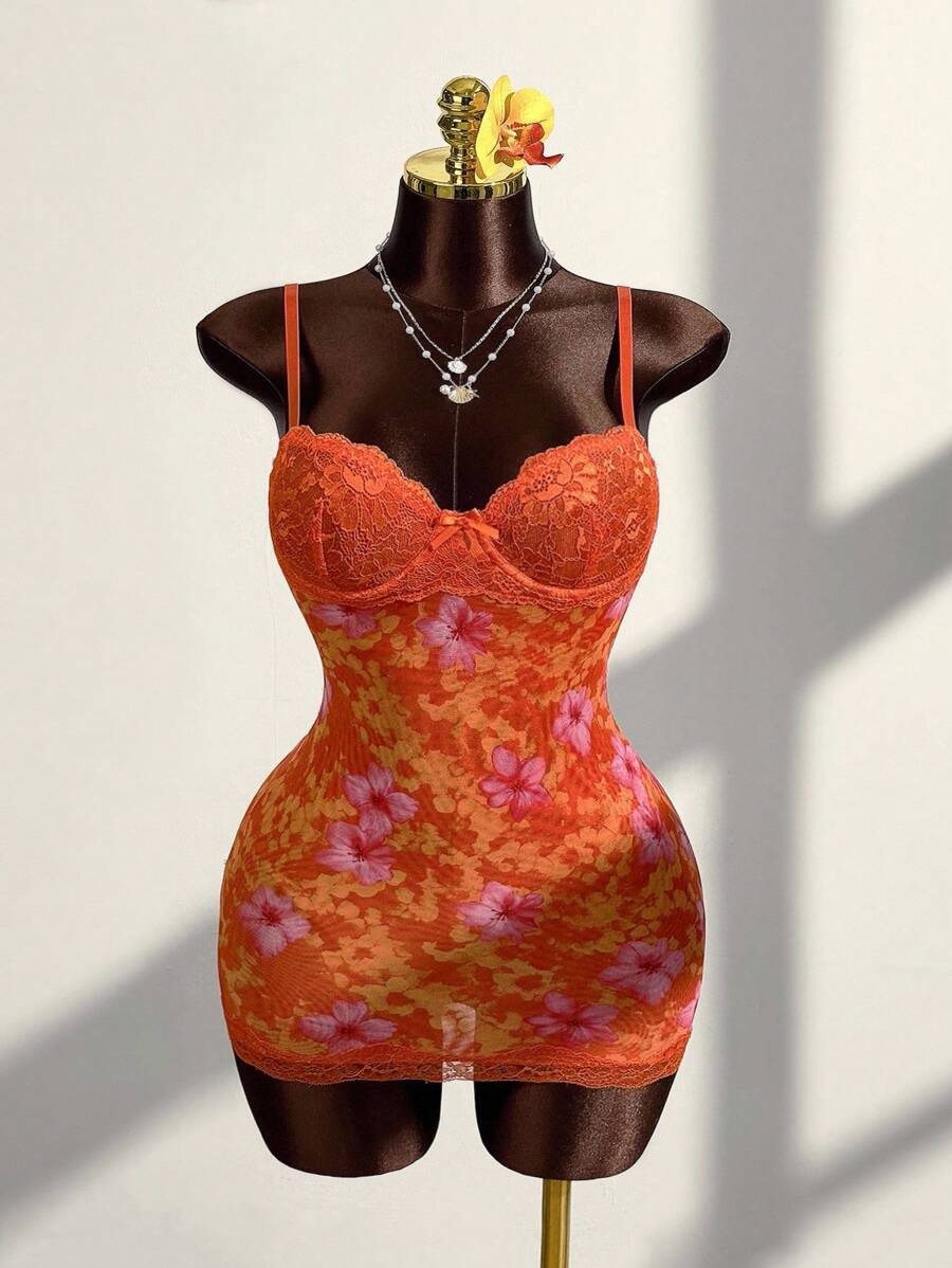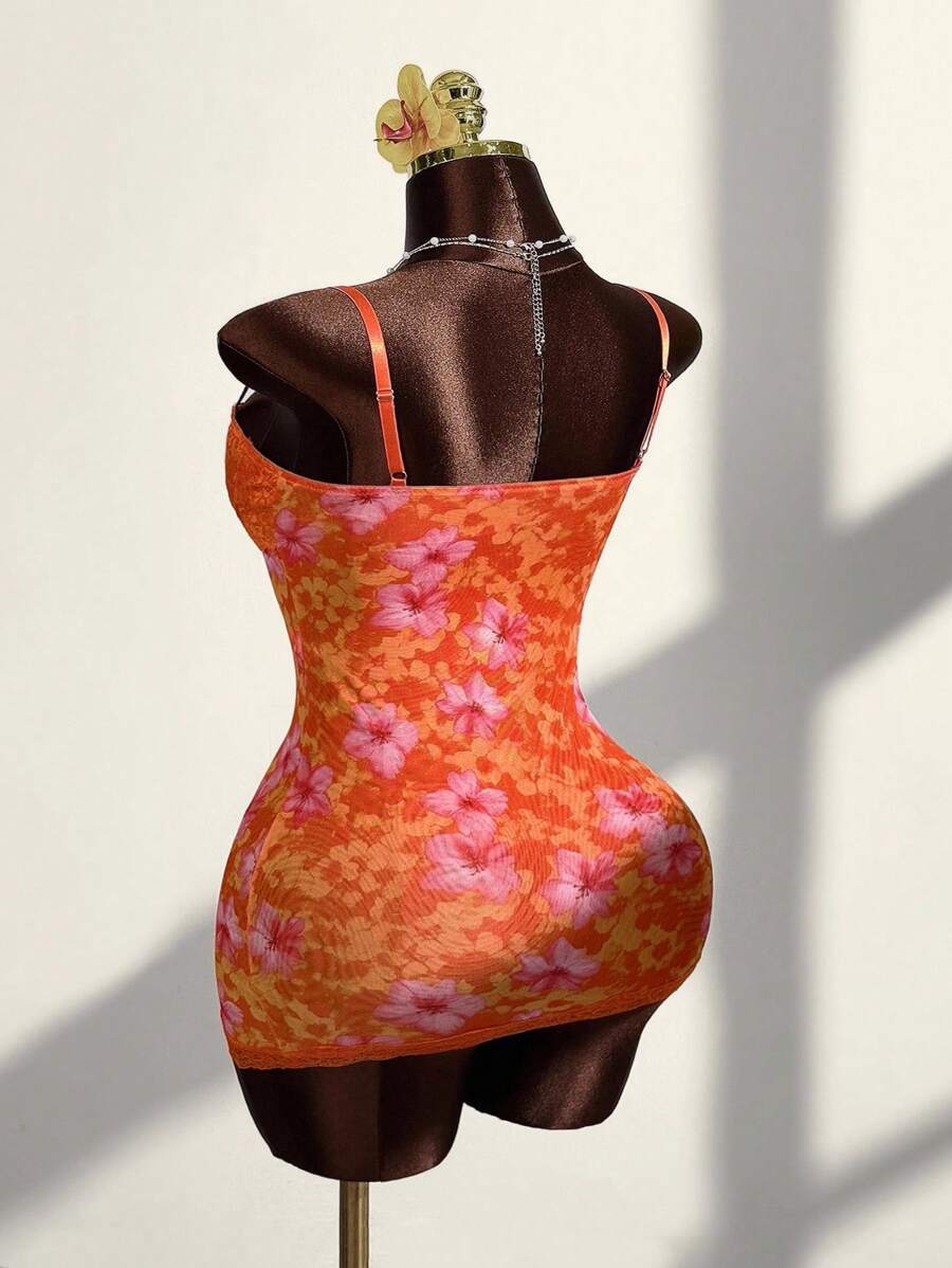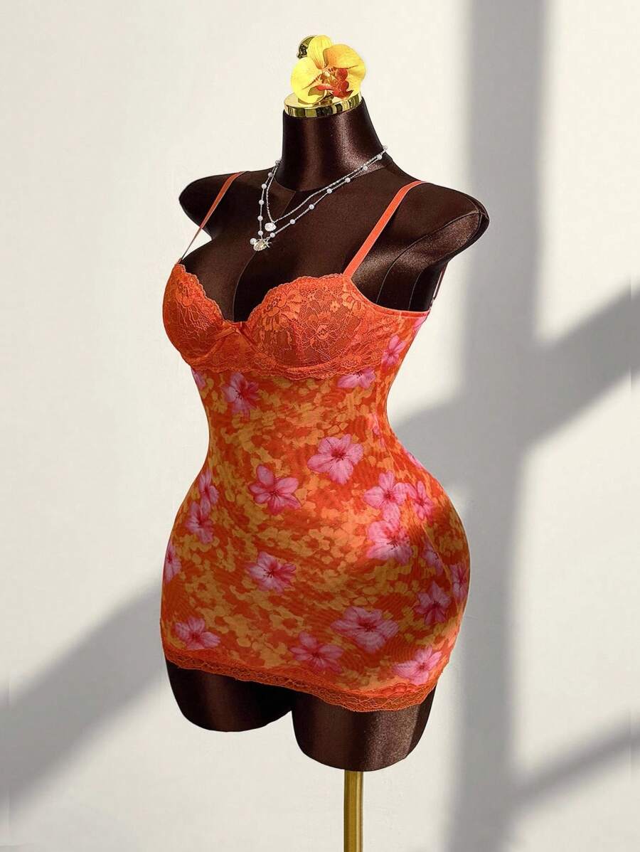 Amplova vestido mini ajustado de malla con detalles de encaje y estampado floral tropical para mujer de talla grande