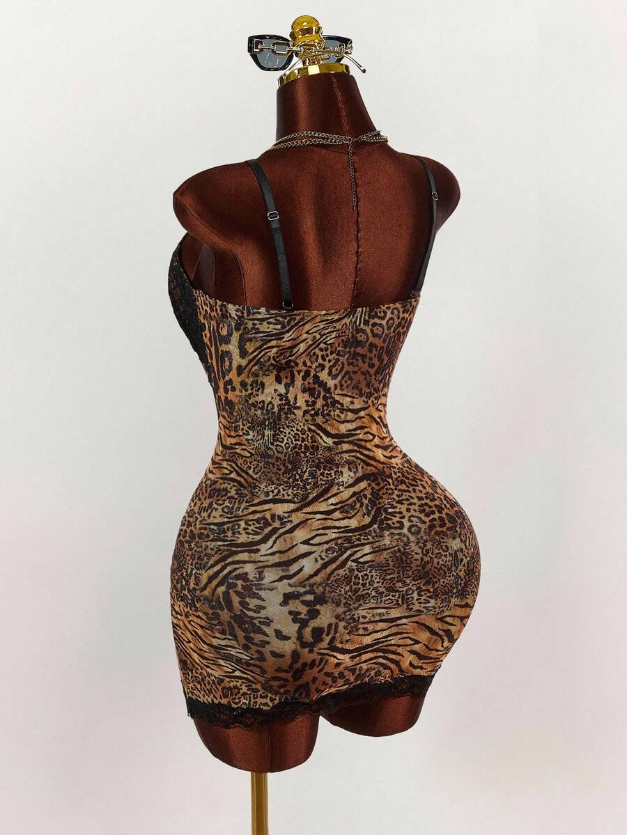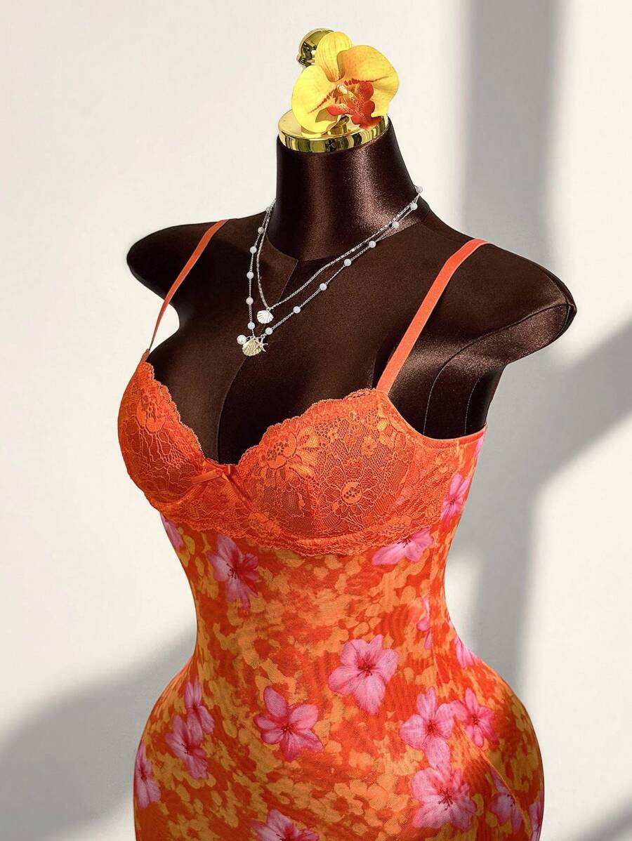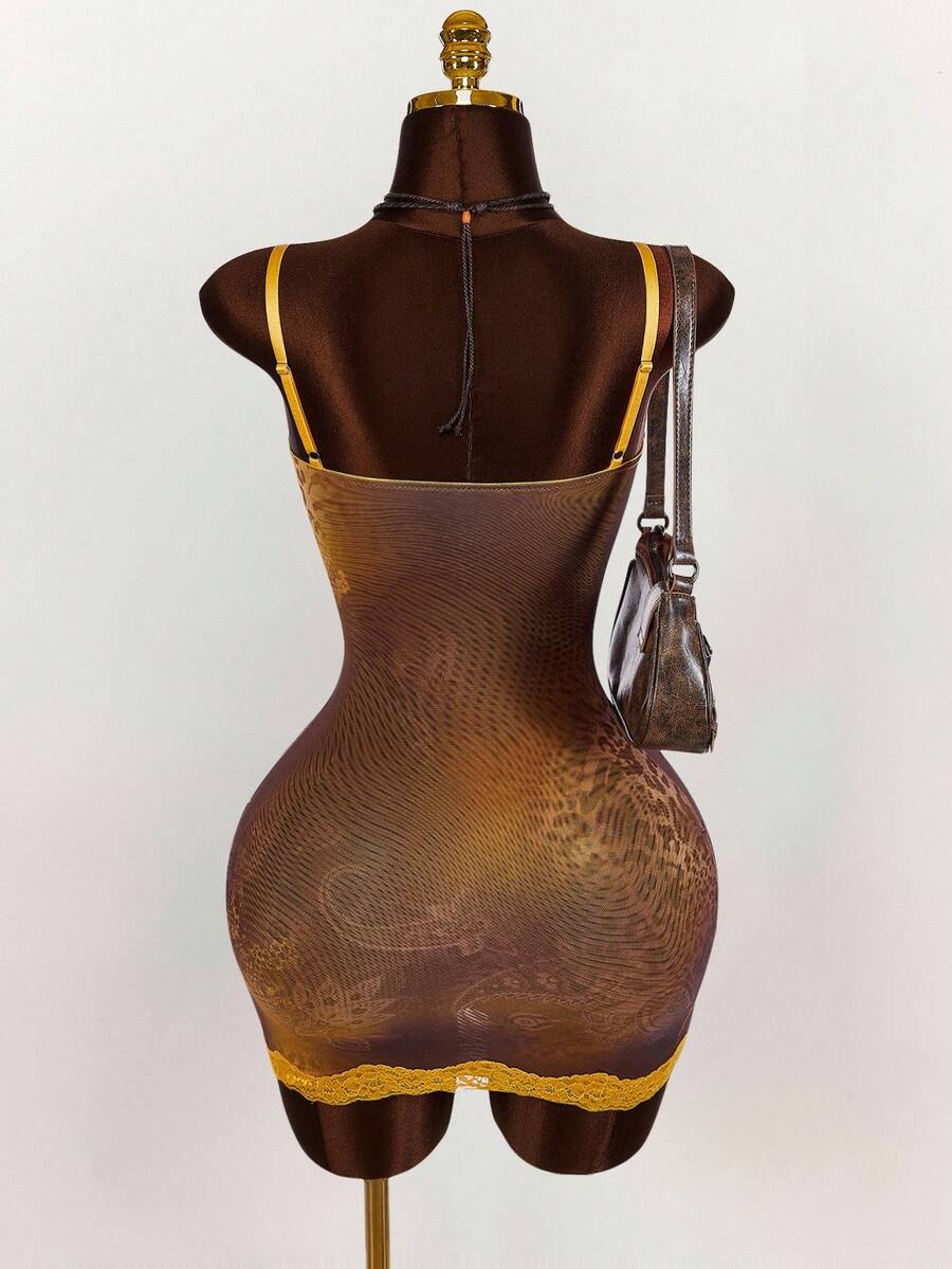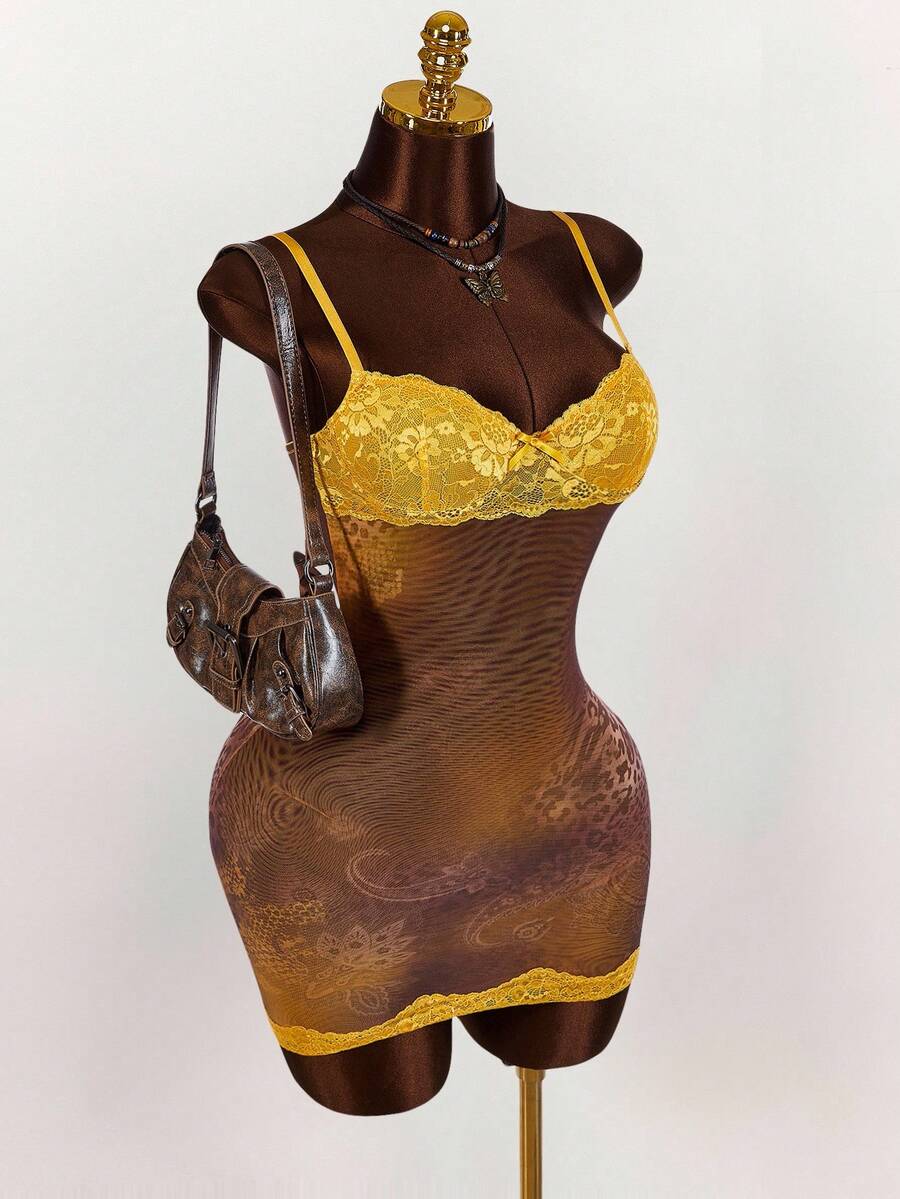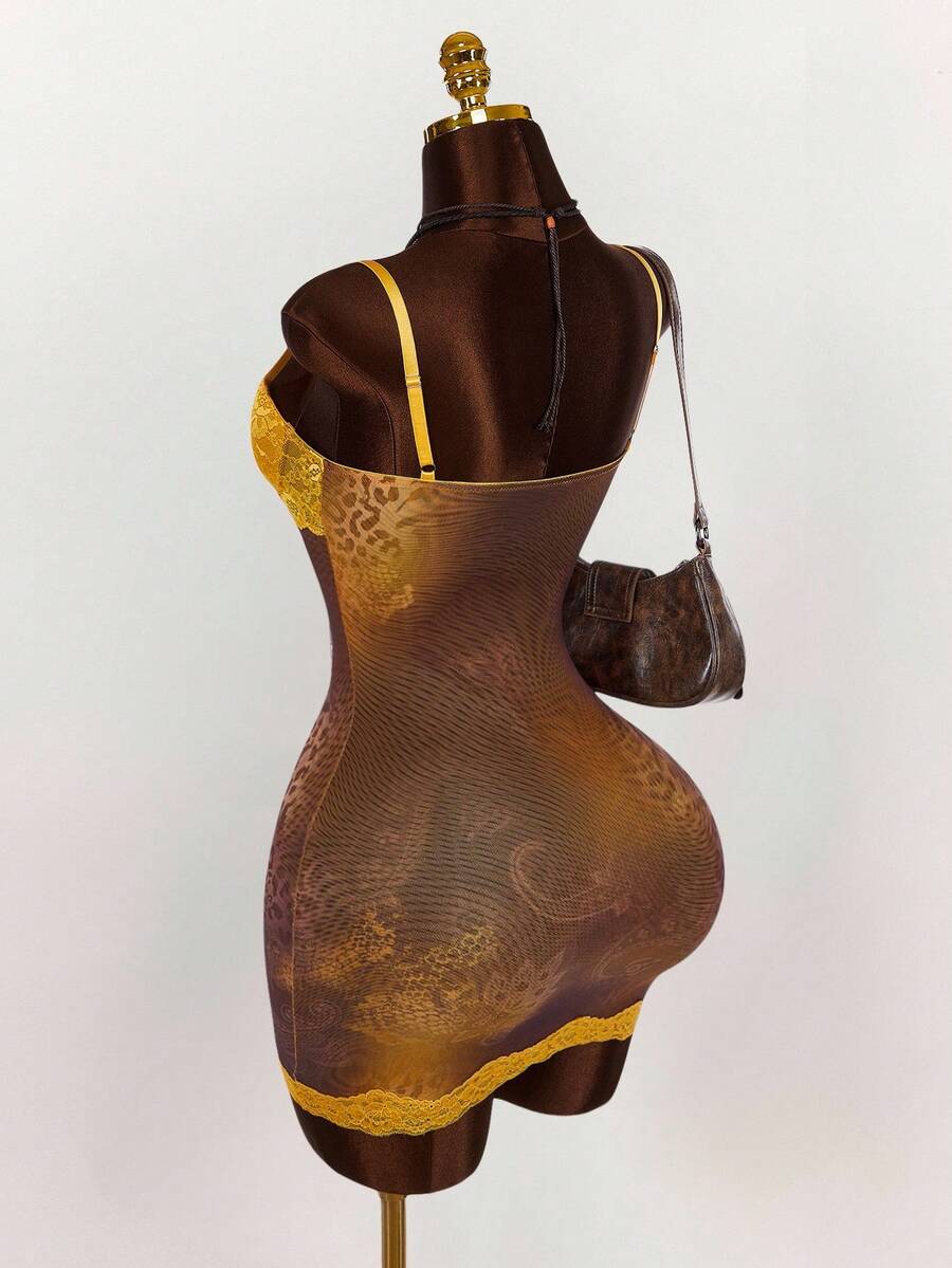 Amplova vestido mini ajustado de malla con detalles de encaje y estampado floral tropical para mujer de talla grande