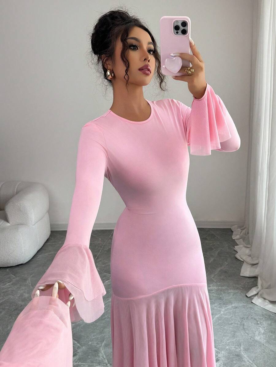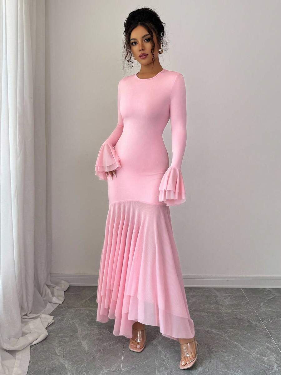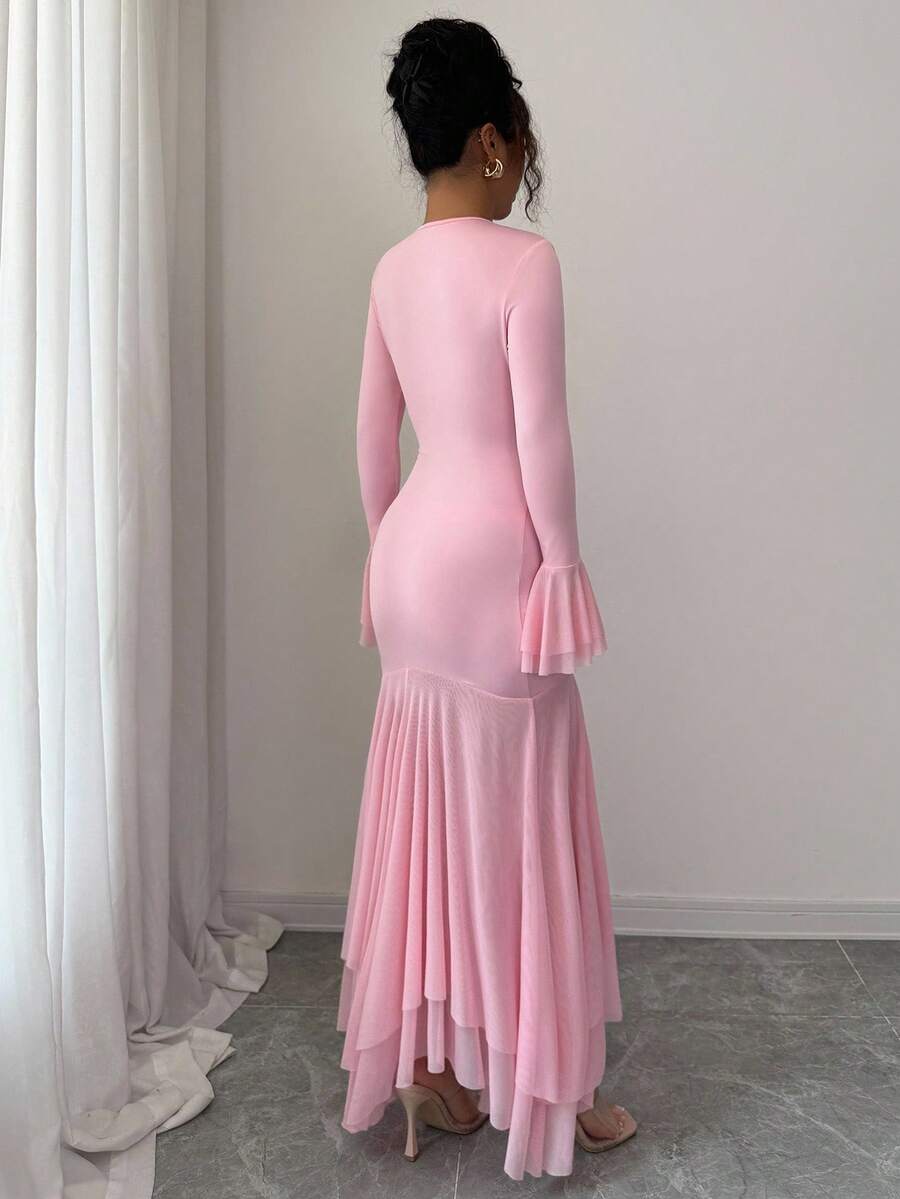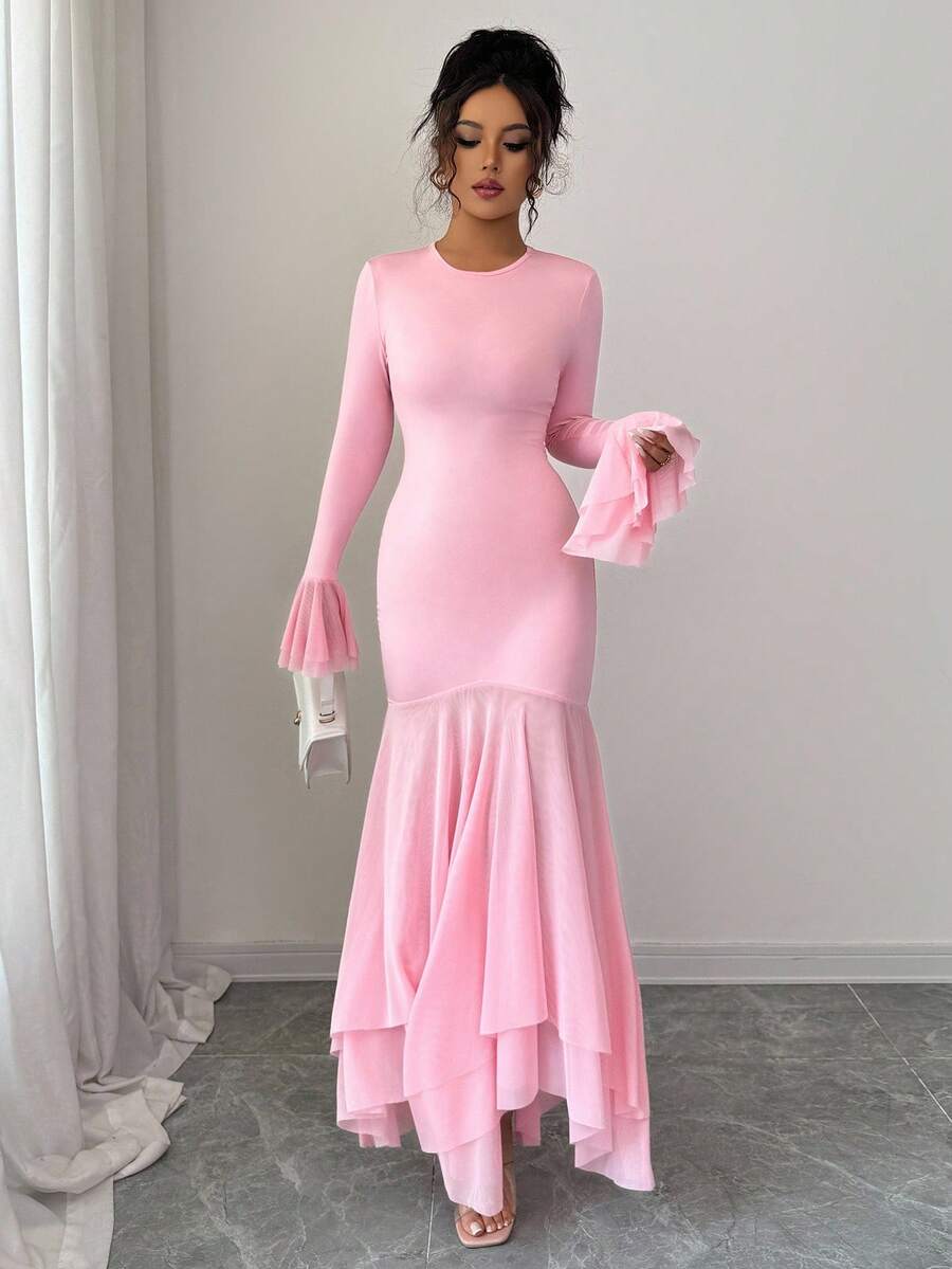 Vestido de manga larga elegante para mujer, diseno de bajo asimetrico, cintura cenida para una silueta favorecedora, rosa, otono/invierno